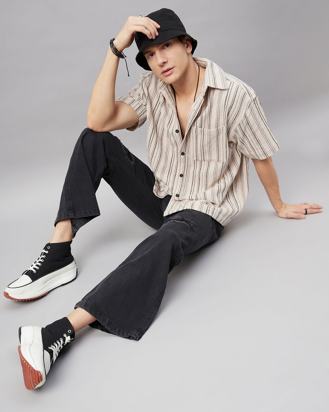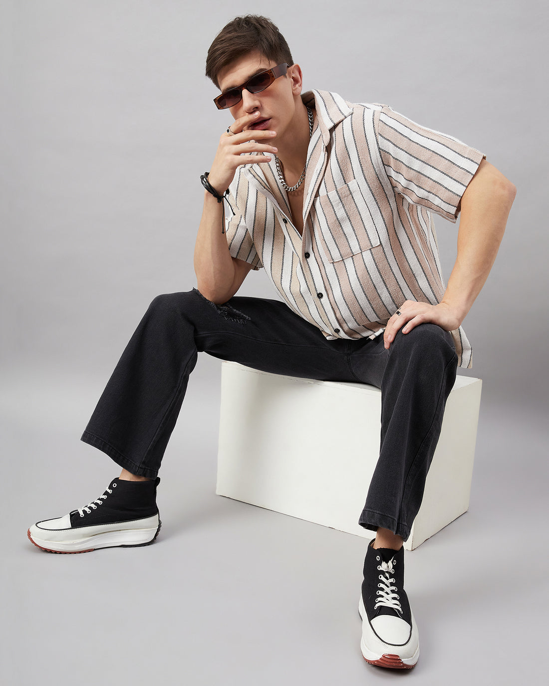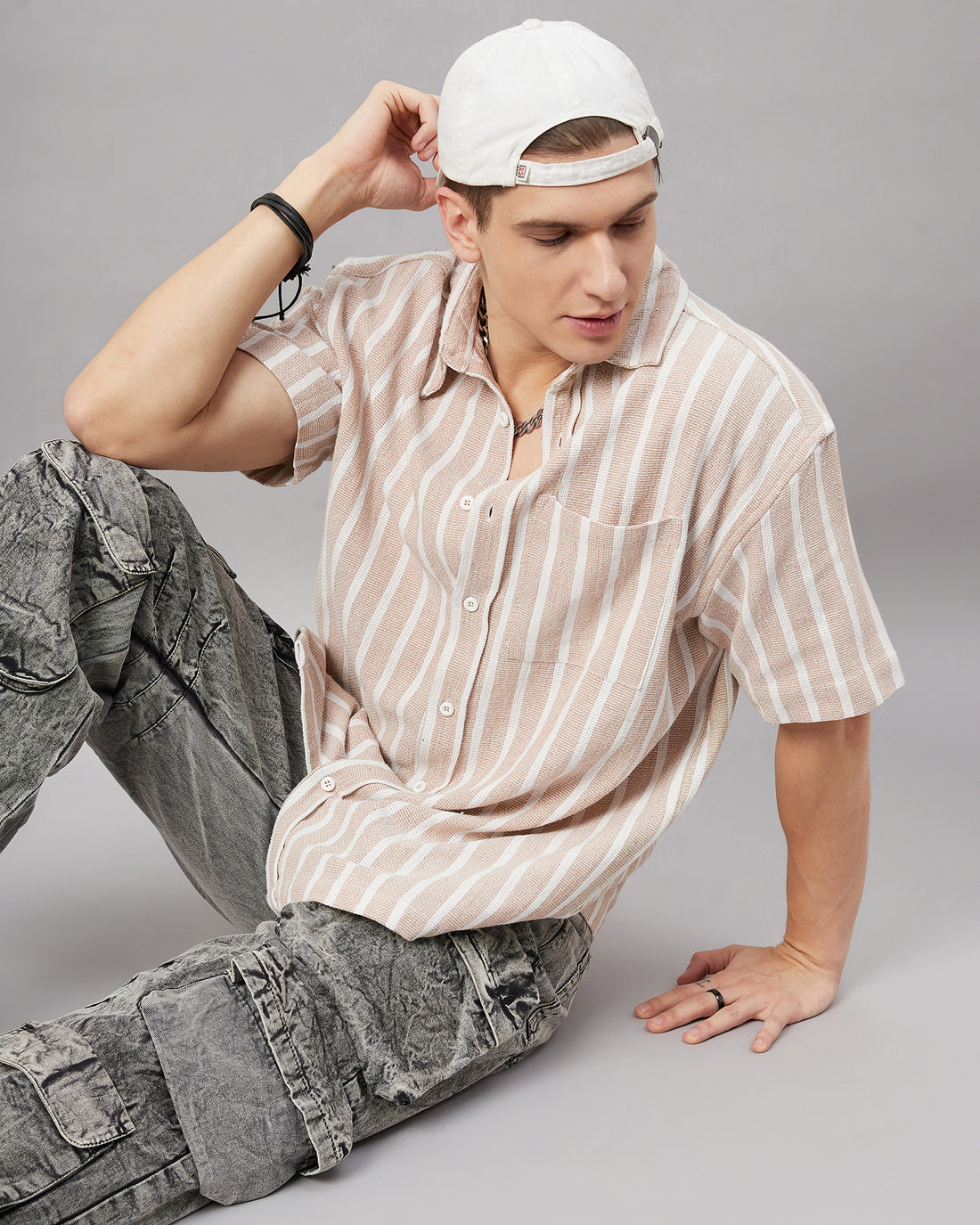 Chimpaaanzee Men Beige & White Oversized Fit Shirt