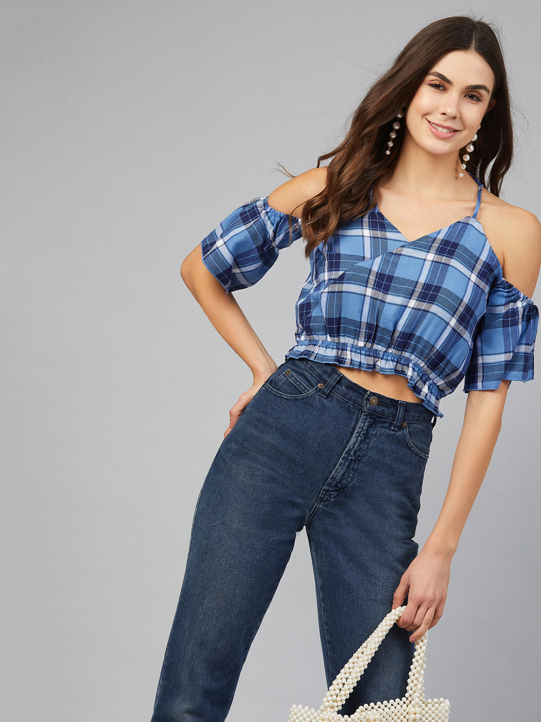 Chimpaaanzee Women Blue Checks Cold Shoulde Crop Top