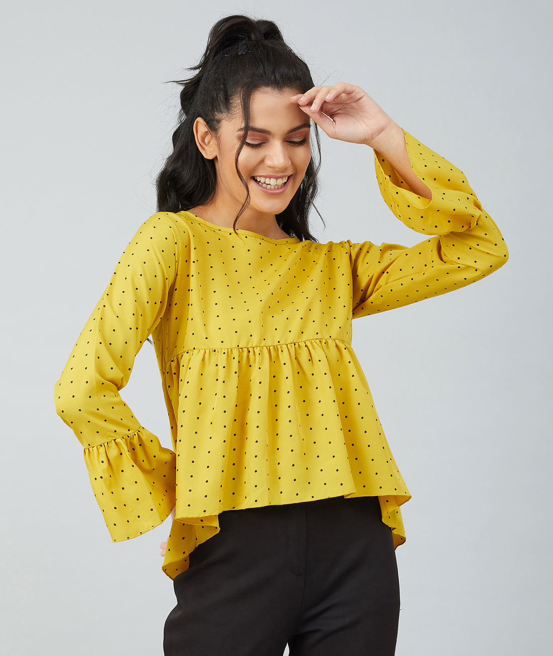 Chimpaaanzee women Mustard Crepe Polka Doted Full Sleeve Top
