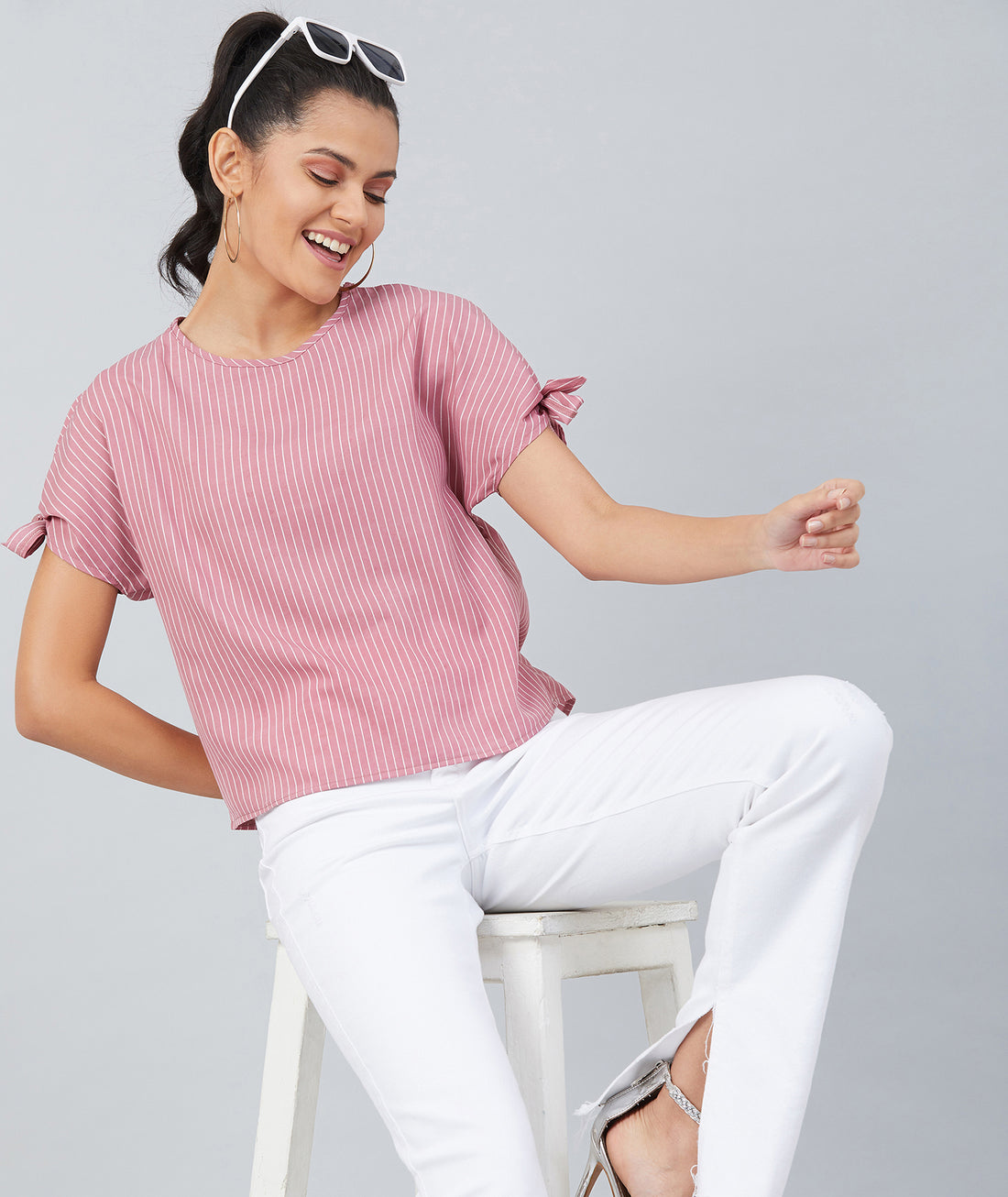 Chimpaaanzee Women Pink Crepe Stripe Knotted Sleeve Top