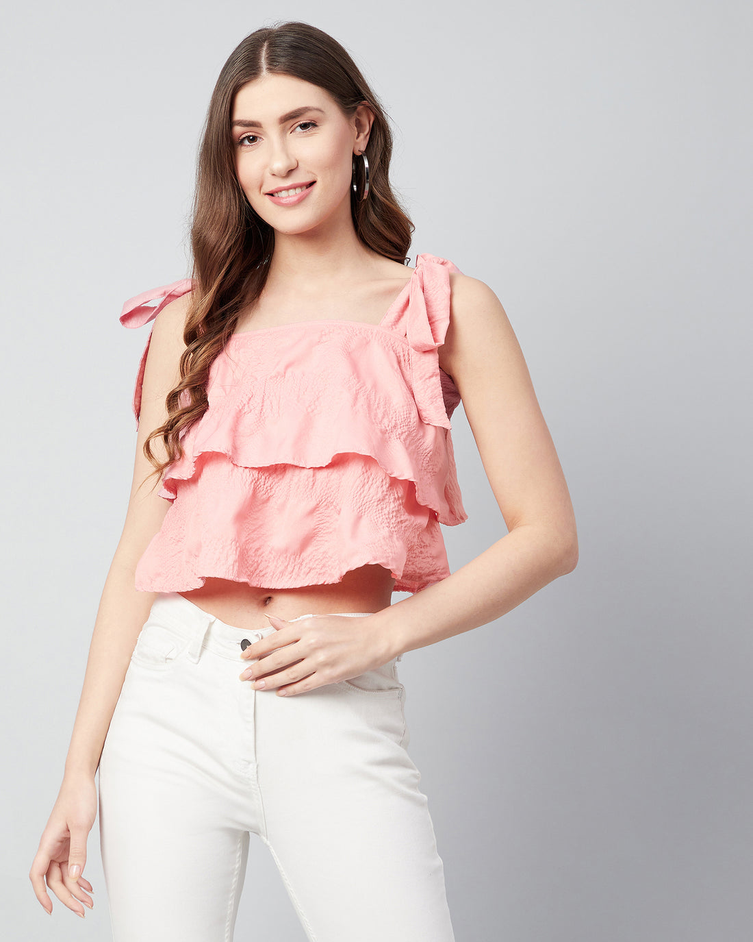 Chimpaaanzee Women Pink Double Layered Shoulder Knoted Crop Top