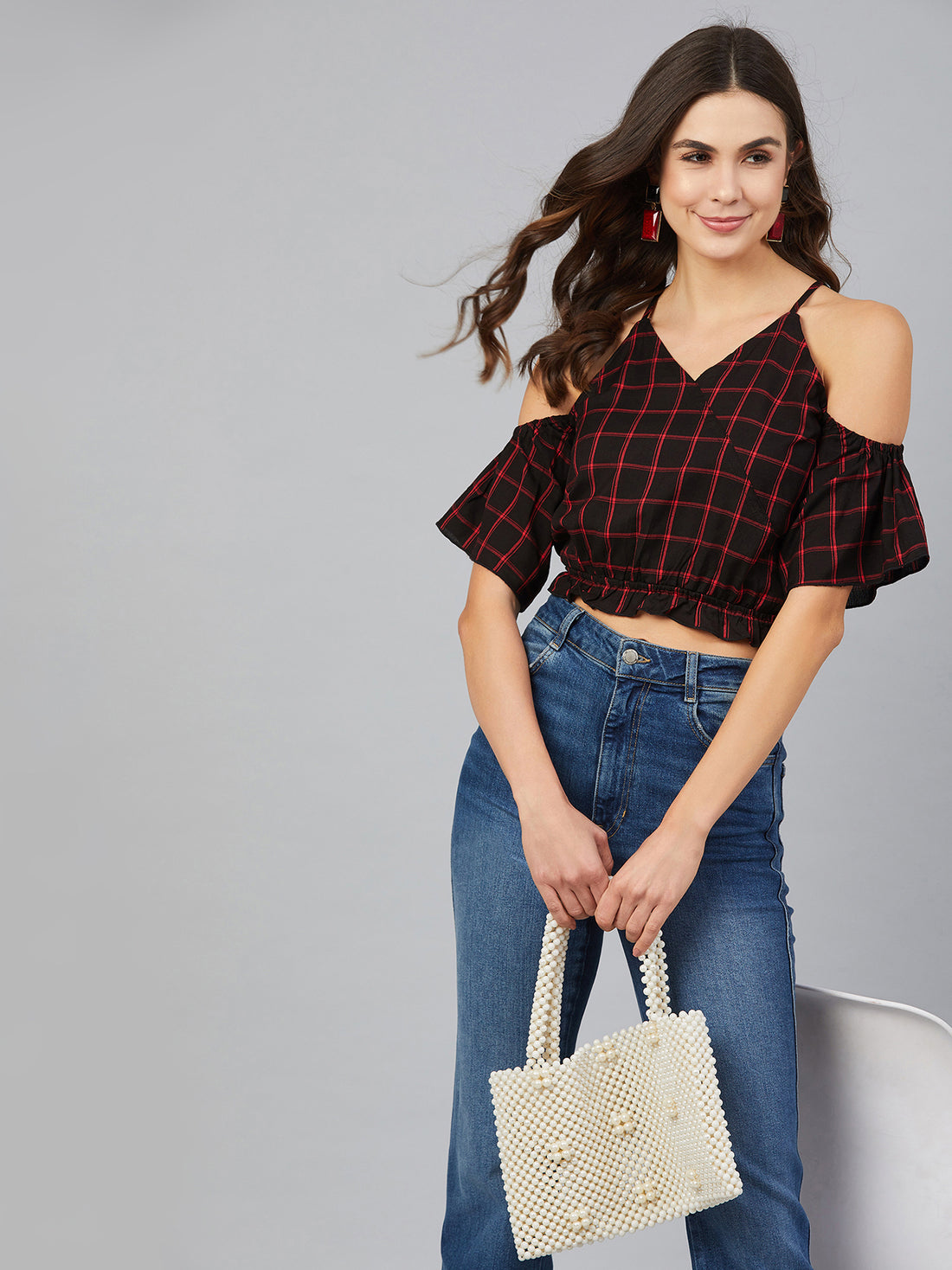Chimpaaanzee Women Red and Black Checks Cold Shoulder Top