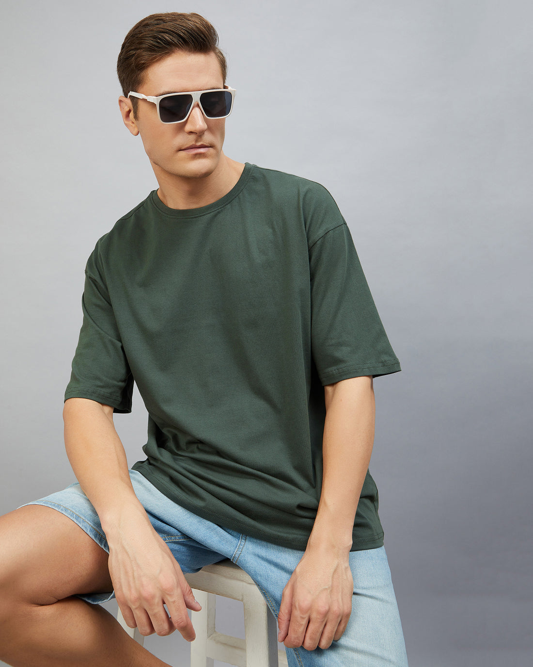 Chimpaaanzee Men Cotton Dark Green Solid Oversize Fit T-shirt