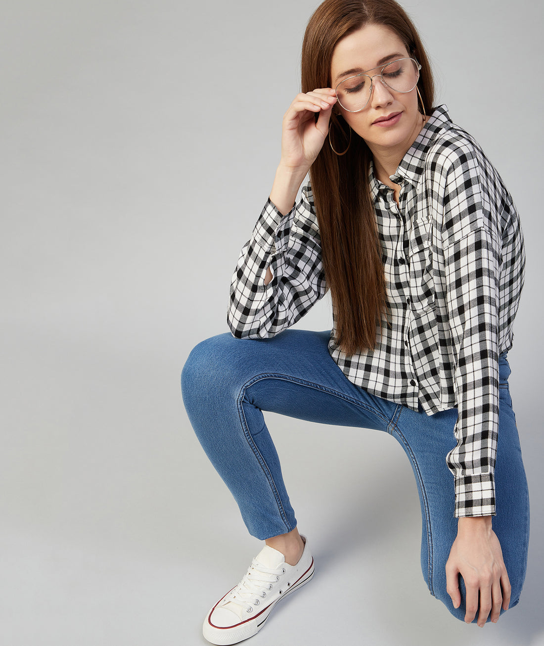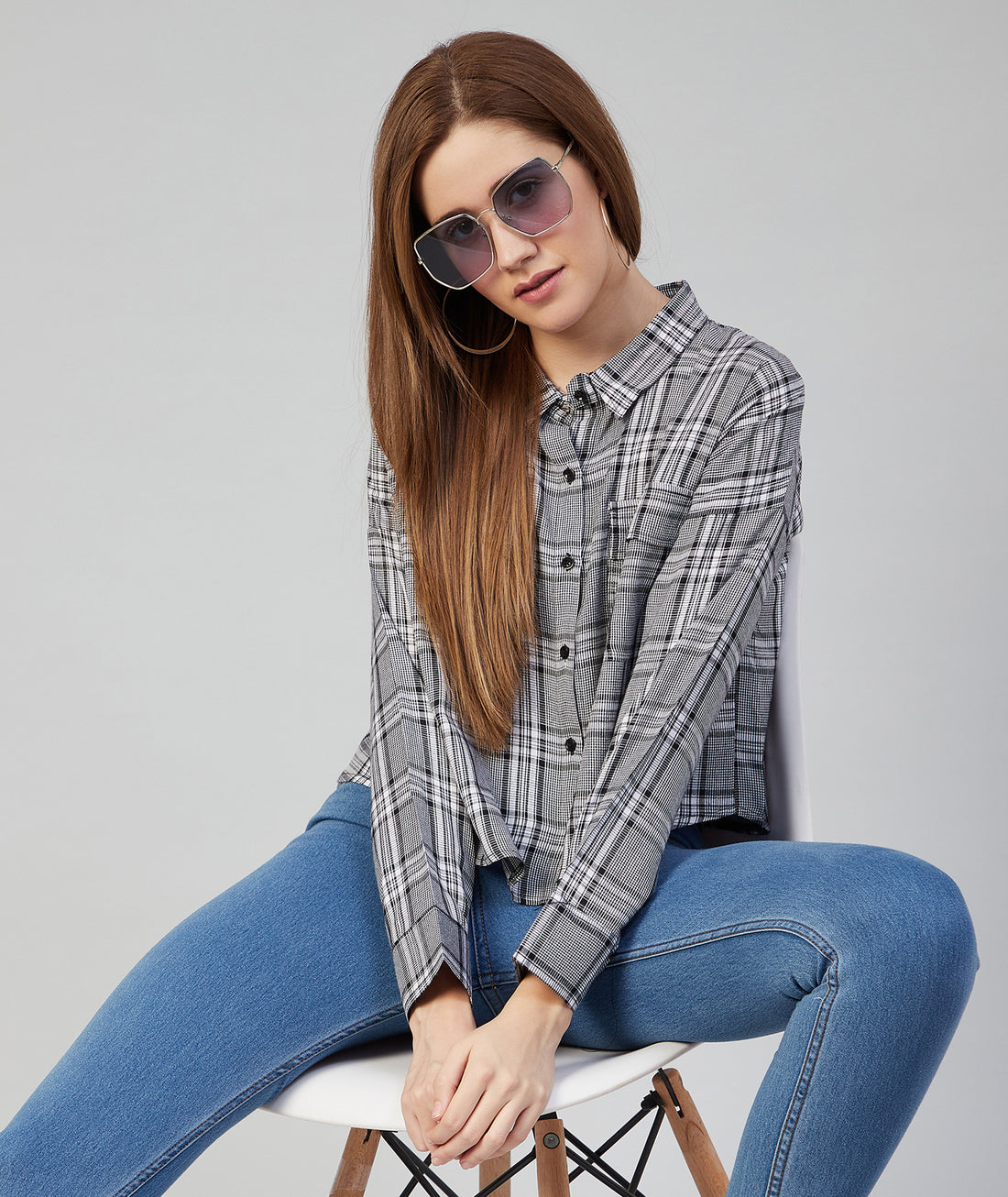 Chimpaaanzee Women Viscose Black and White Checkered Crop Shirt