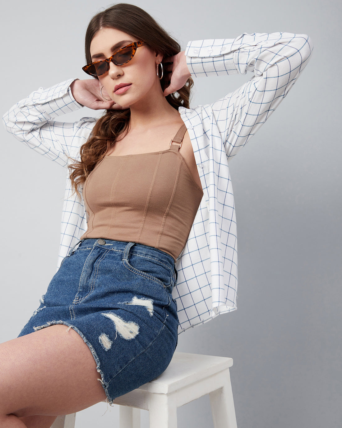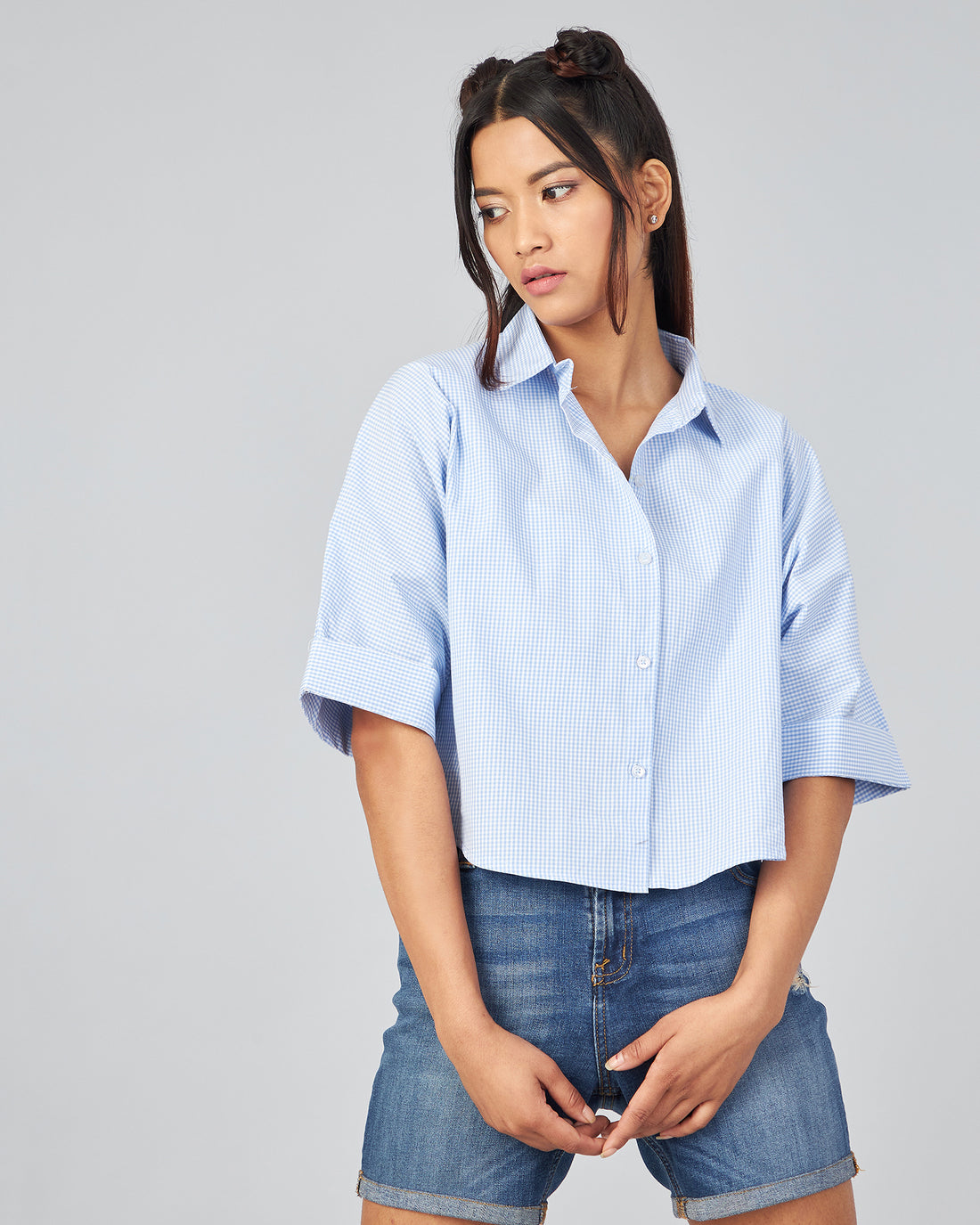 Chimpaaanzee Women Viscose Blue & White Checkered Crop Shirt