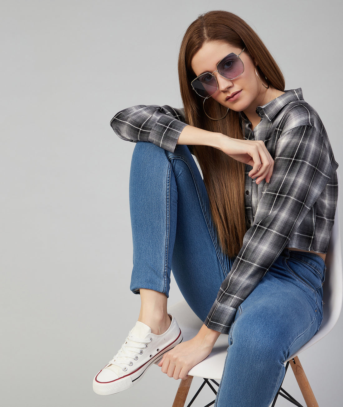 Chimpaaanzee Women Viscose Grey Checkered Full Sleeve Crop Shirt
