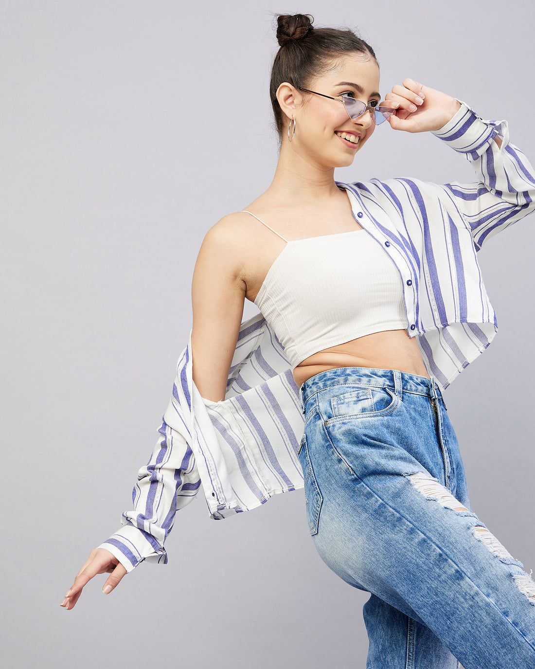 Chimpaaanzee Women Viscose Navy & White Striped Fully Crop Shirt