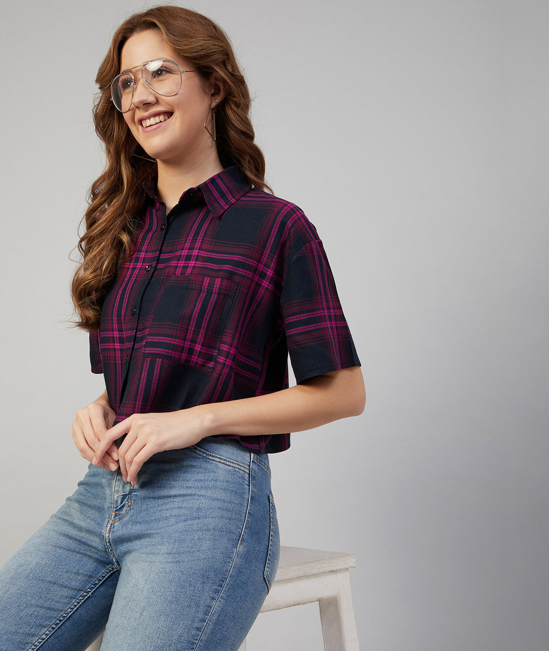 Chimpaaanzee Women Viscose Navy & Pink Checkered Half Sleeve Crop Shirt