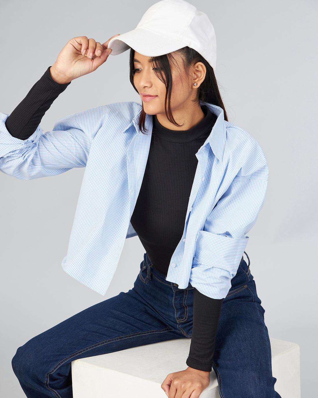 Chimpaaanzee Women Viscose White and Black Checks Fully Cropped Shirt