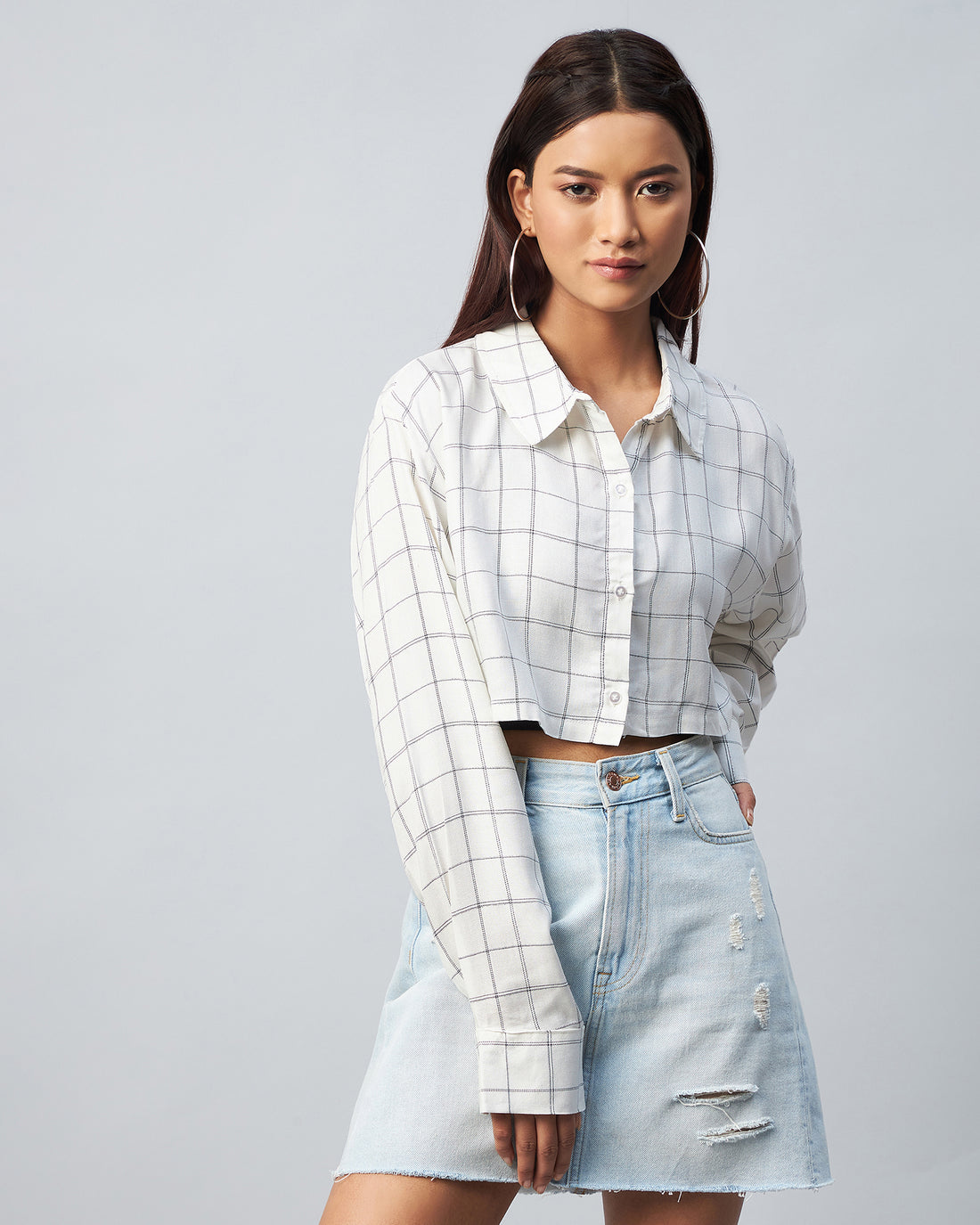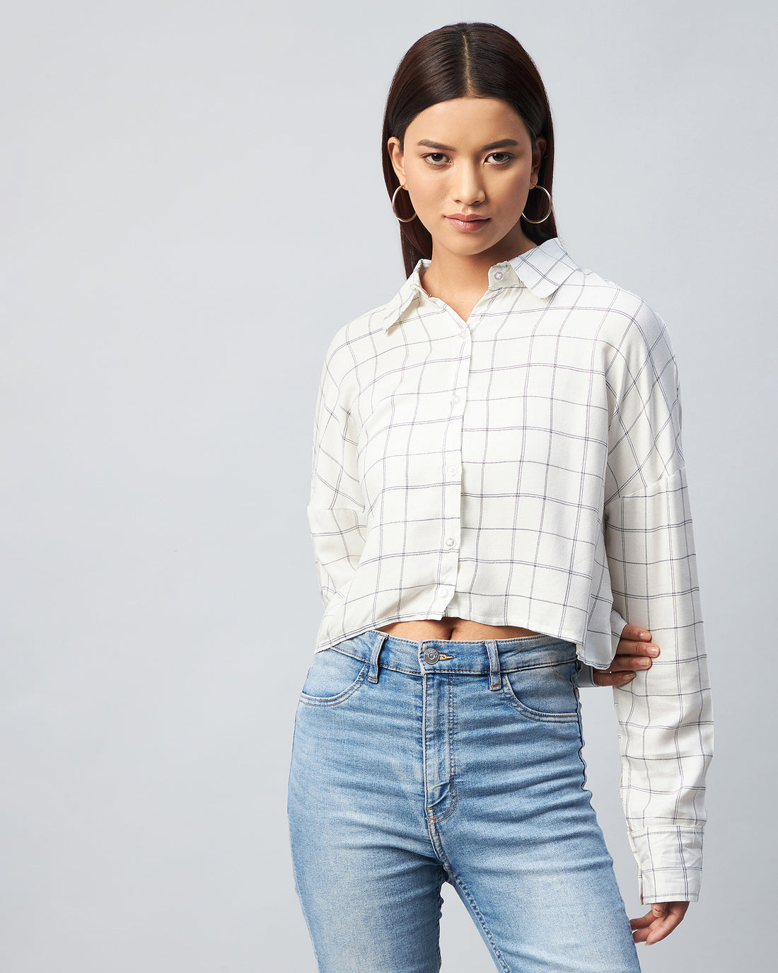 Chimpaaanzee Women Viscose White & Grey Checkered Full Sleeve Drop Shoulder Crop Shirt