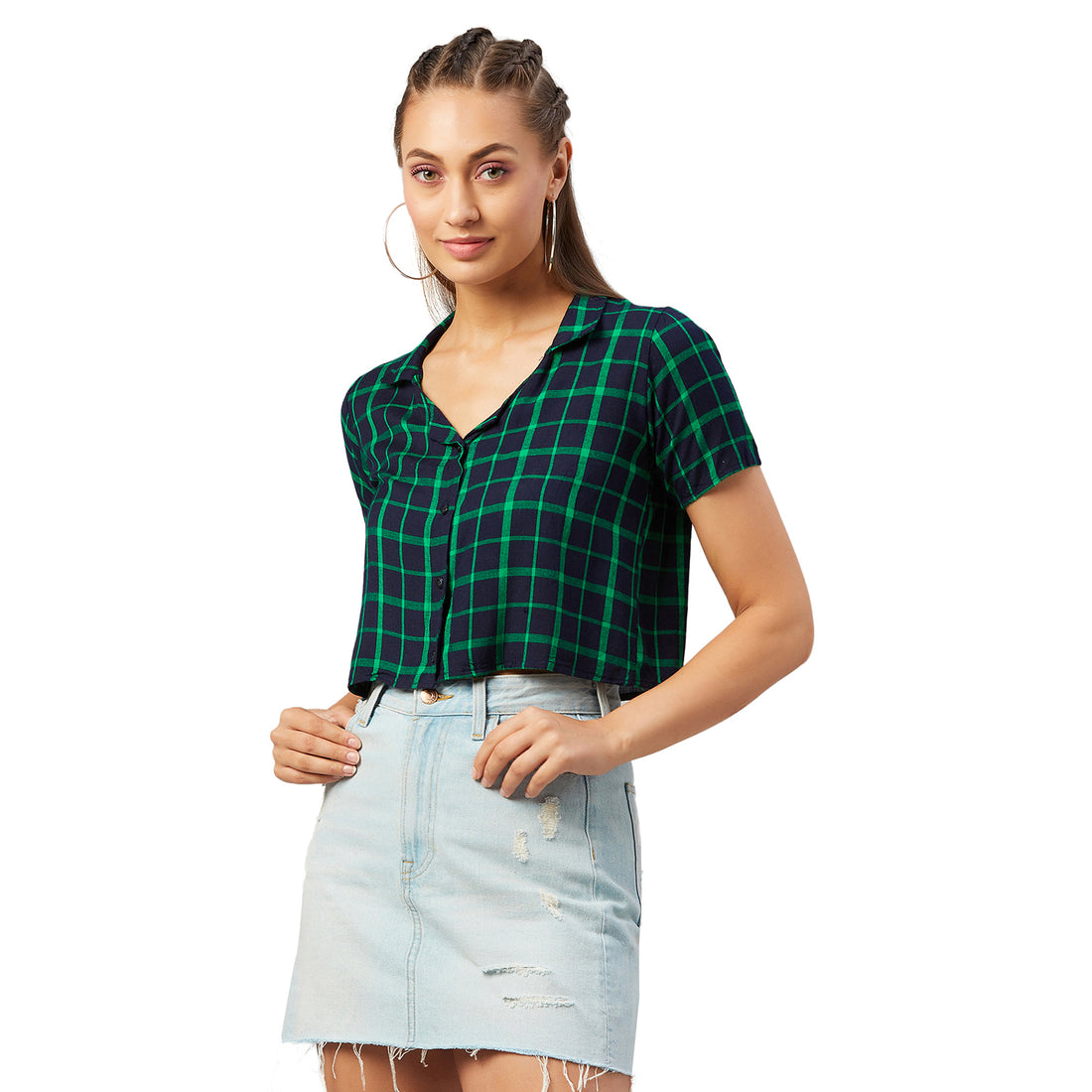 Chimpaaanzee Women Navy and Green Checkered Viscose Crop Shirt