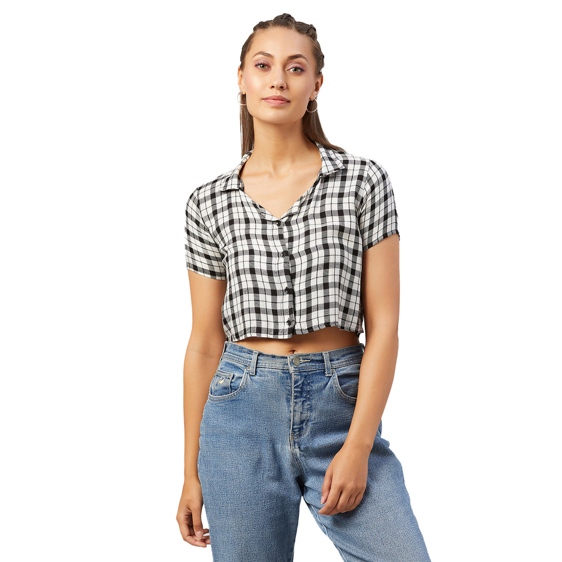 Chimpaaanzee Women Black and White Checkered Viscose Crop Shirt