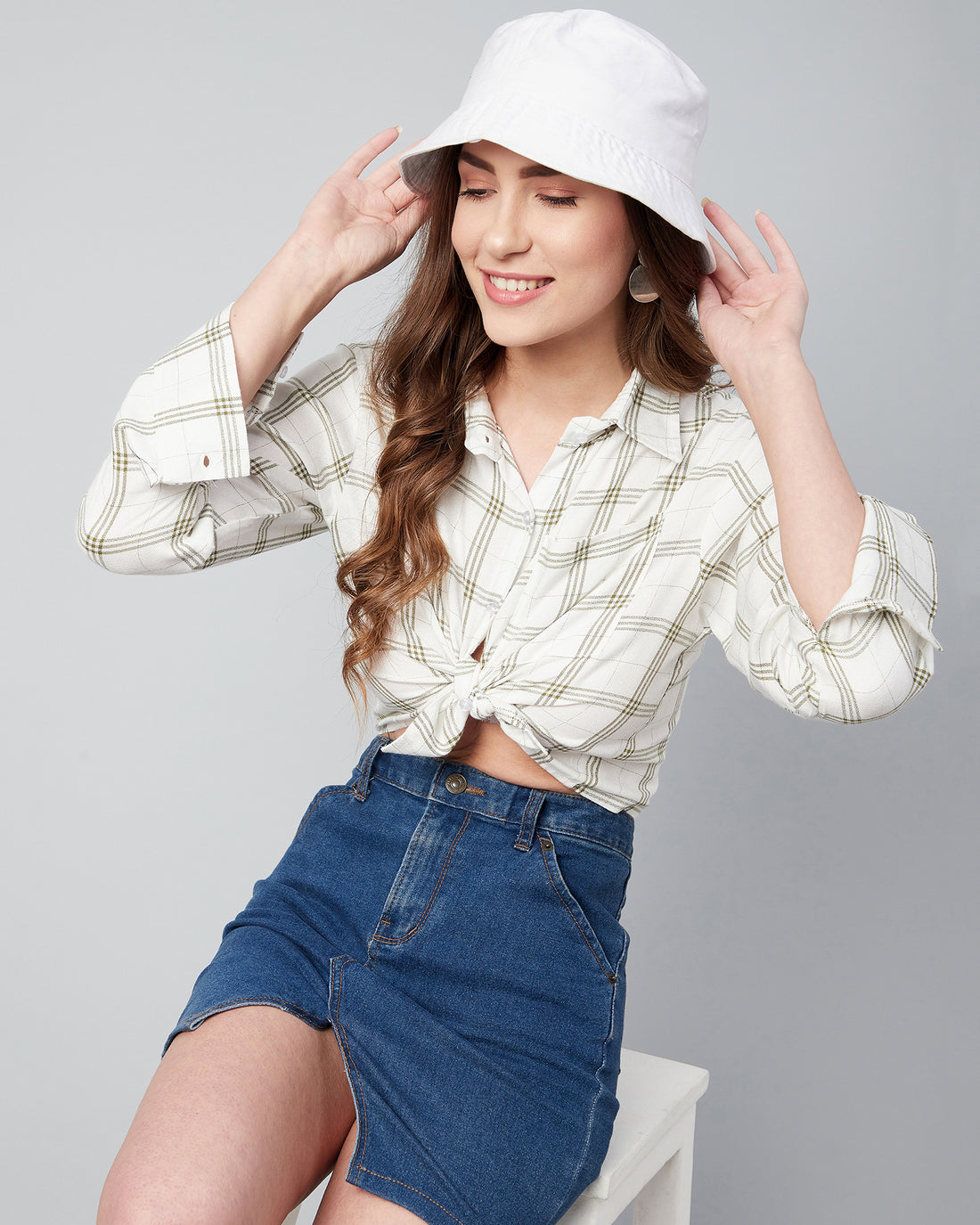Chimpaaanzee Women Viscose Grey & White Checks Full Sleeve Crop Shirt