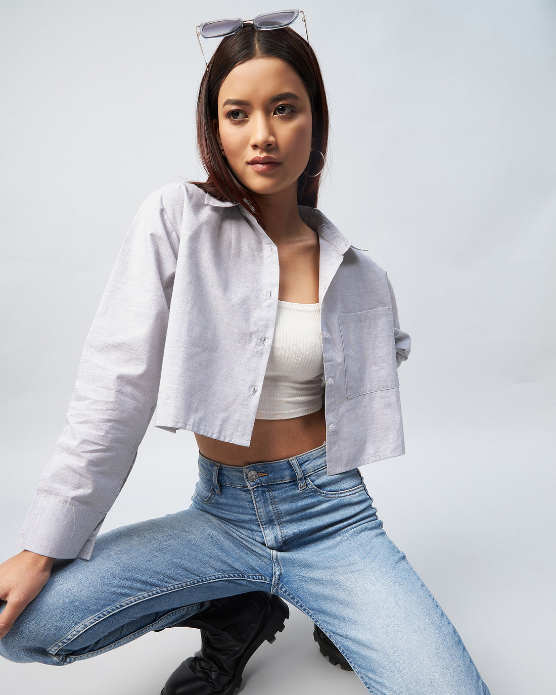 Chimpaaanzee Women Viscose Grey Solid Full Sleeve drop Shoulder Crop Shirt