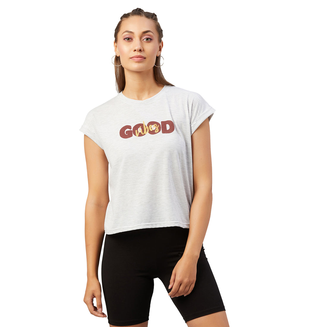 Chimpaaanzee Women Light Grey Folded Sleeve Round Neck T-shirt