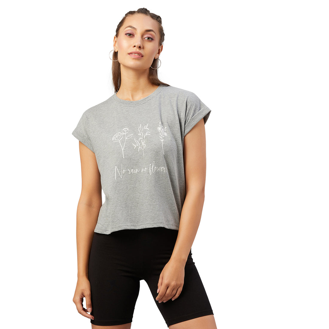 Chimpaaanzee Women Grey Folded Sleeve Round Neck T-shirt
