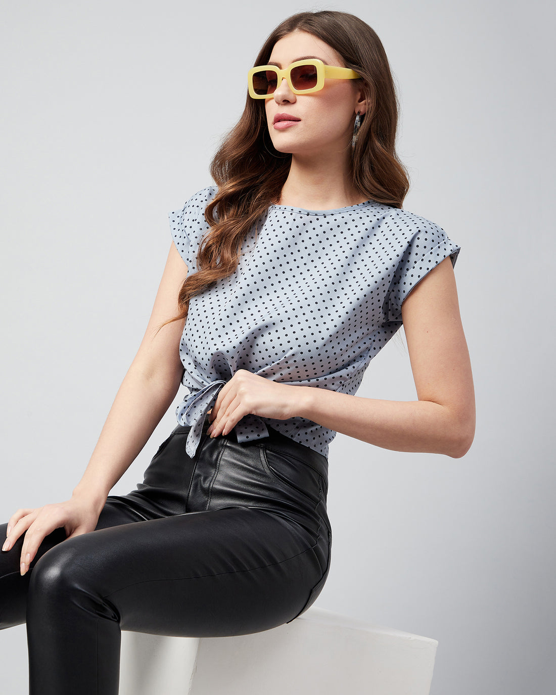 Chimpaaanzee Women Crepe Grey Polka Doted Knotted Crop Top