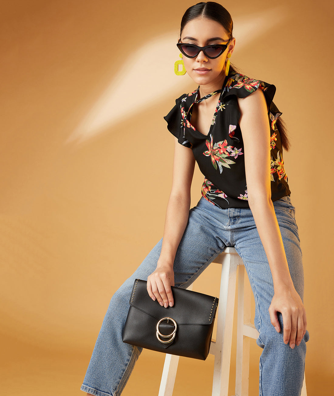 Chimpaaanzee Women Ruffled Sleeve Floral Printed Crepe Top