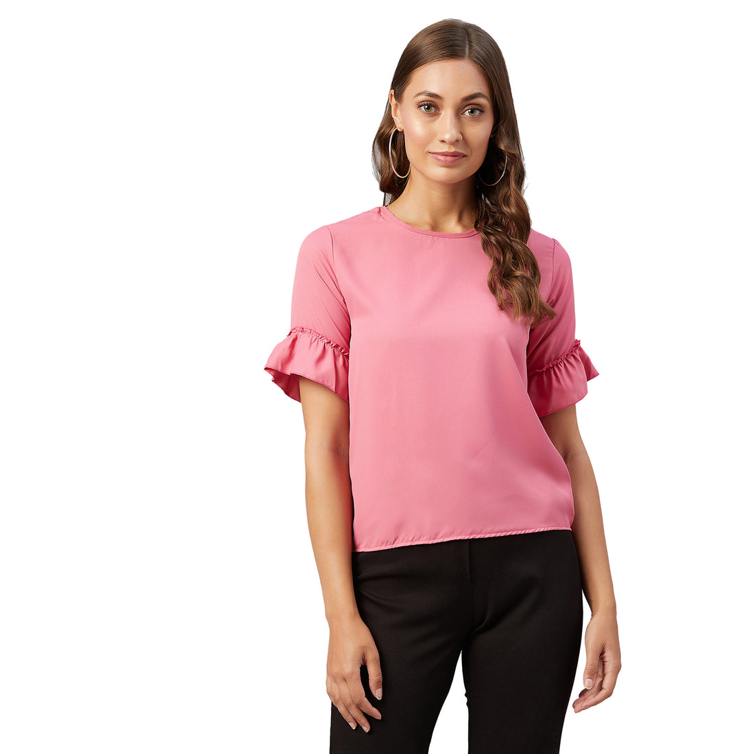 Chimpaaanzee Women Pink Solid Ruffled sleeve Top