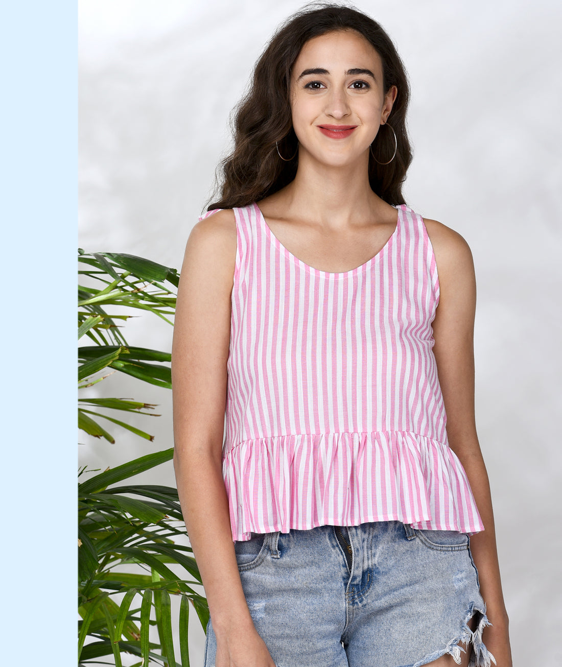Chimpaaanzee Women Pink striped Viscose Ruffled Top