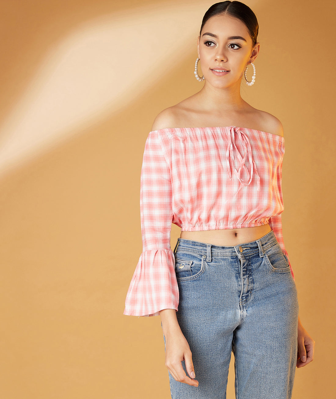 Chimpaaanzee Women Off Shoulder Bell Sleeve Pink Top