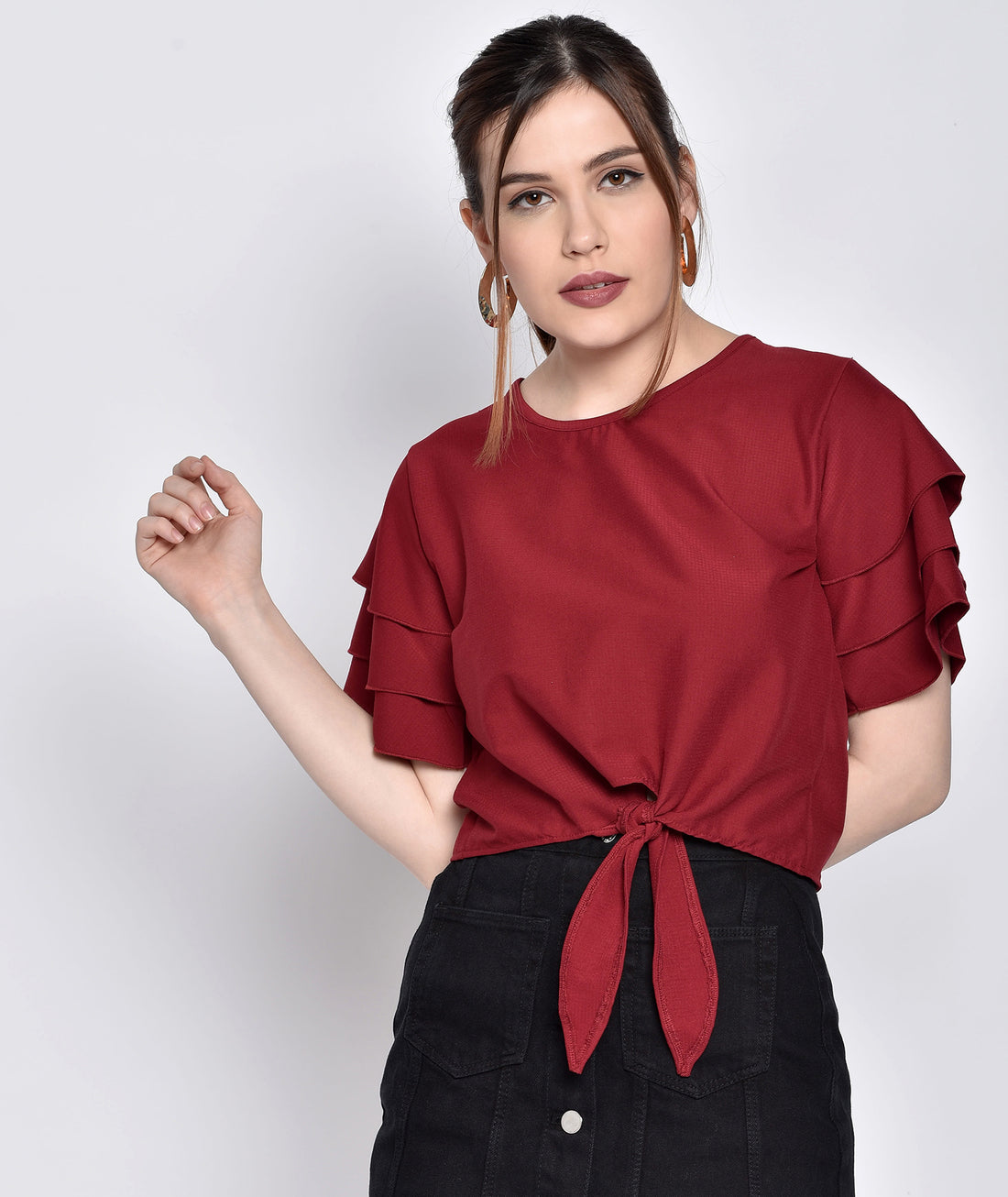 Chimpaaanzee Women Knotted Bell Sleeve Maroon Crop Top