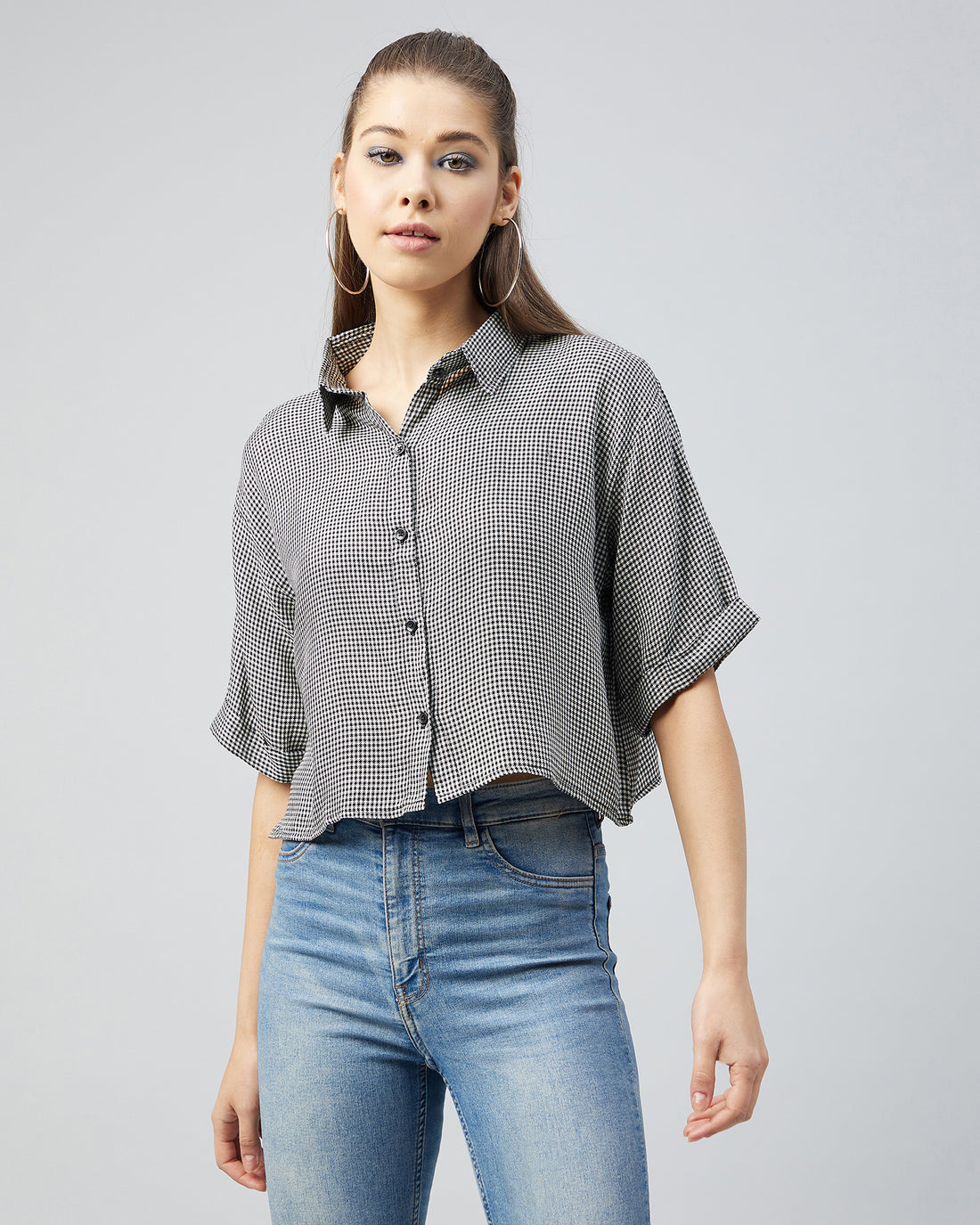 Chimpaaanzee Women Viscose Multicolor Checkered Folded Sleeve Loose Fit Crop Shirt