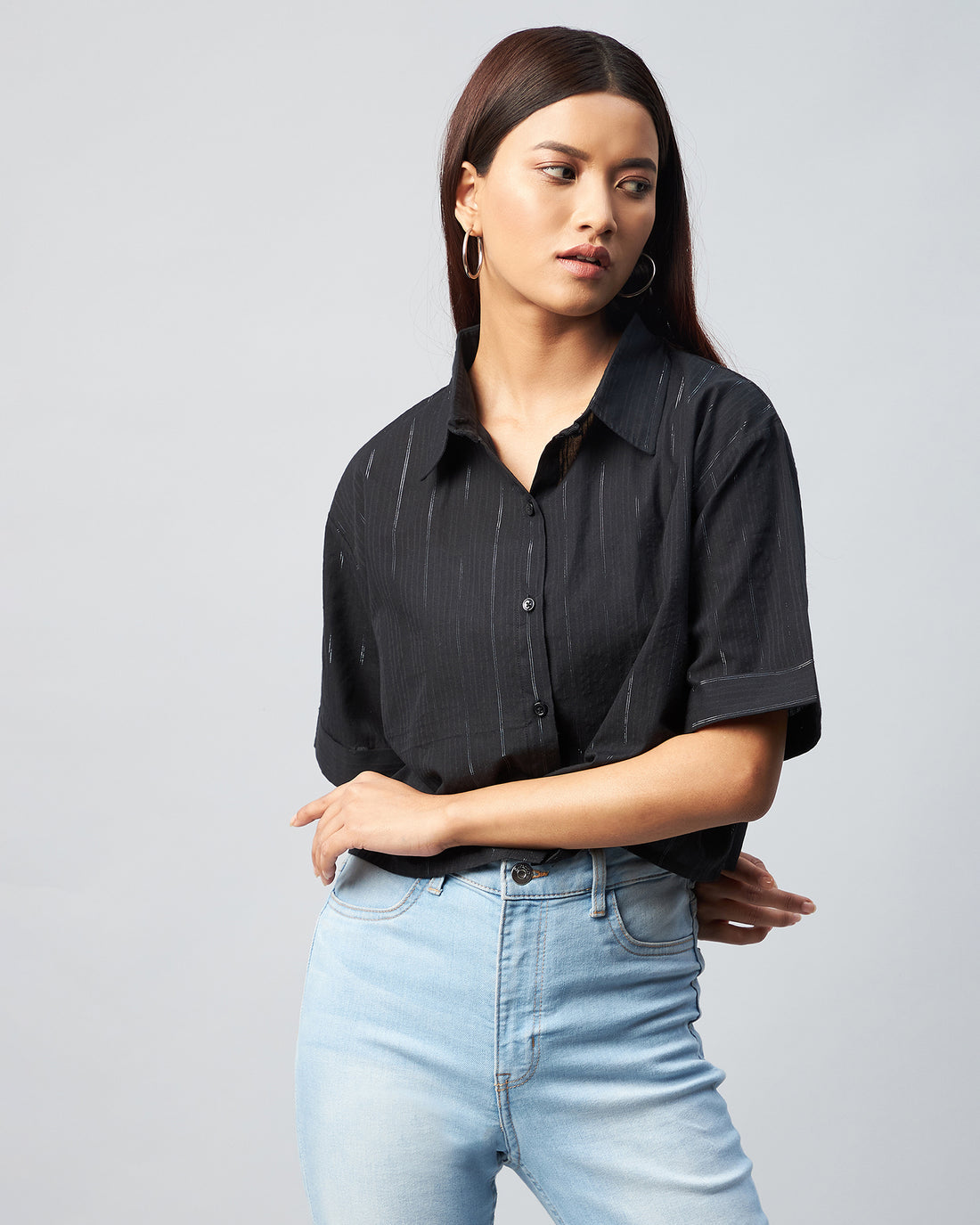 Chimpaaanzee Women Viscose Black & White Striped Loose Fit Crop Shirt