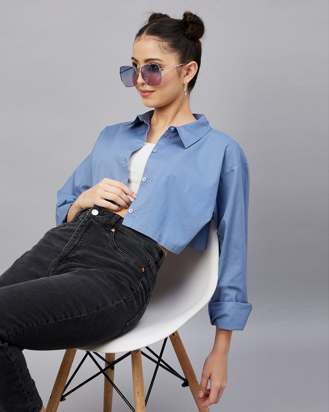 Chimpaaanzee Women Cotton Blue solid Fully Crop Shirt