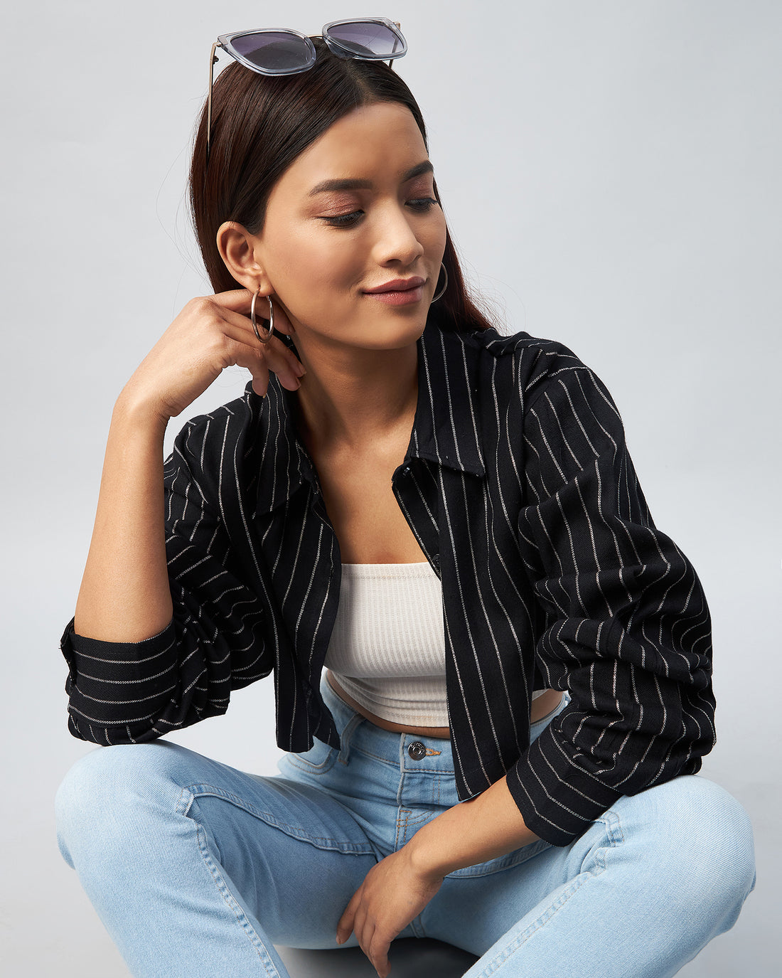 Chimpaaanzee Women Viscose Black Striped Fully Cropped Shirt