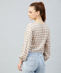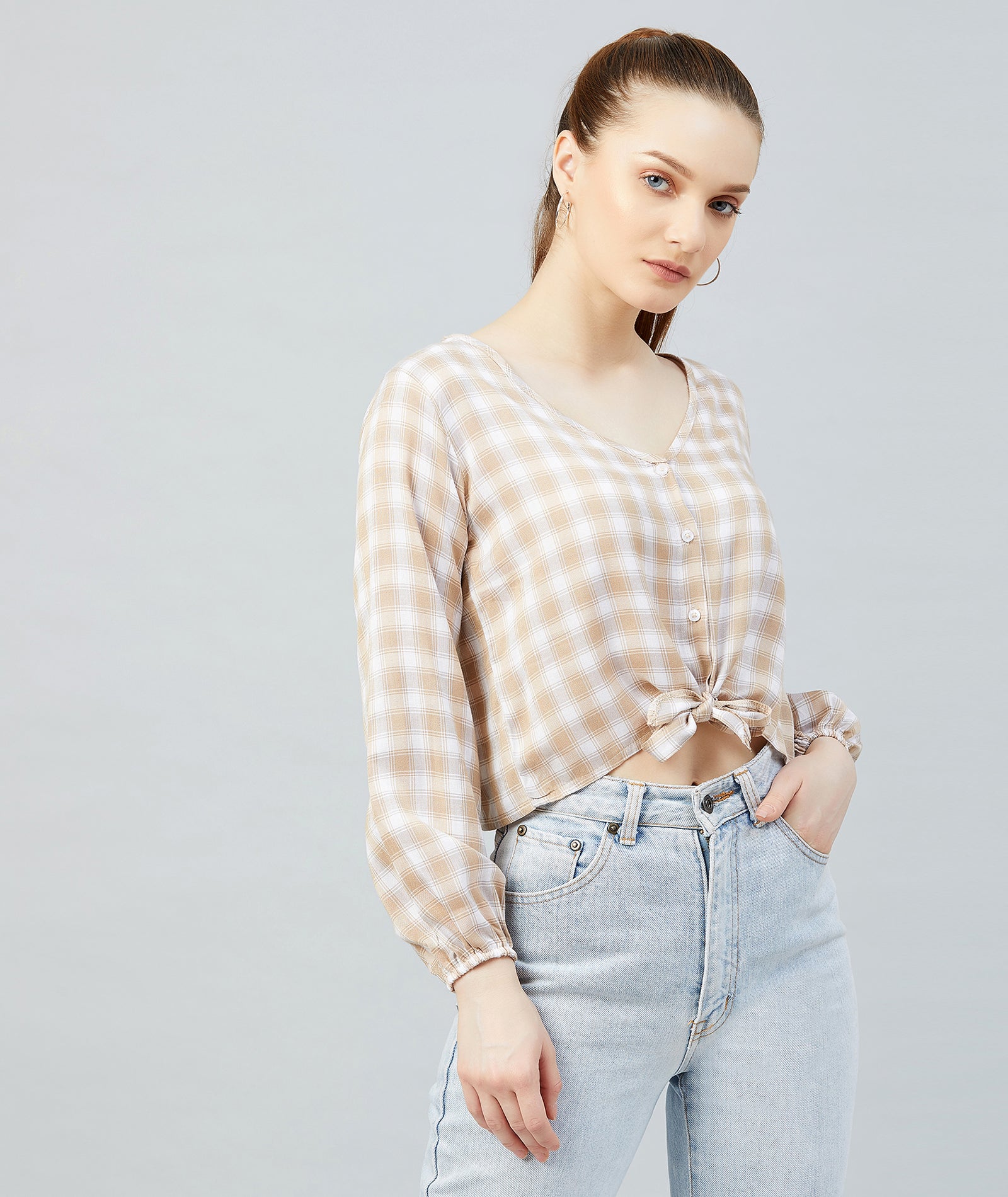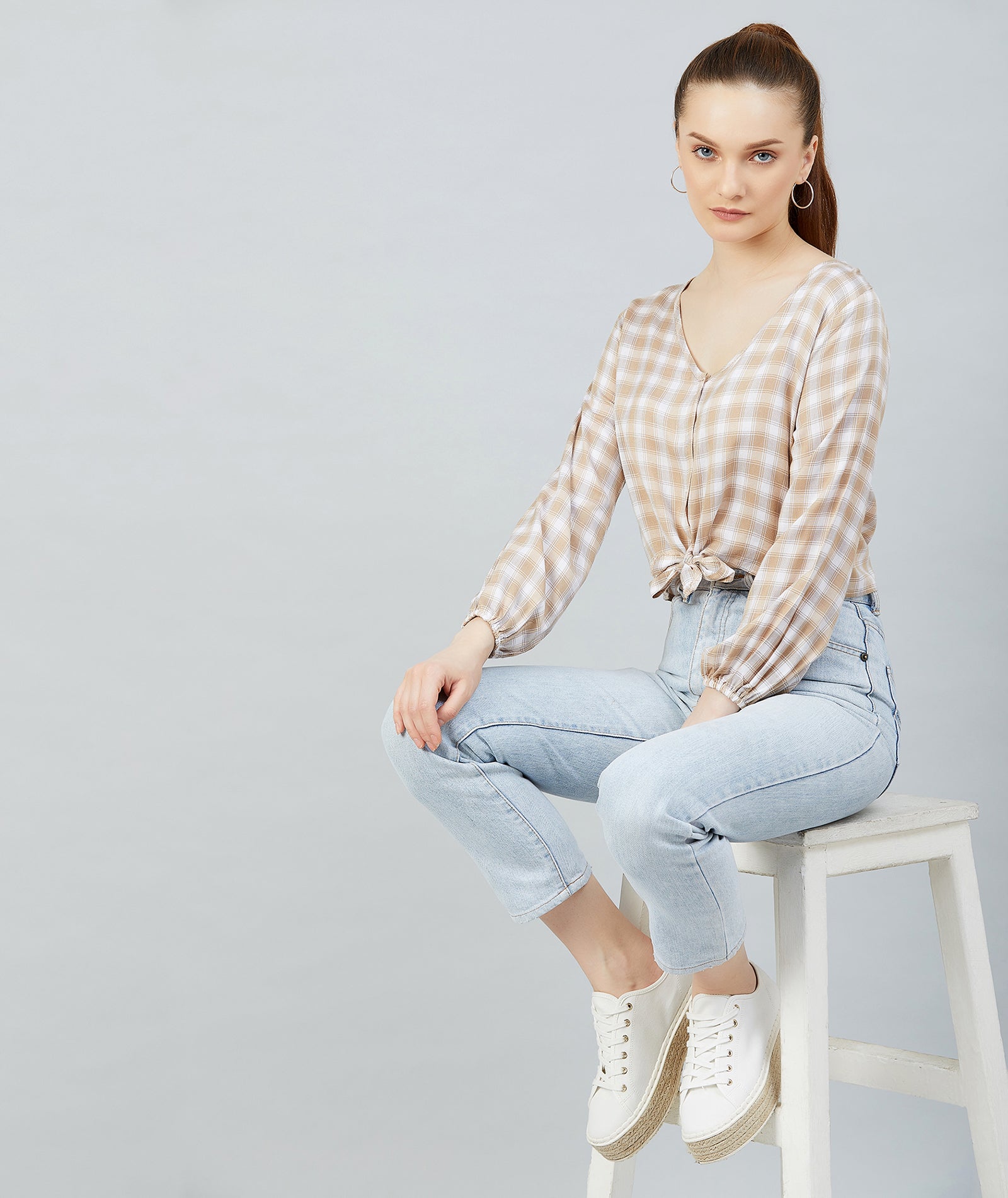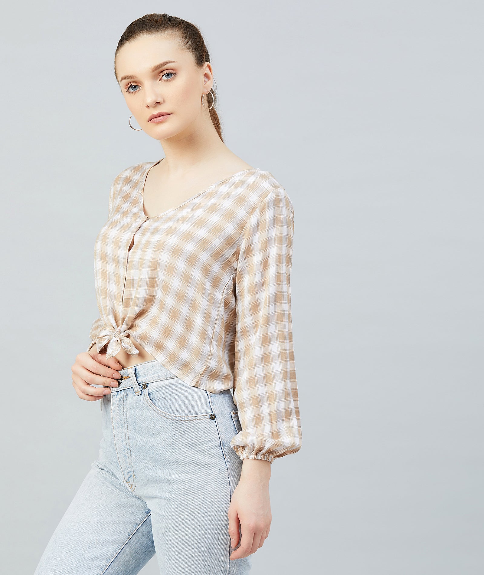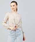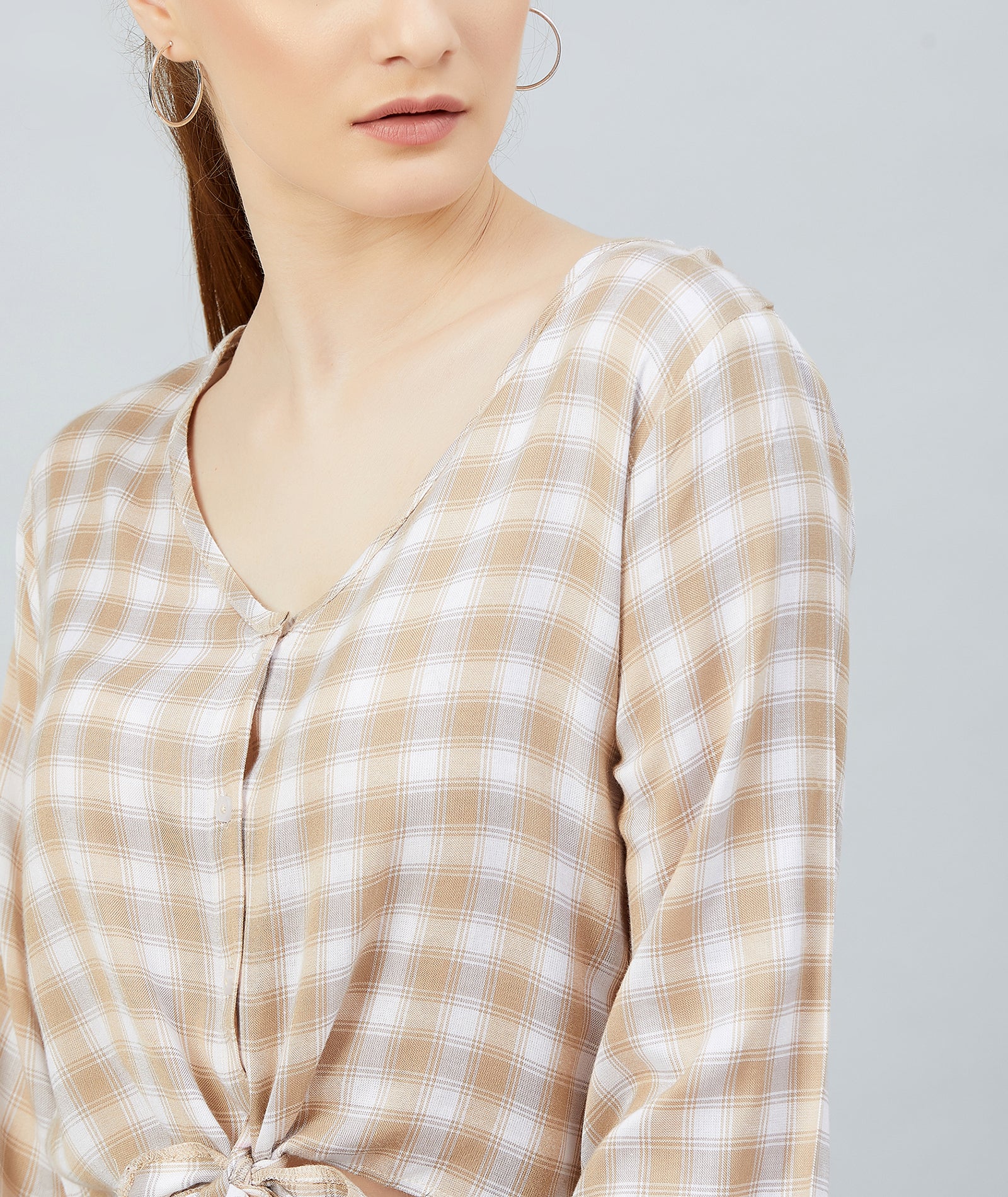 Chimpaaanzee Women Beige Checkered Viscose Knotted Top