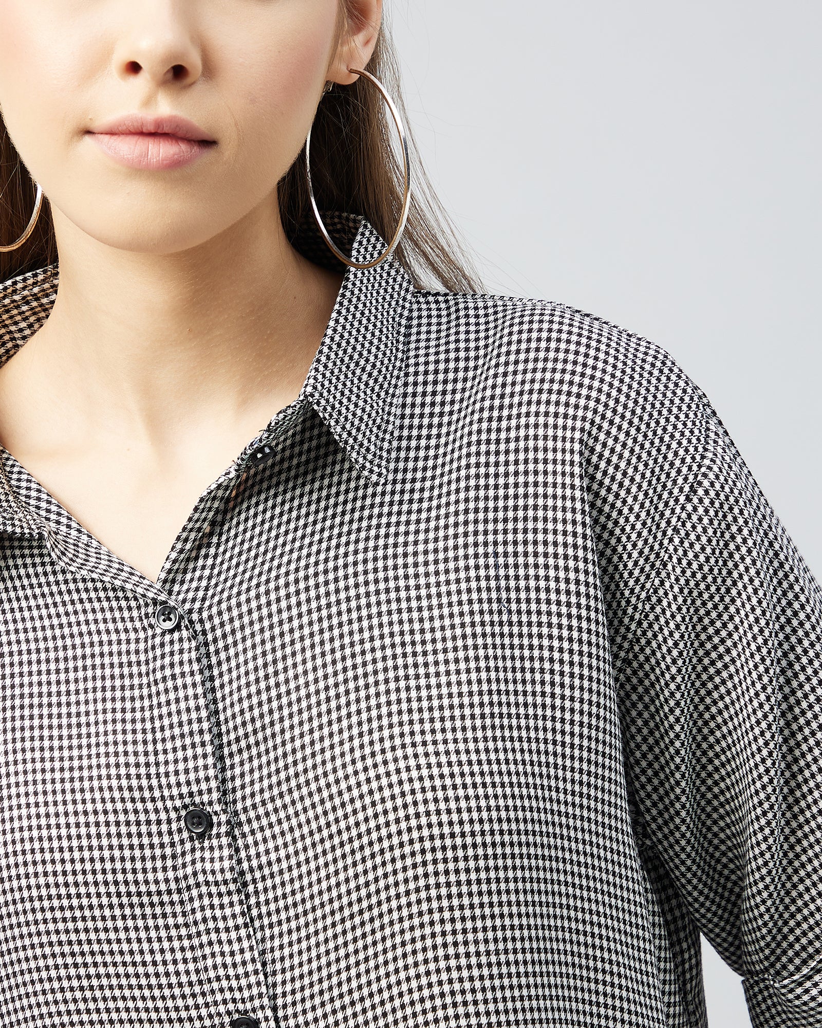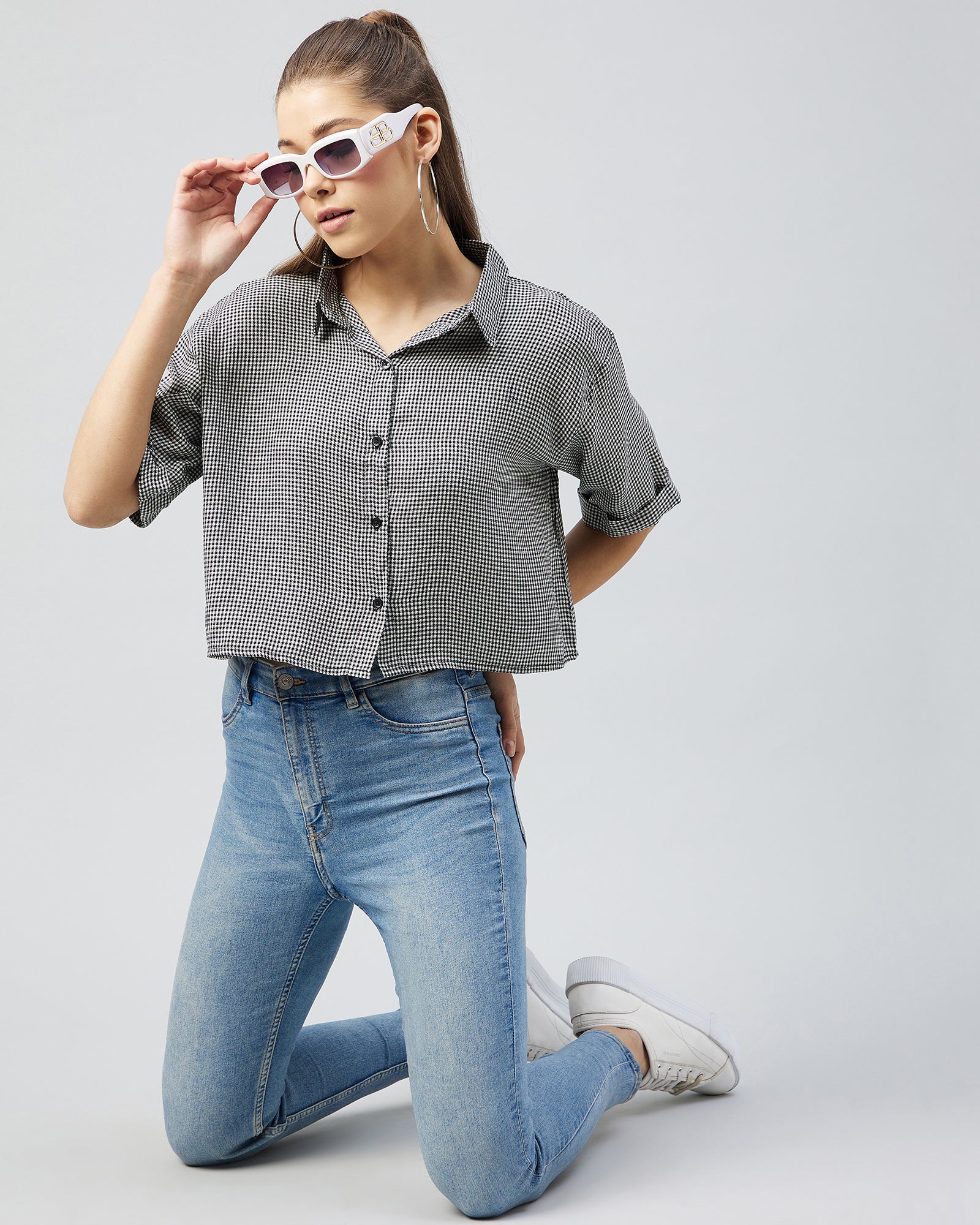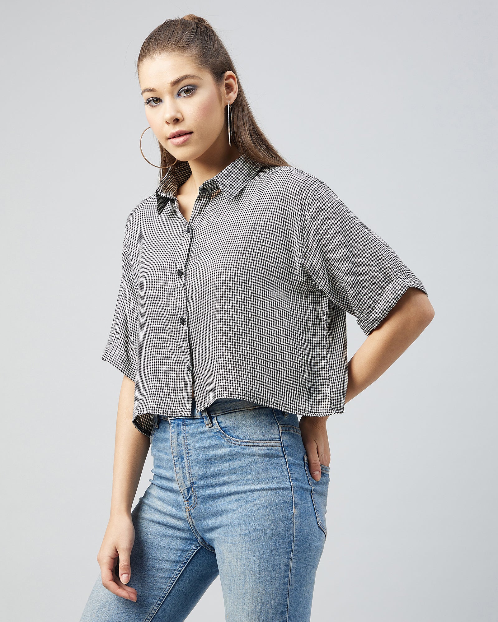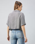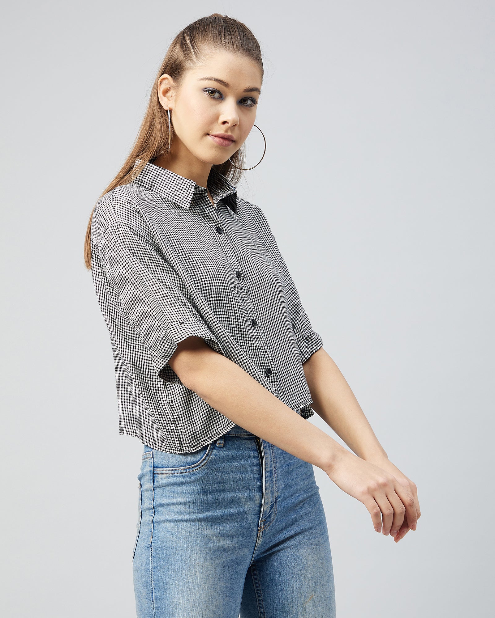 Chimpaaanzee Women Black and White Folded Sleeve Loose Fit Crop Shirt