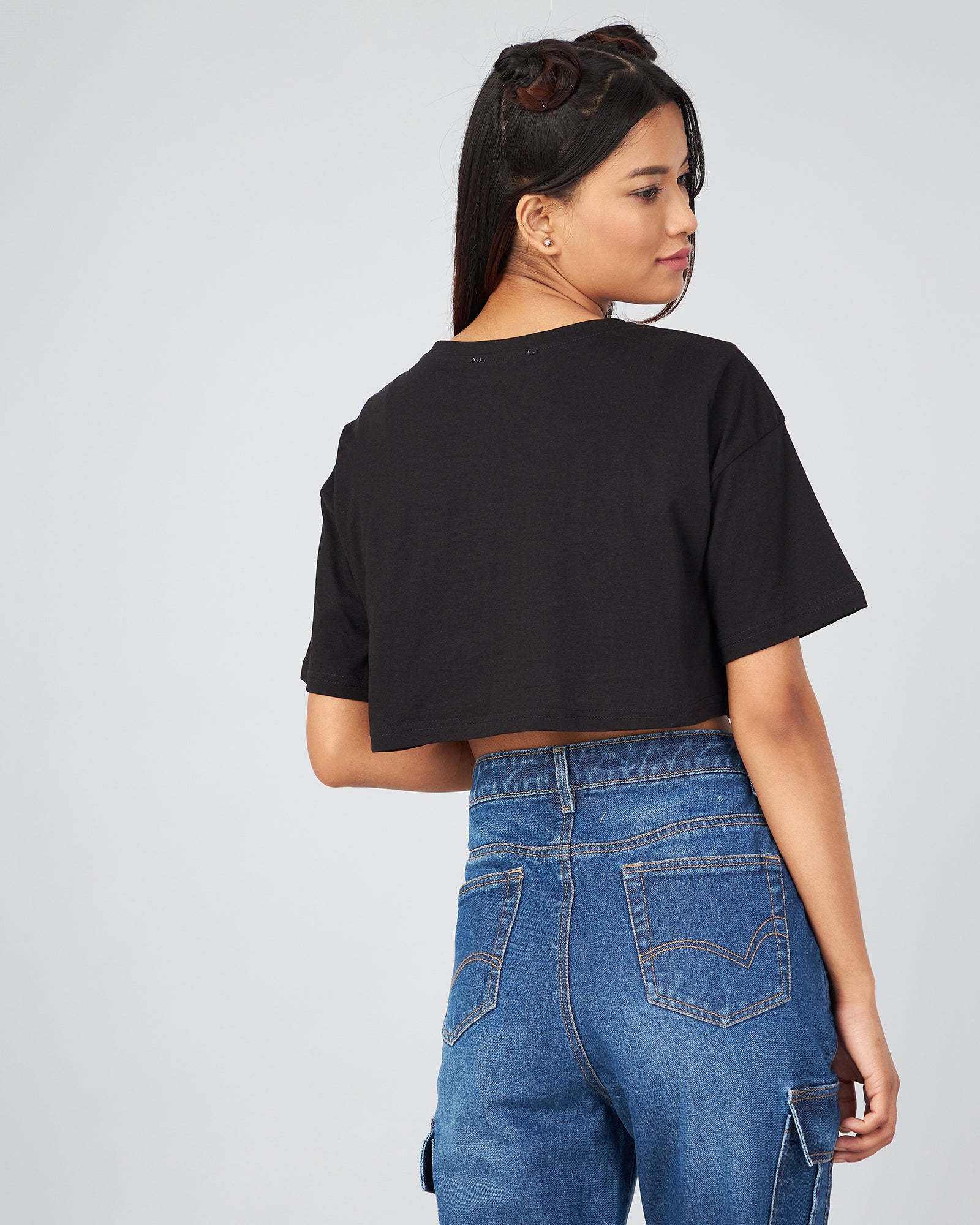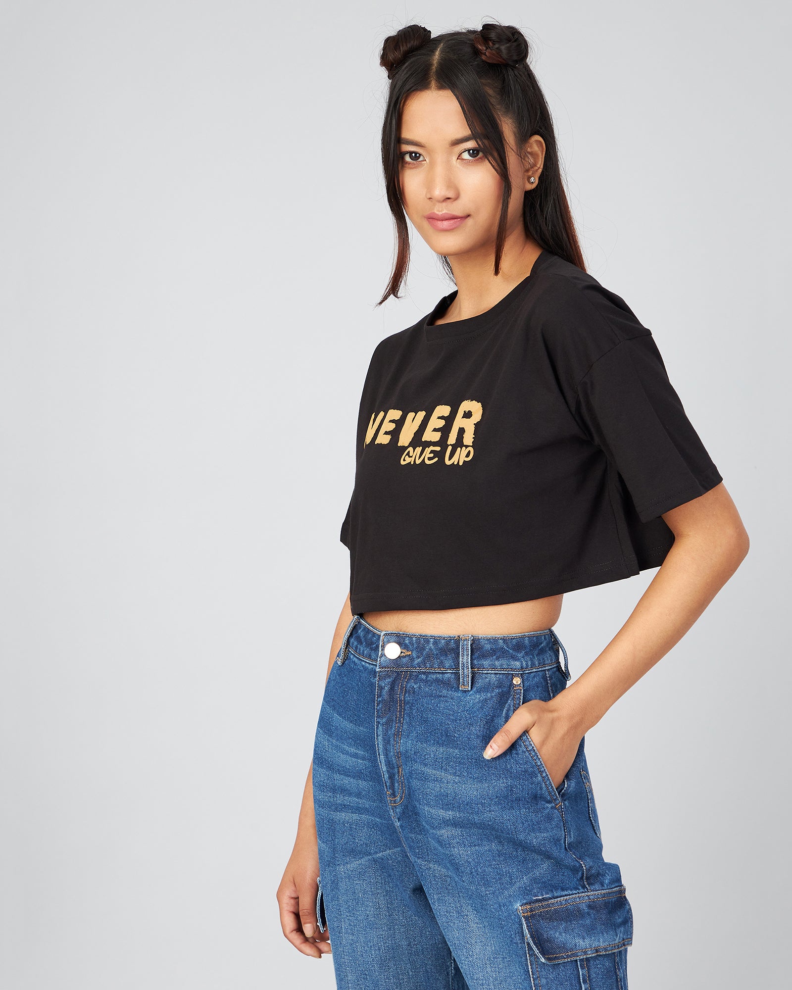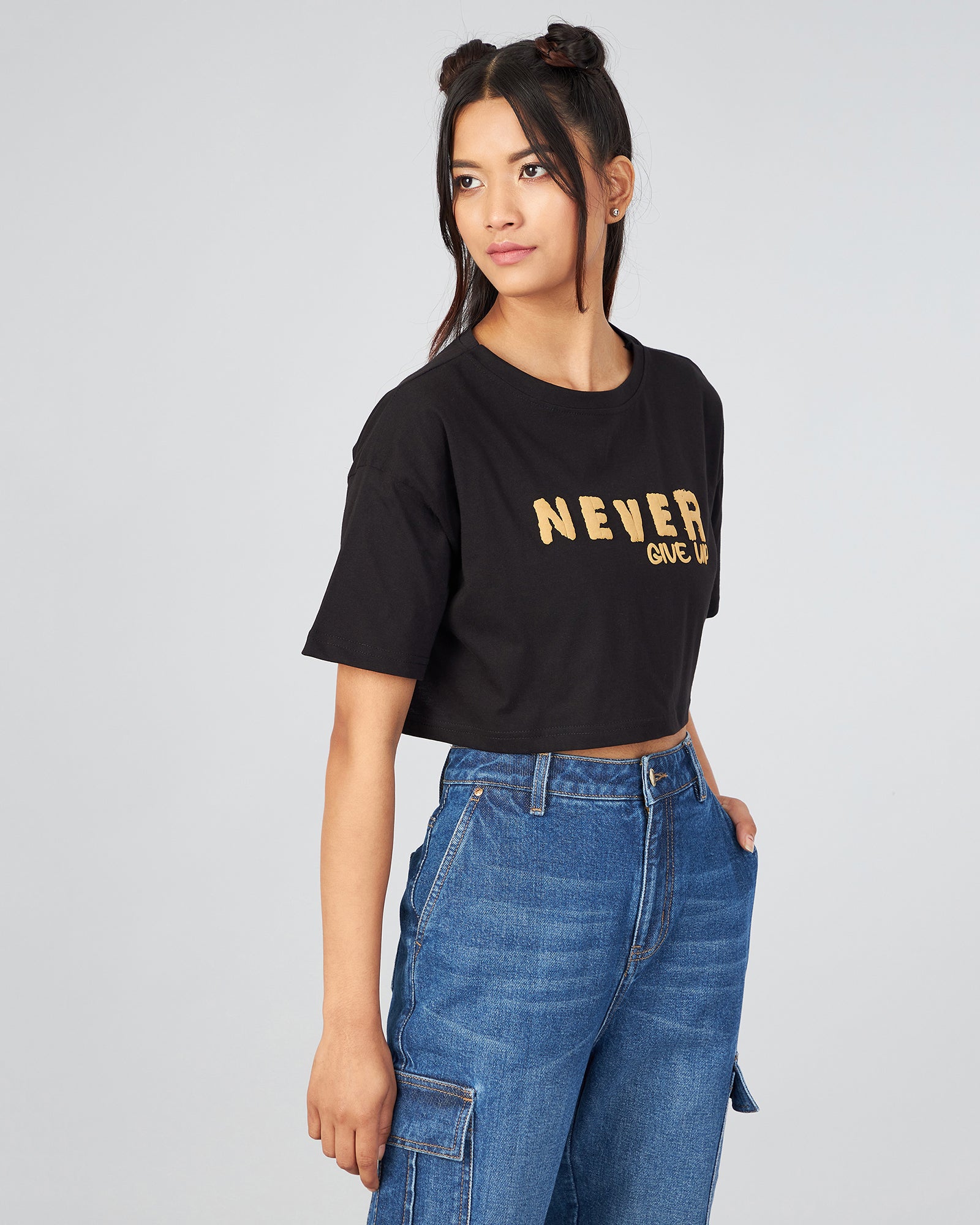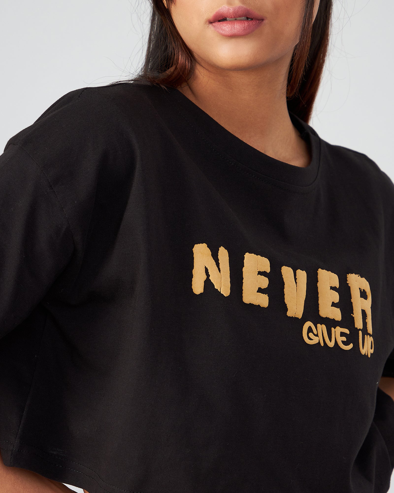 Chimpaaanzee Women Black Loose Fit Crop T-shirt (Never Give Up)