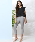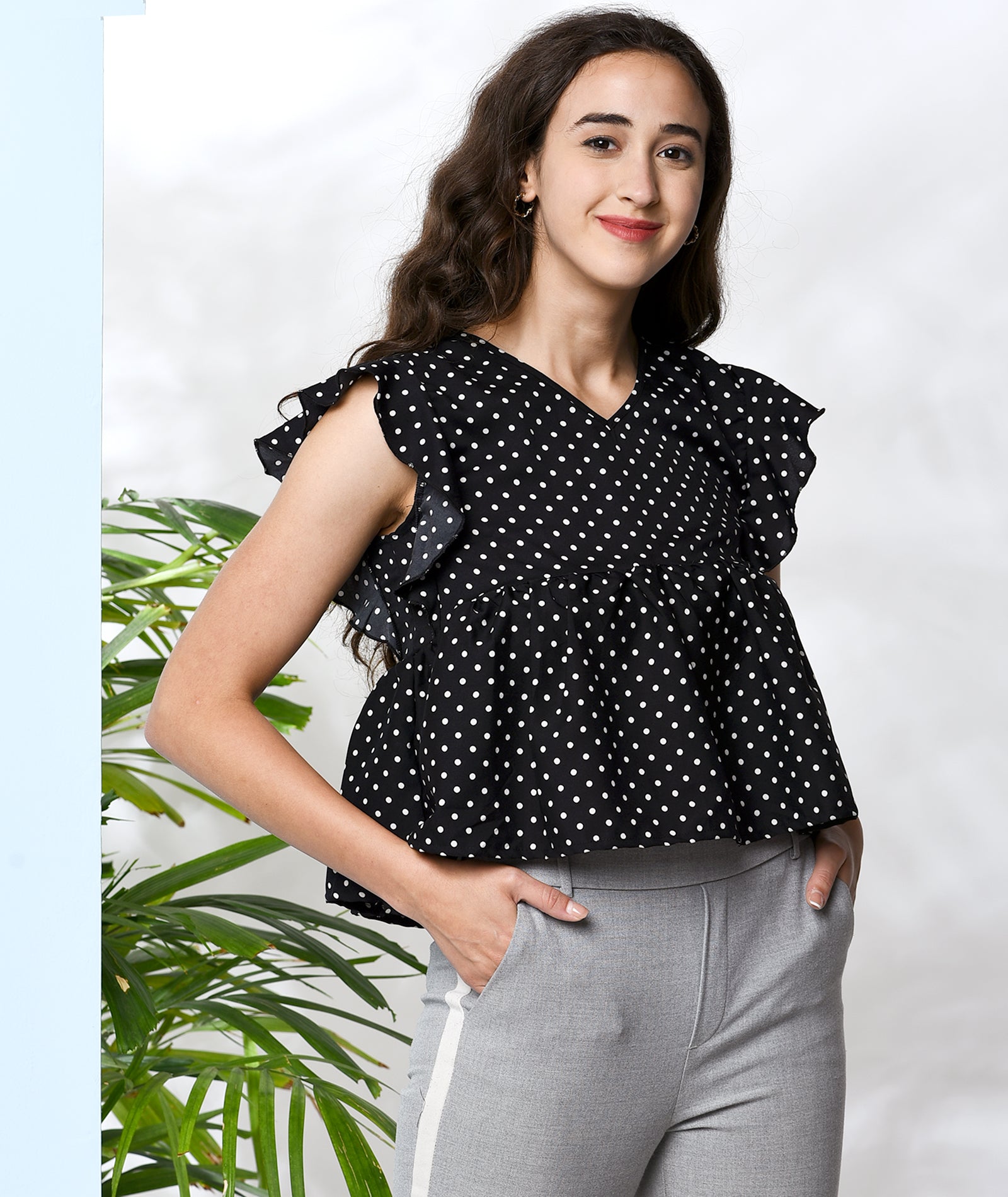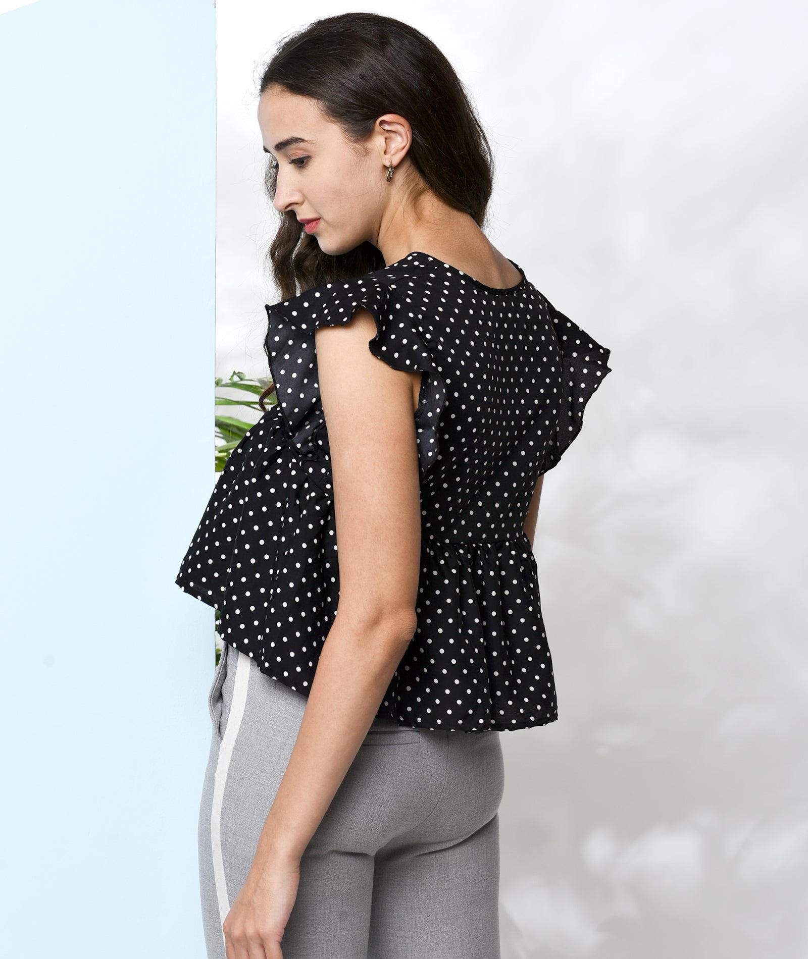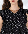 Chimpaaanzee Women Black Polka Doted Crepe Ruffled Top