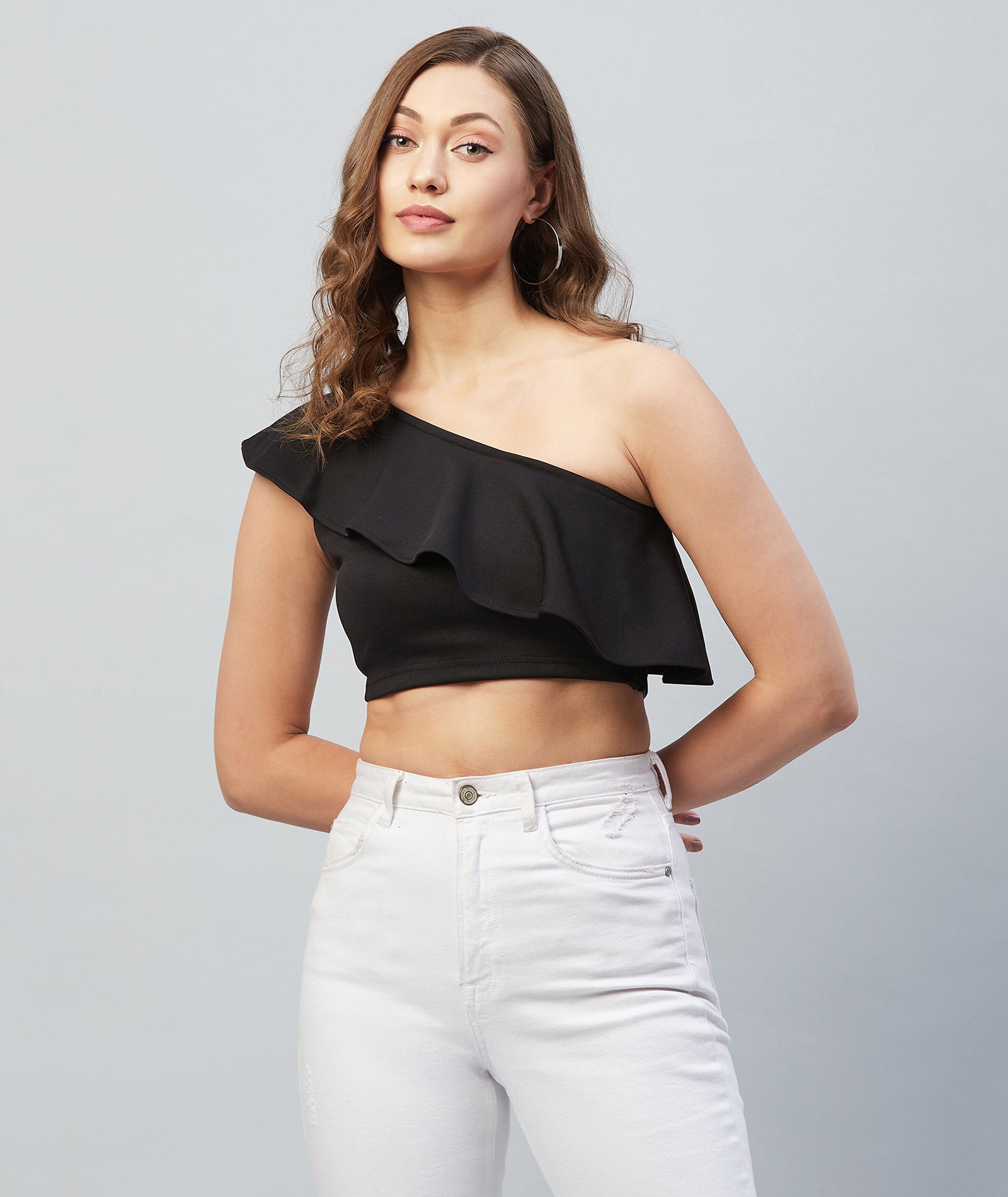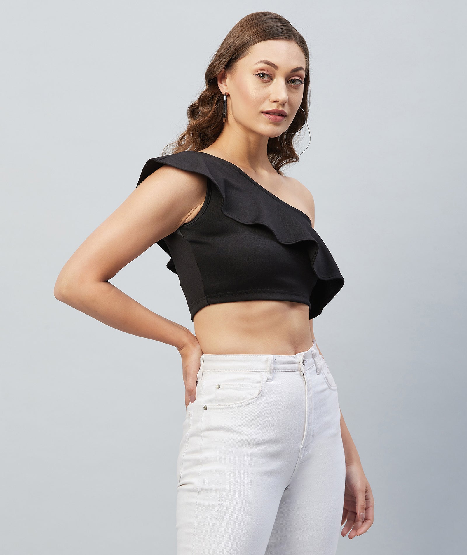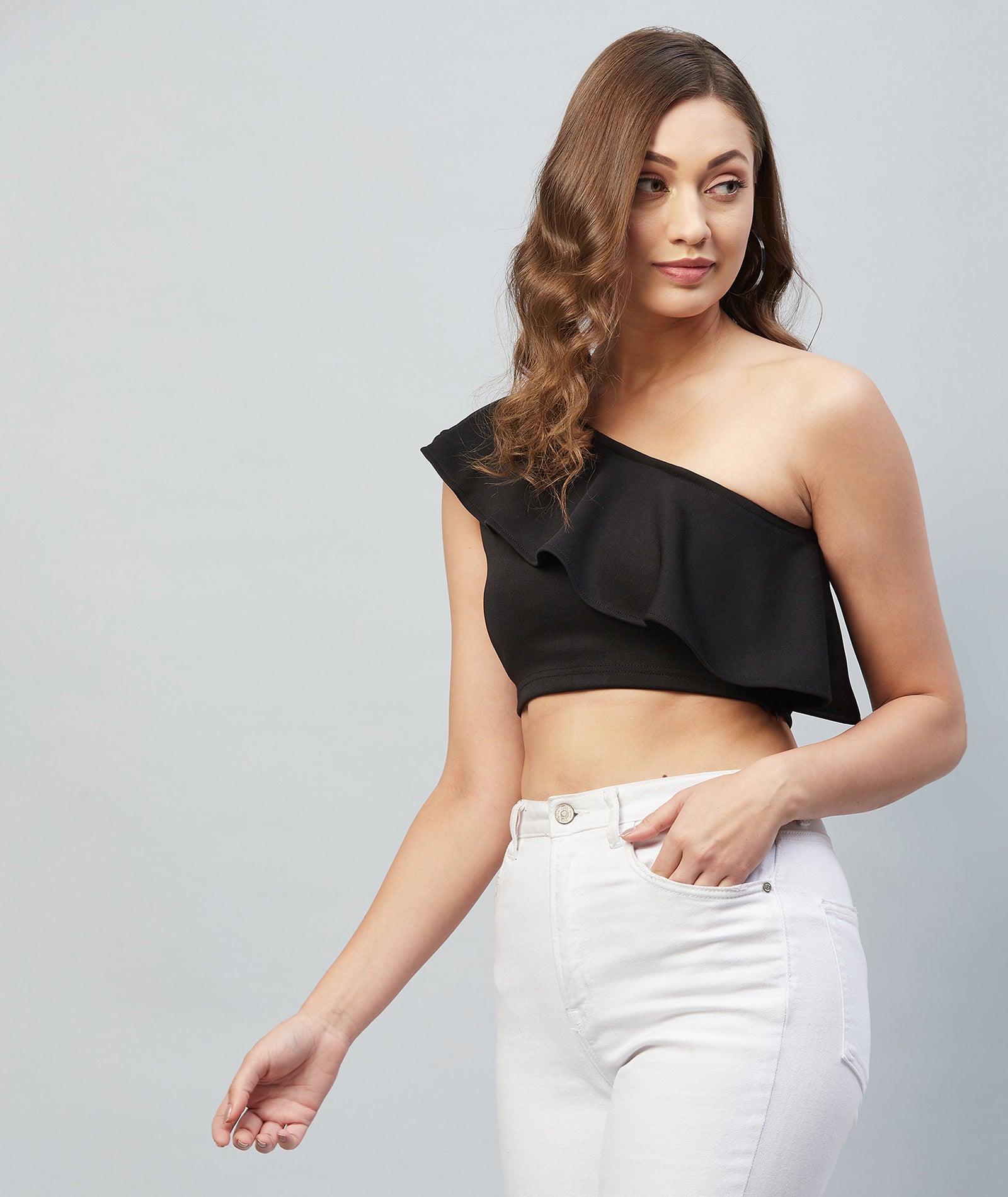 Chimpaaanzee Women Black Solid One Shoulder Crop Top