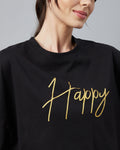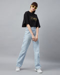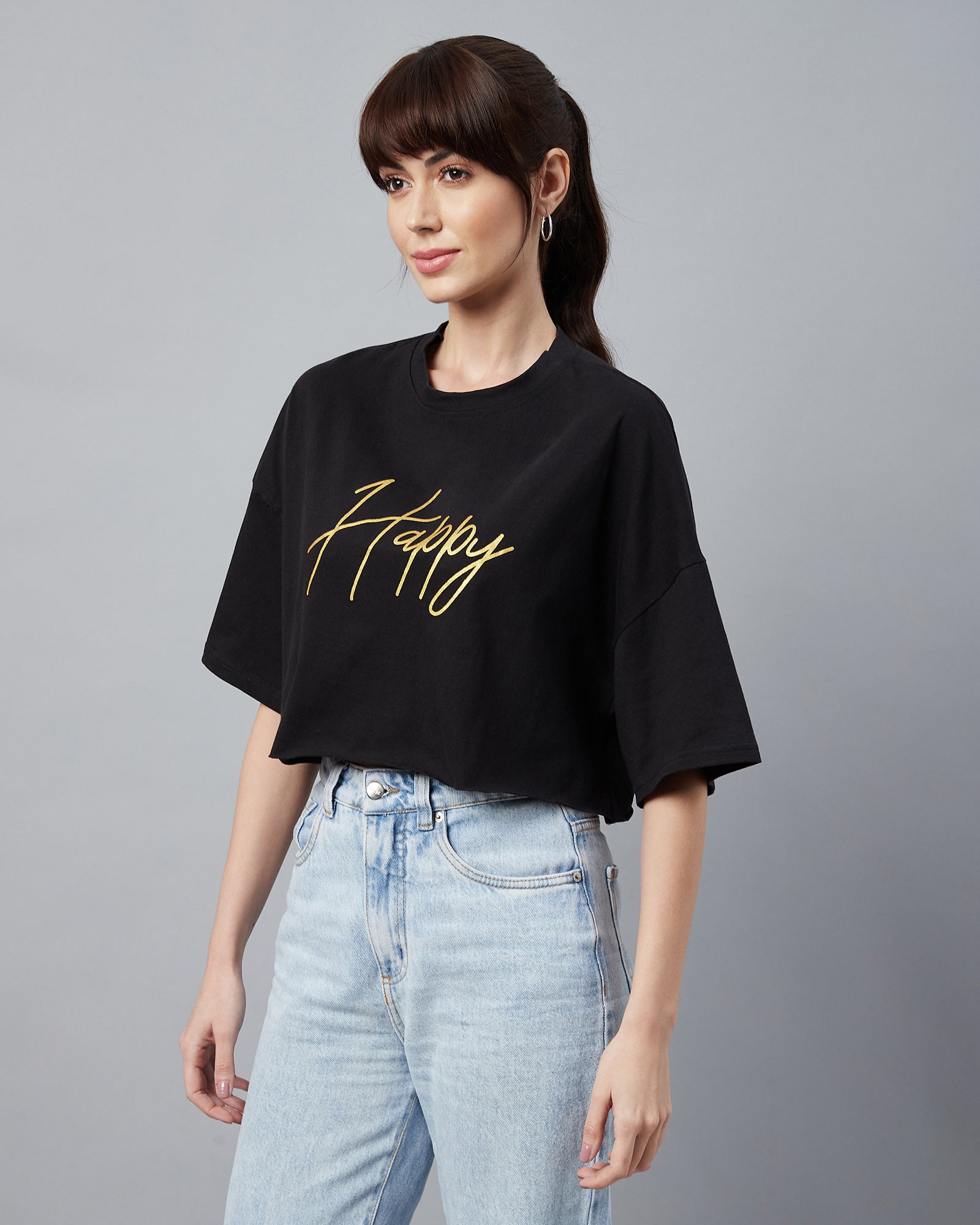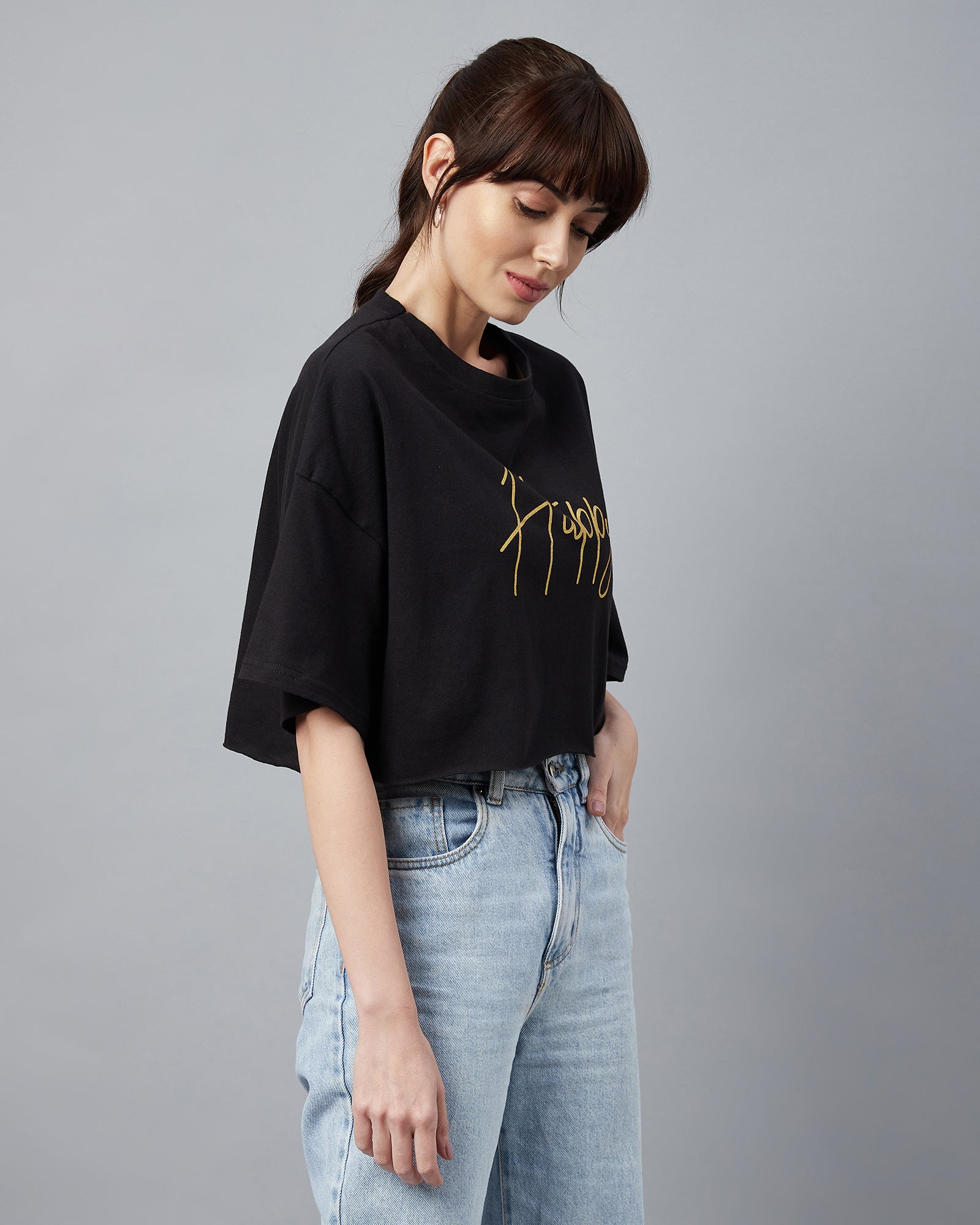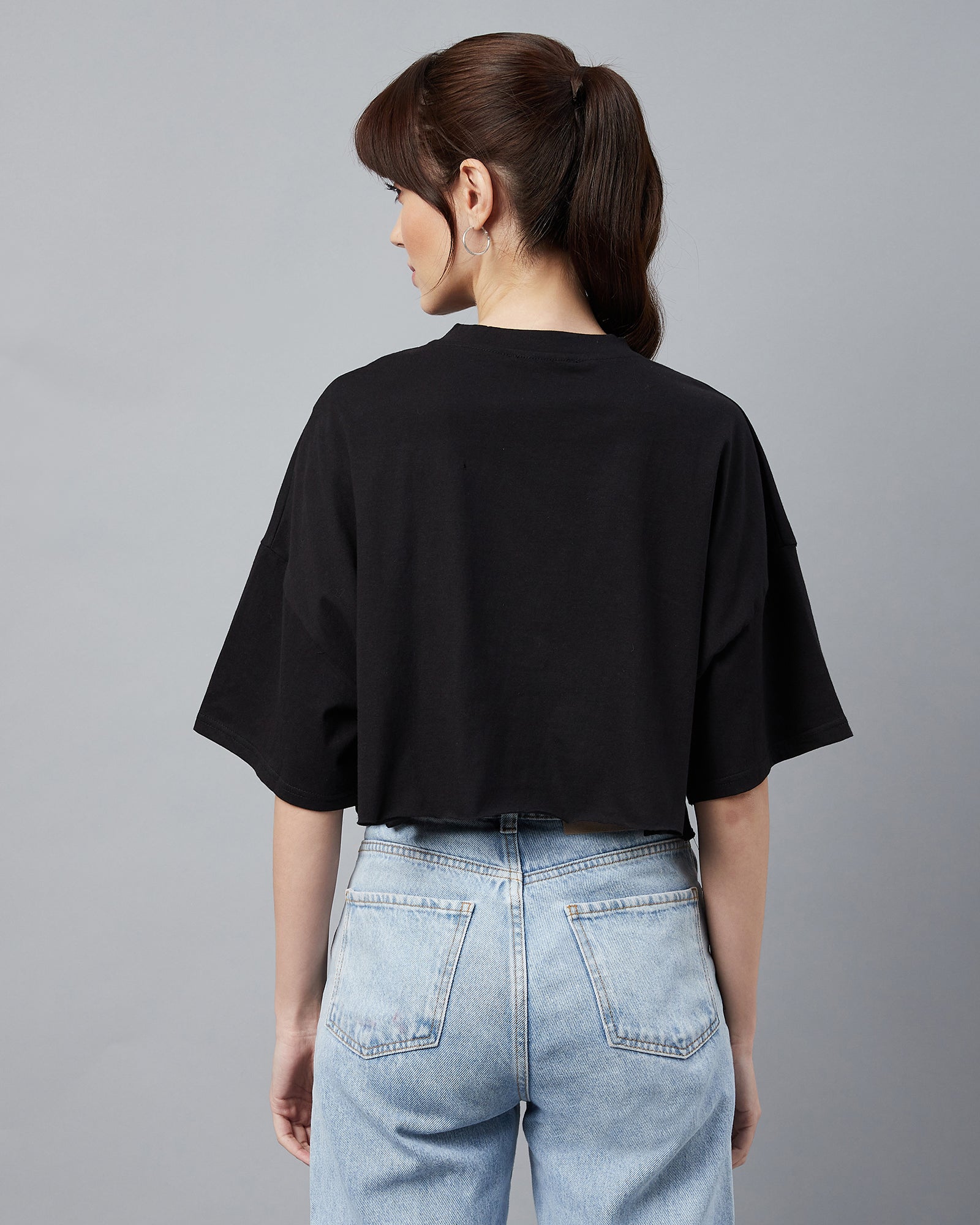 Chimpaaanzee Women Black Typographic Oversized Crop T-shirt