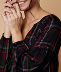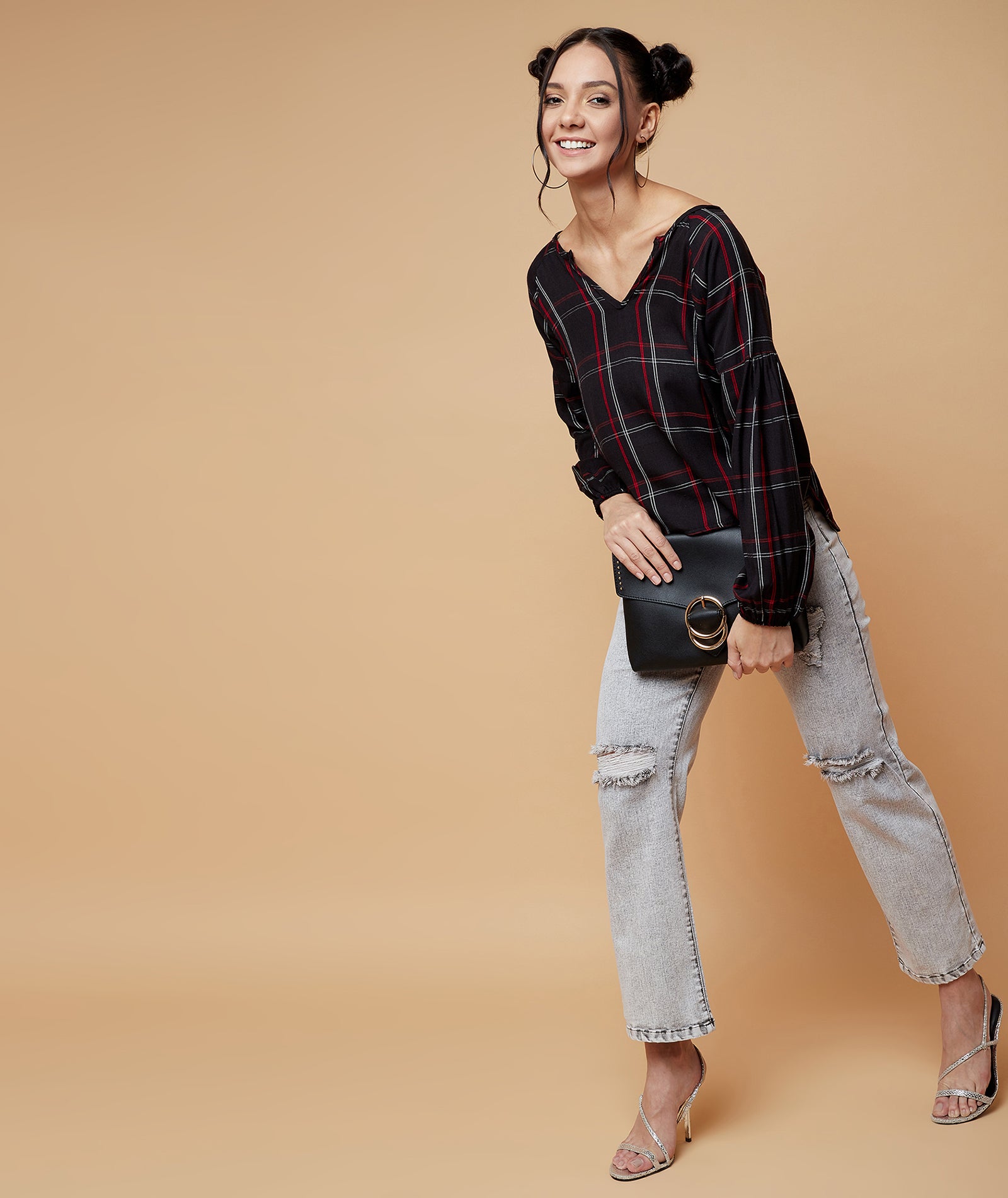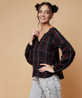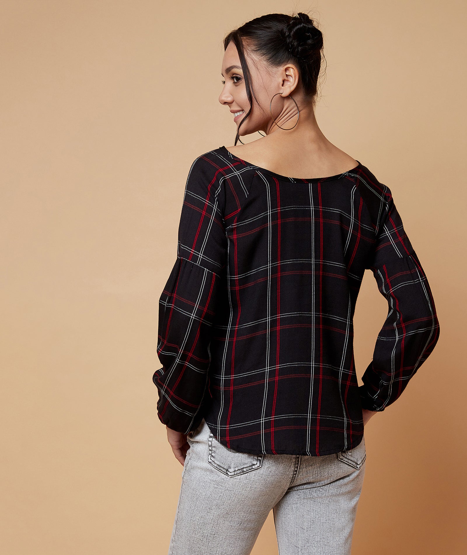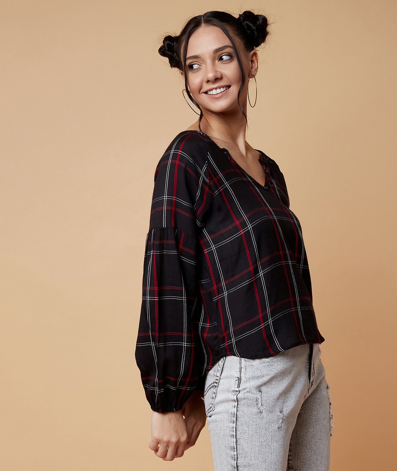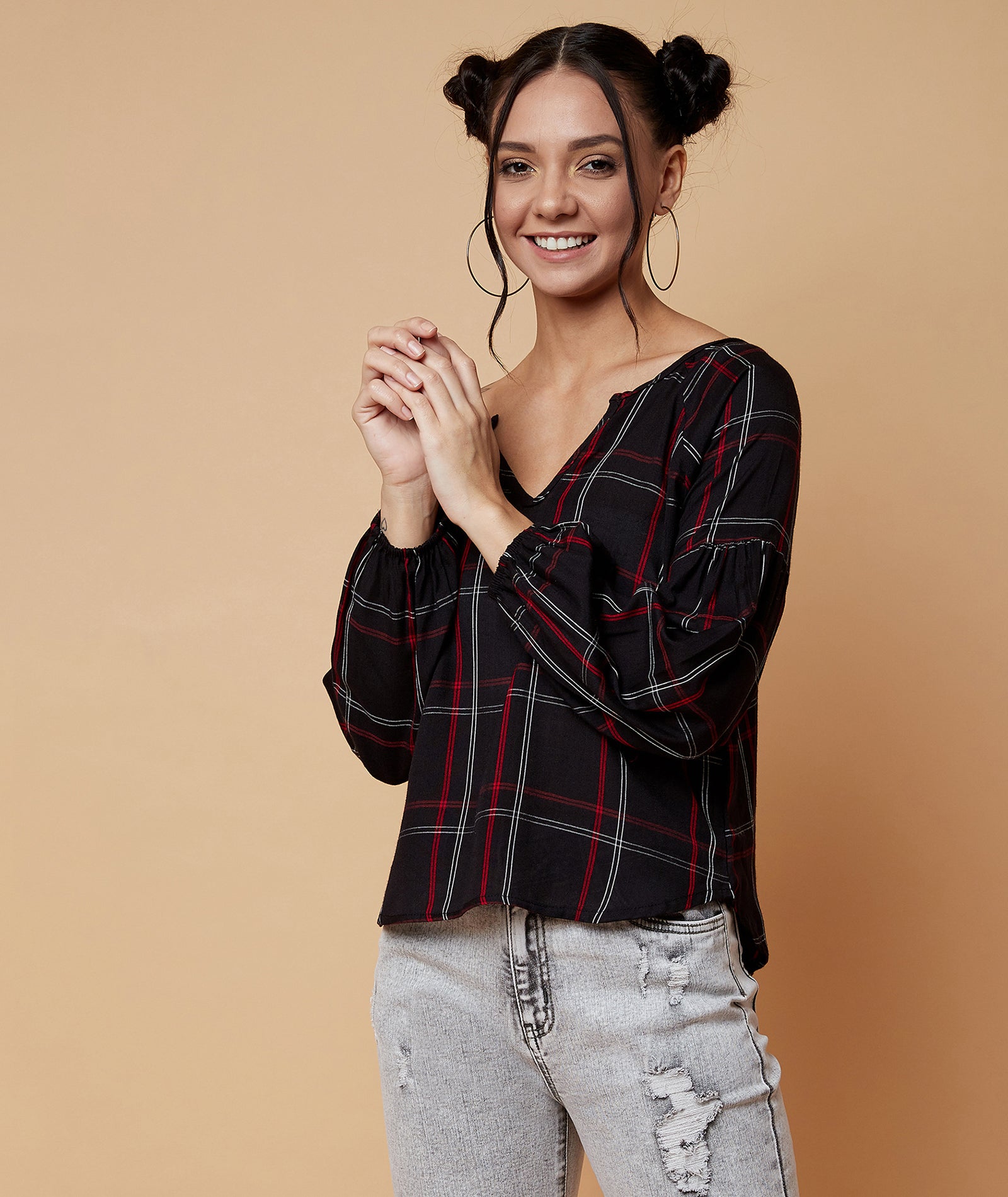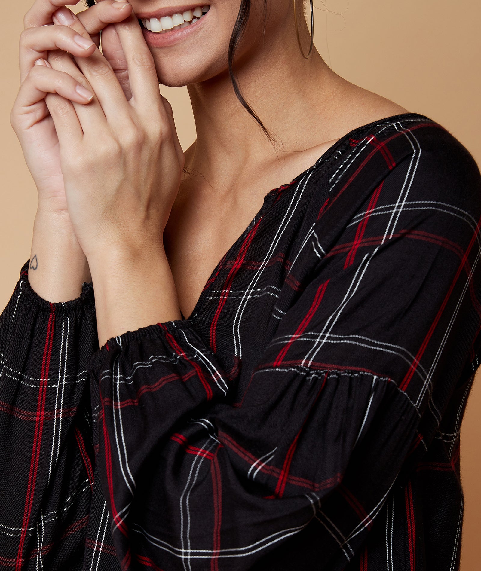 Chimpaaanzee Women Checkered Rangalan Sleeve Top Black & Red