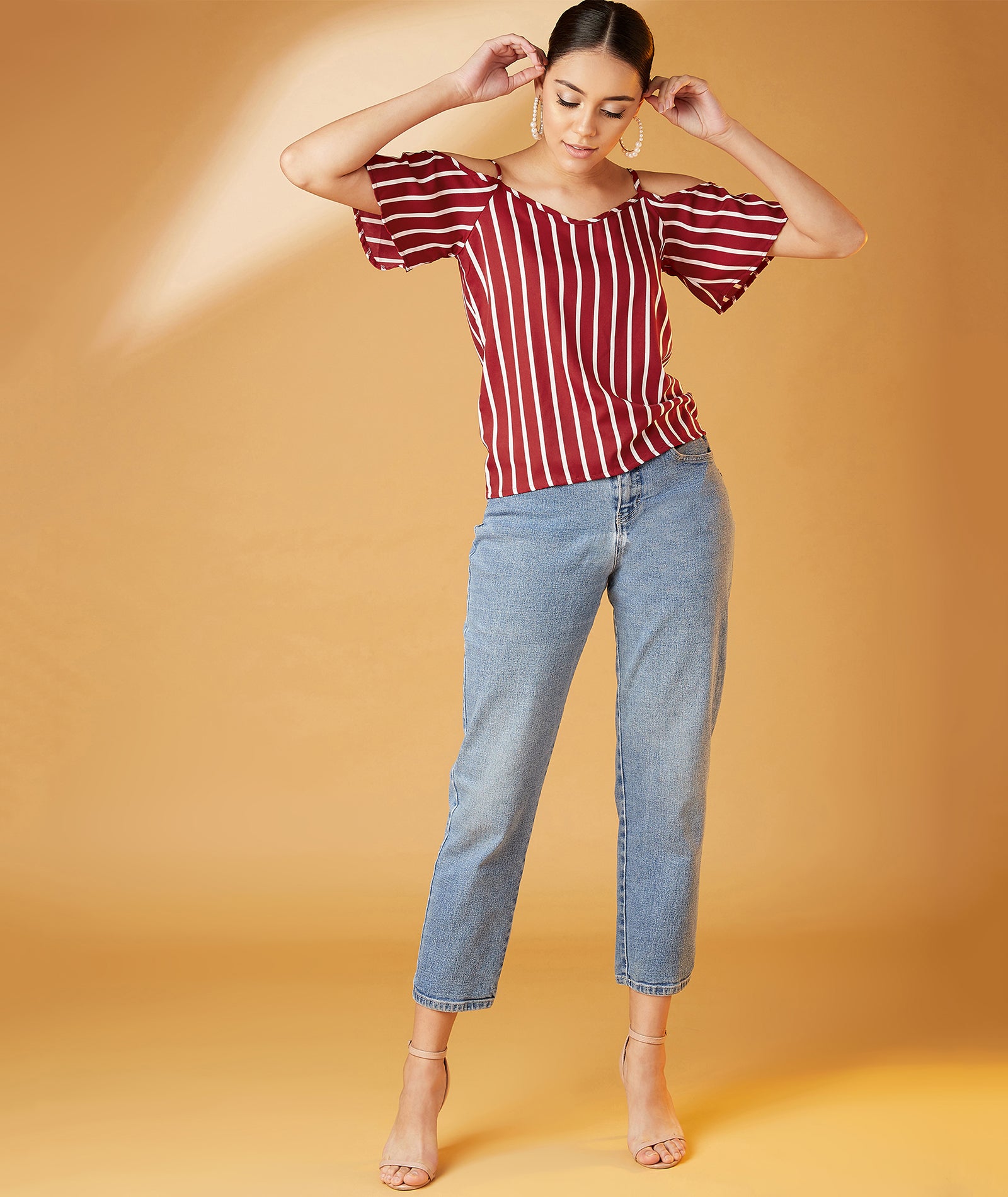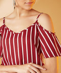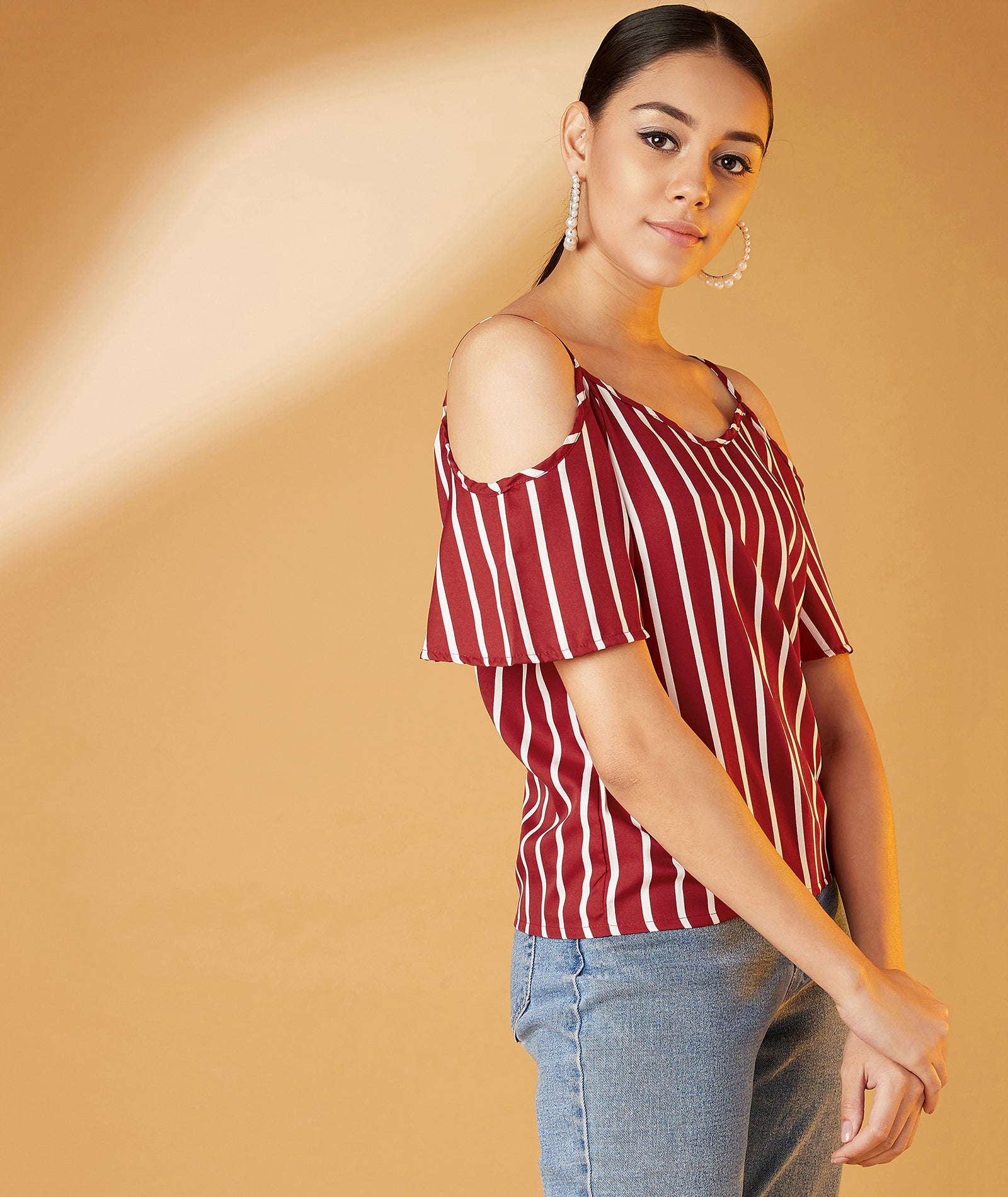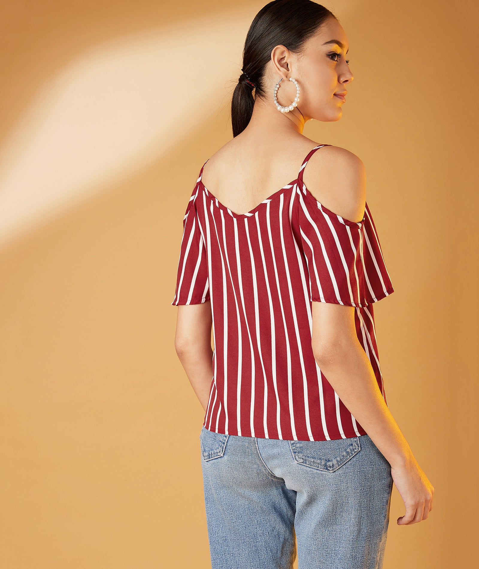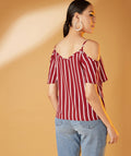 Chimpaaanzee Women Cold Shoulder Sleeve Striped Crepe Top