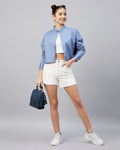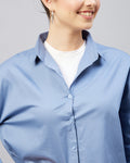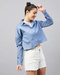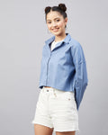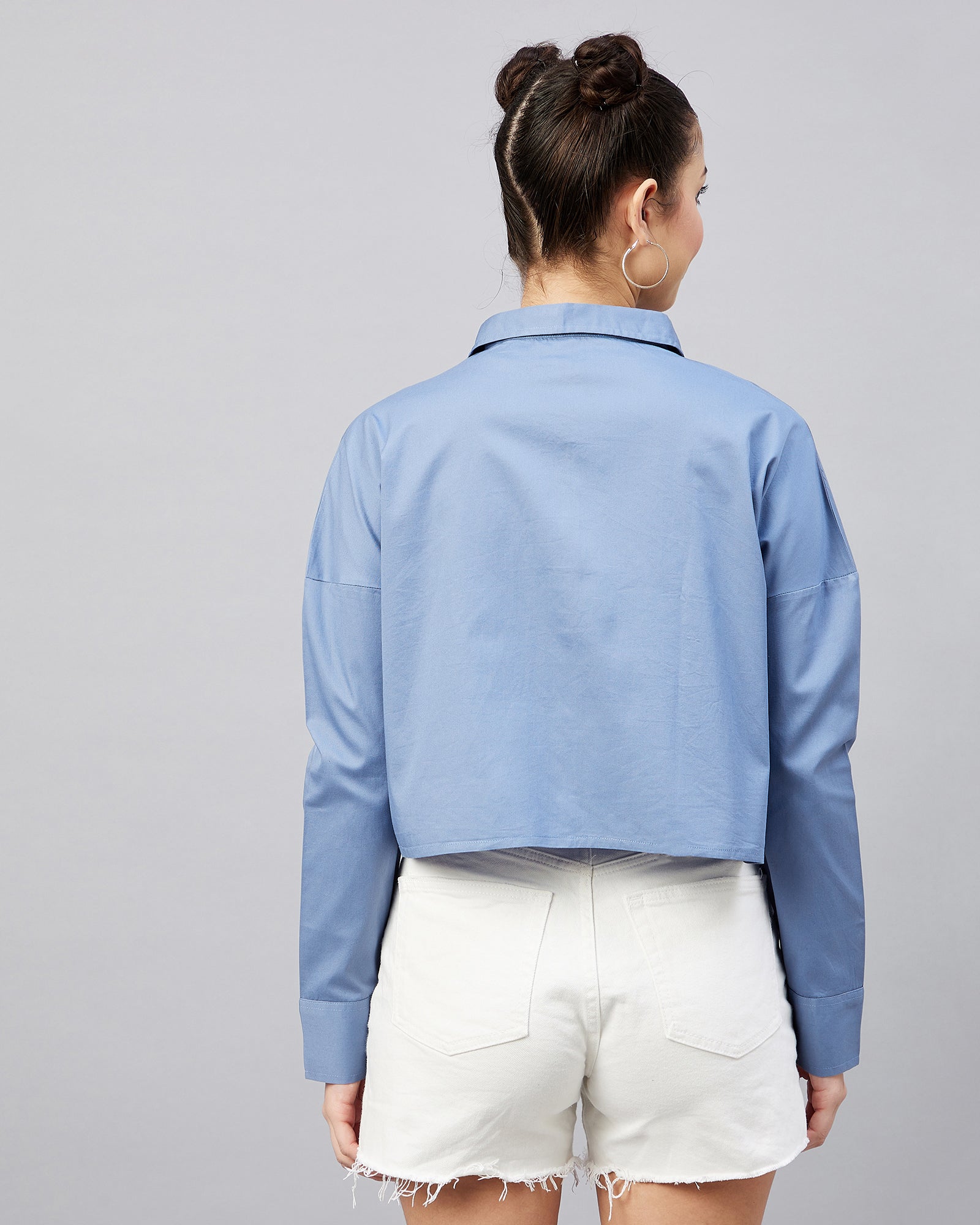 Chimpaaanzee Women Cotton Blue Solid Drop Shoulder Crop Shirt
