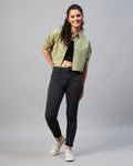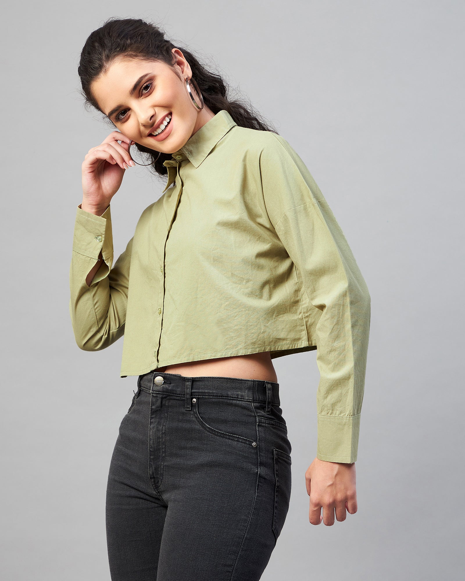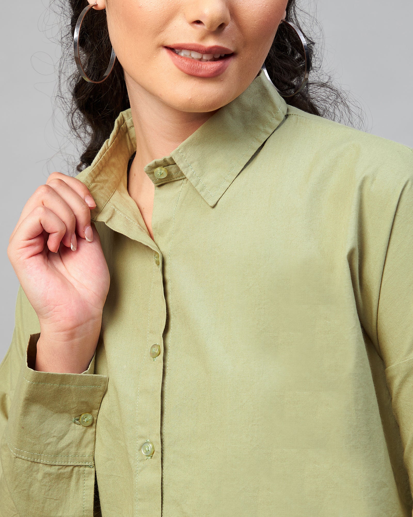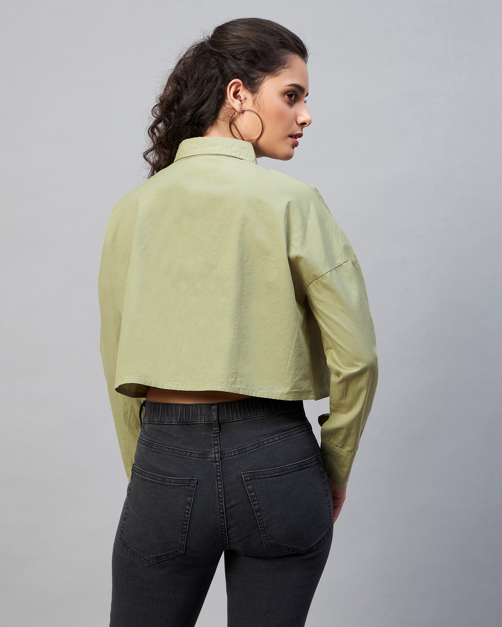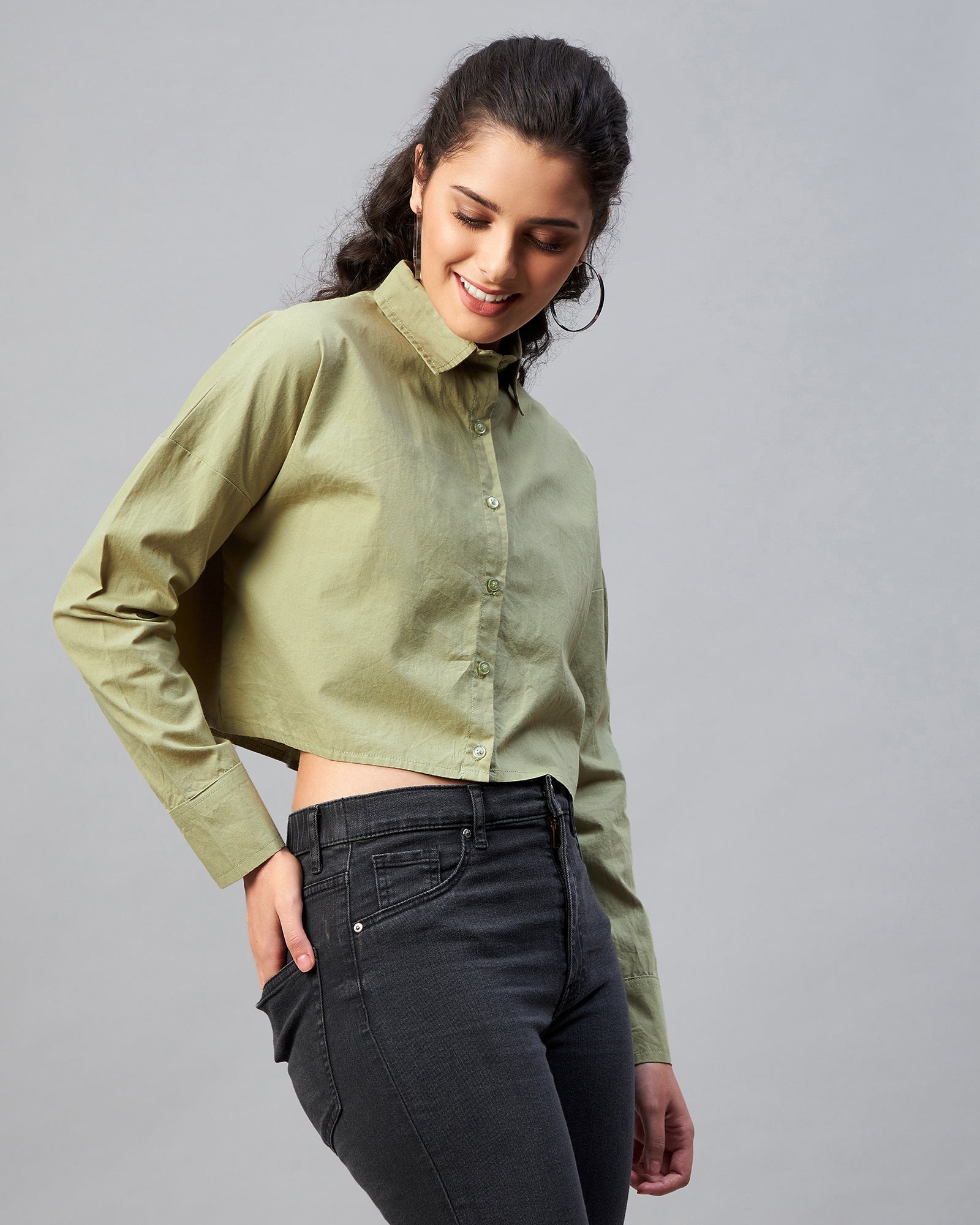 Chimpaaanzee Women Cotton Green Solid Full Sleeve Drop Shoulder Crop Shirt