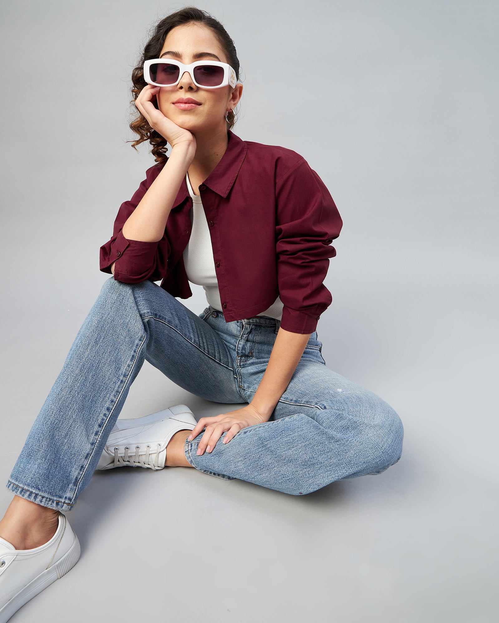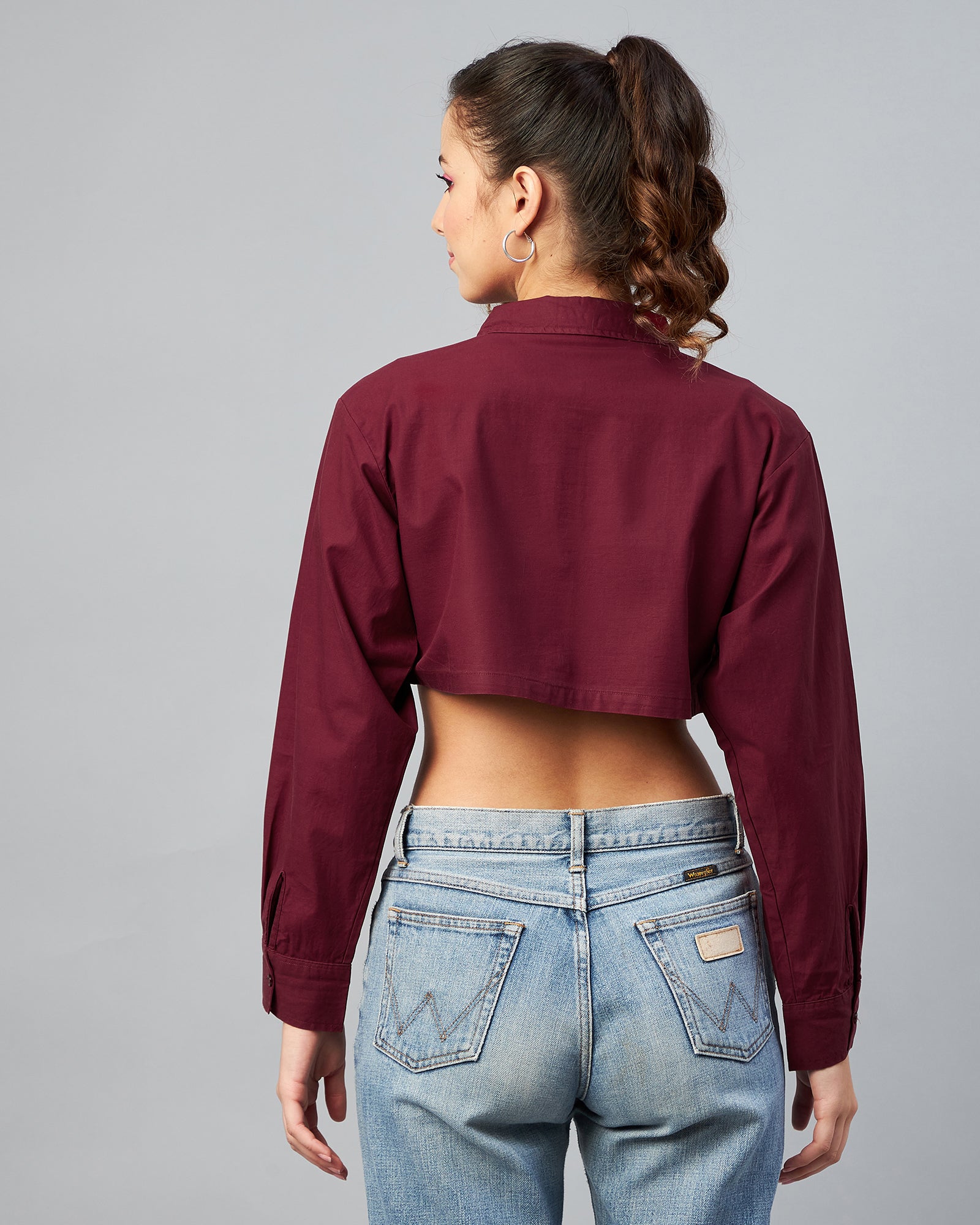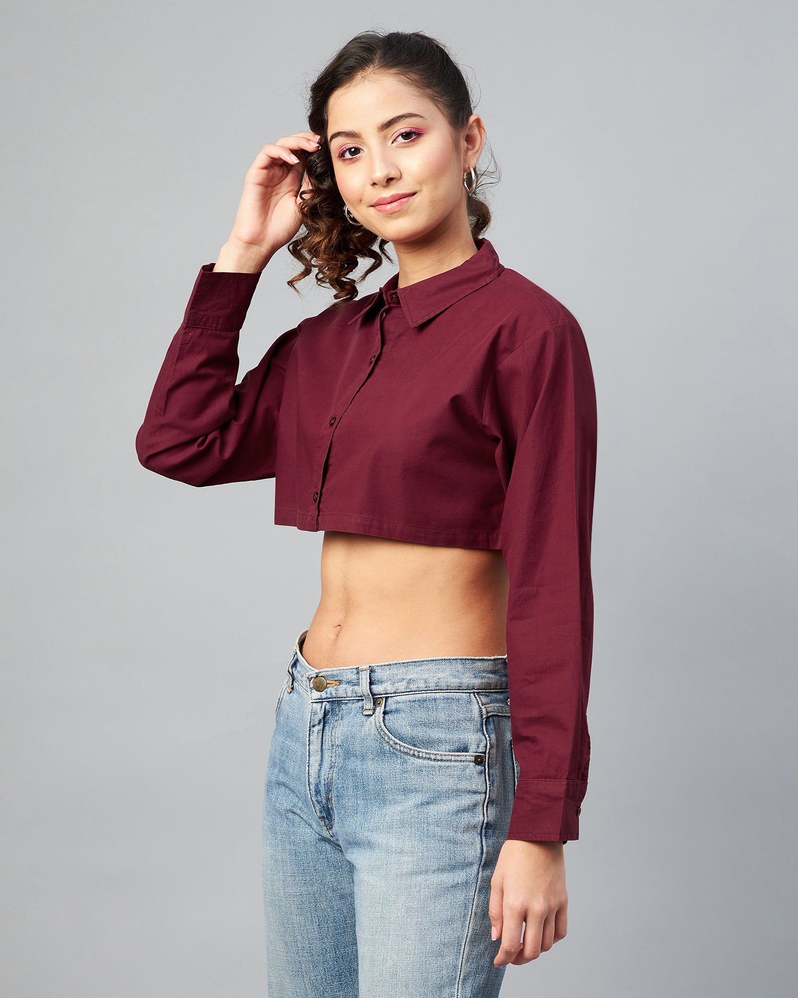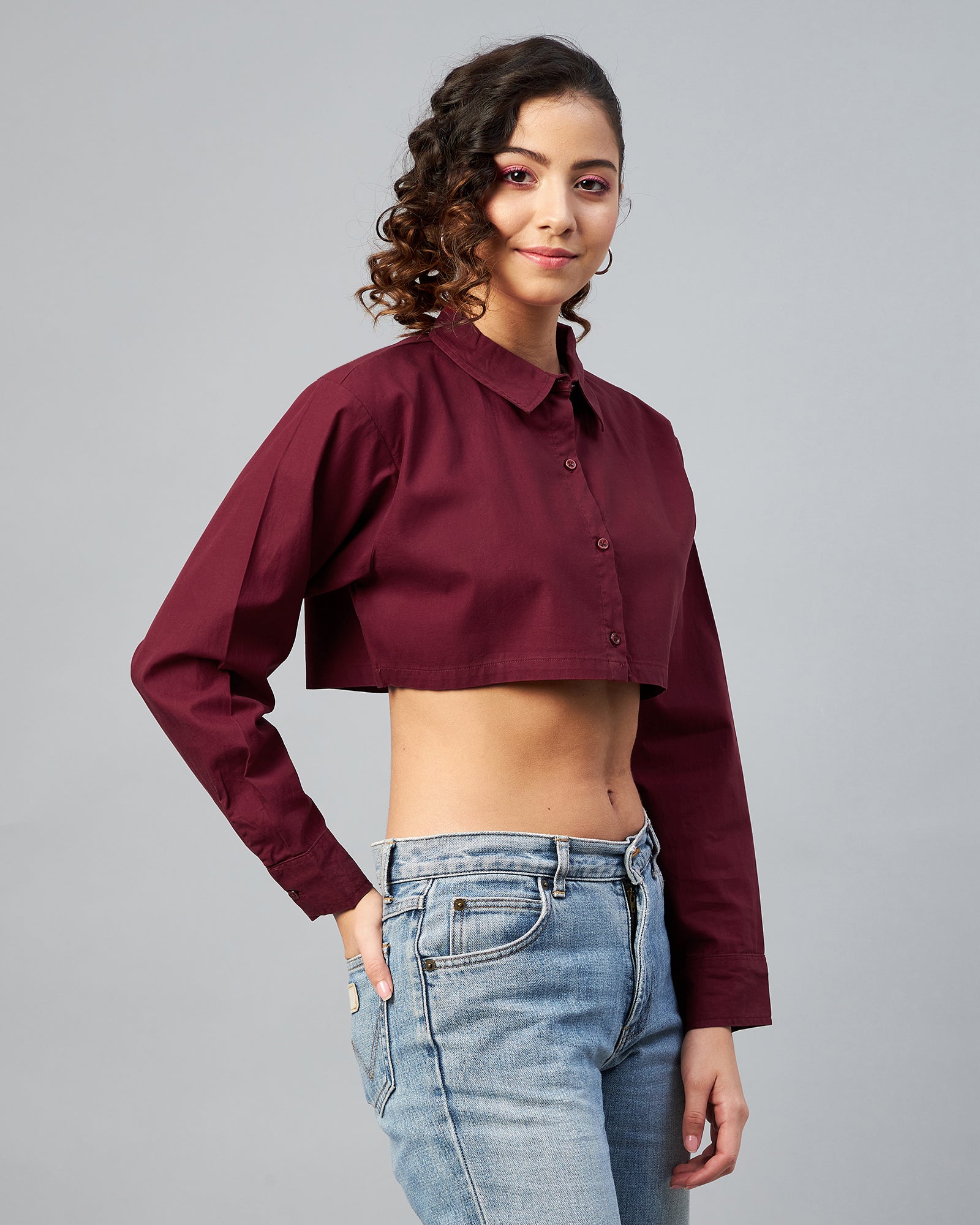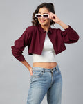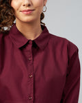Chimpaaanzee Women Cotton Maroon Solid Fully Cropped Shirt