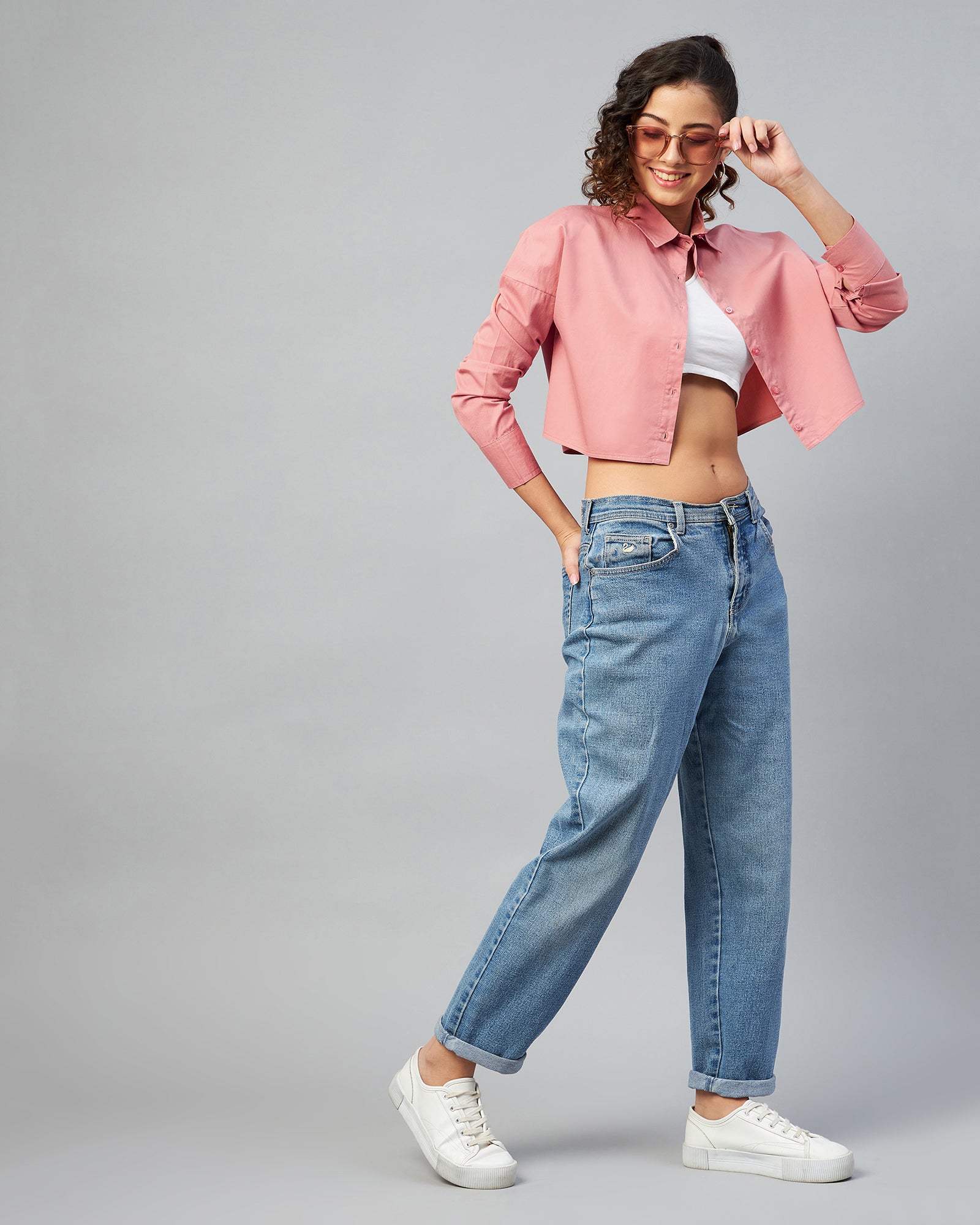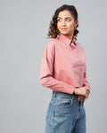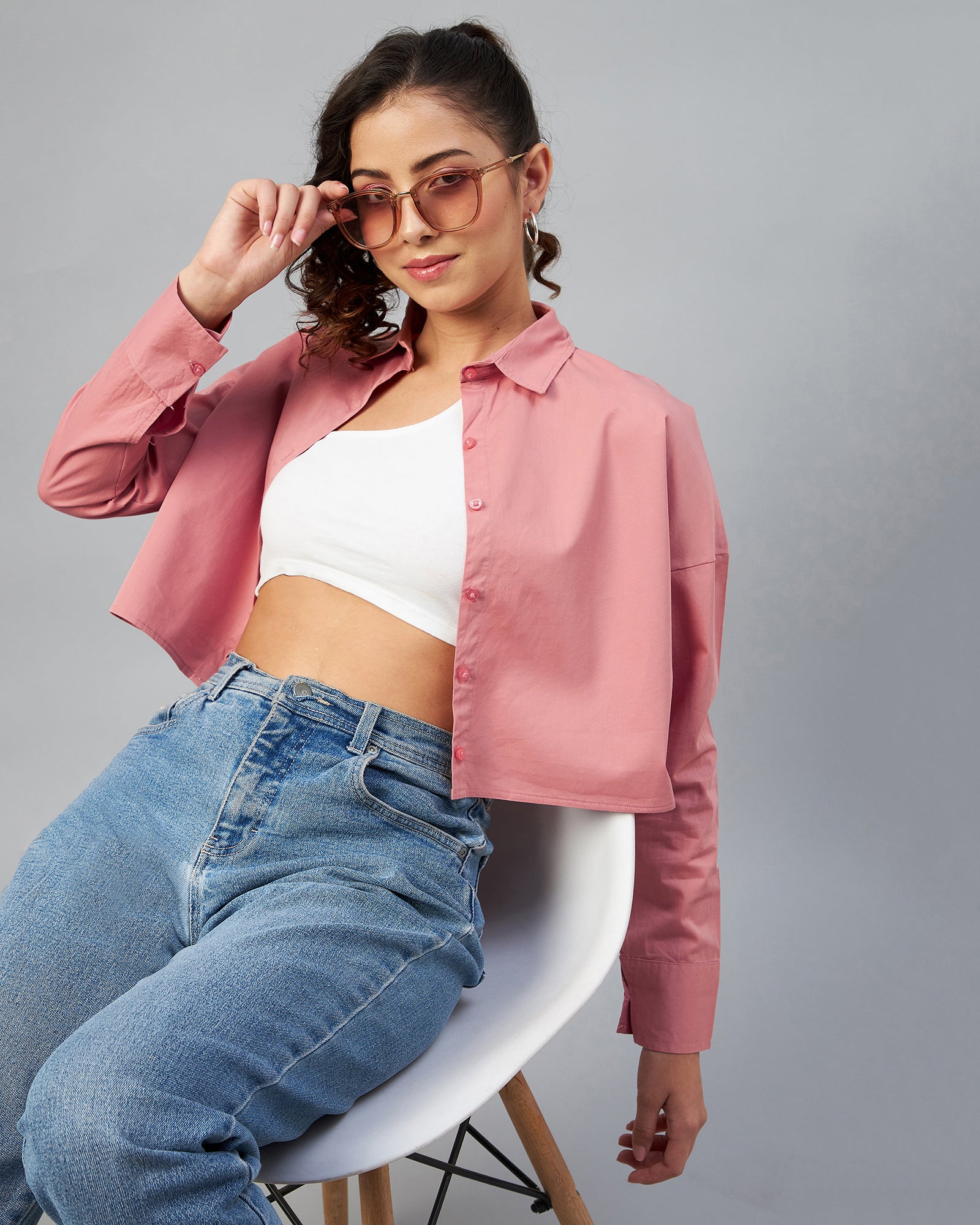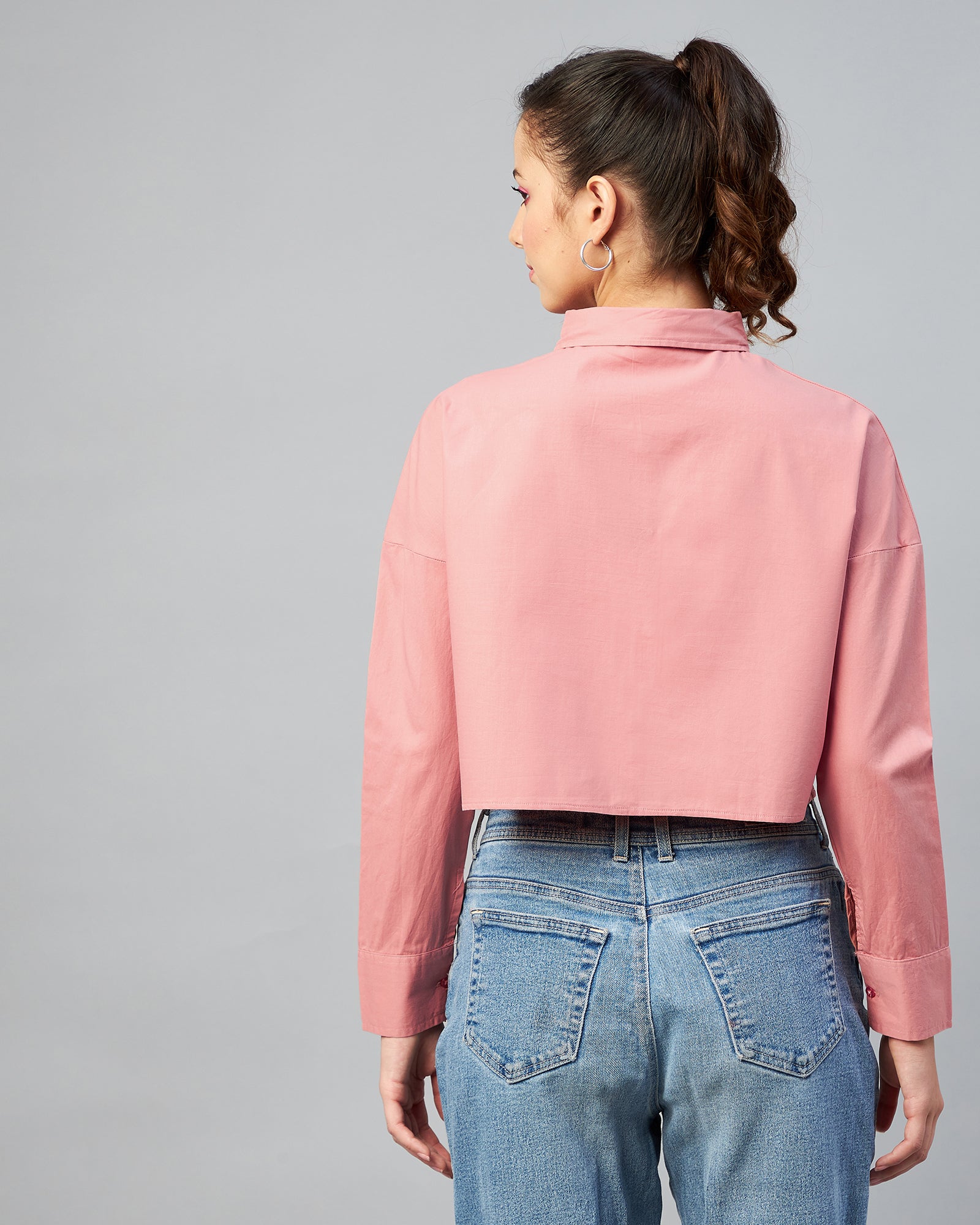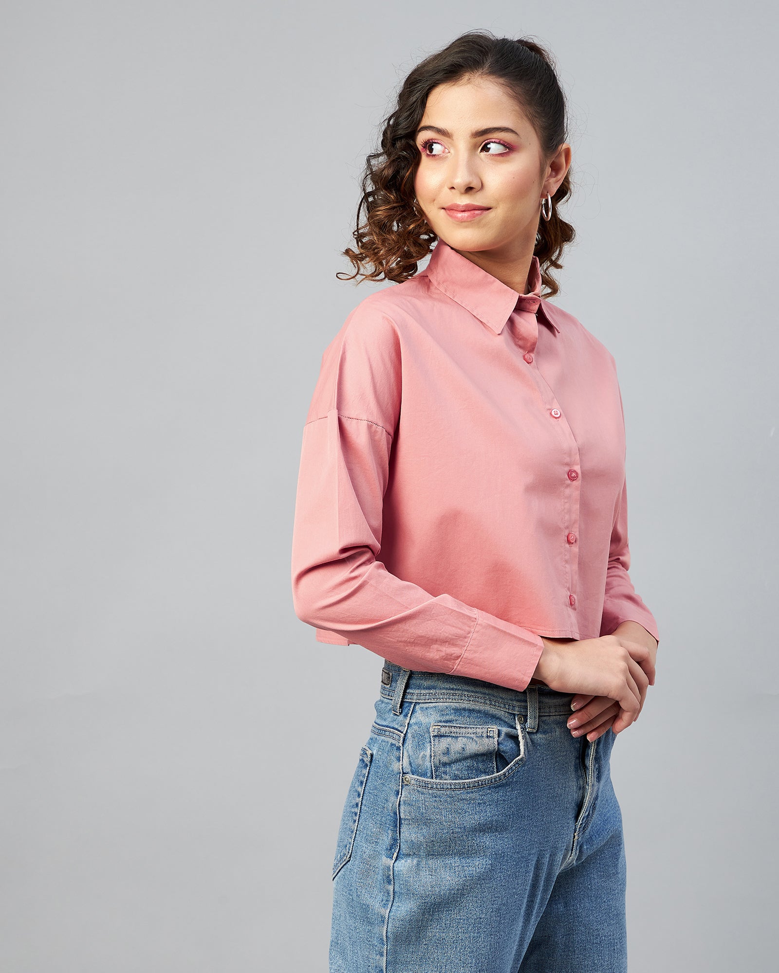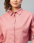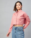 Chimpaaanzee Women Cotton Pink Solid Full Sleeve Drop Shoulder Crop Shirt
