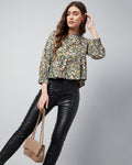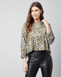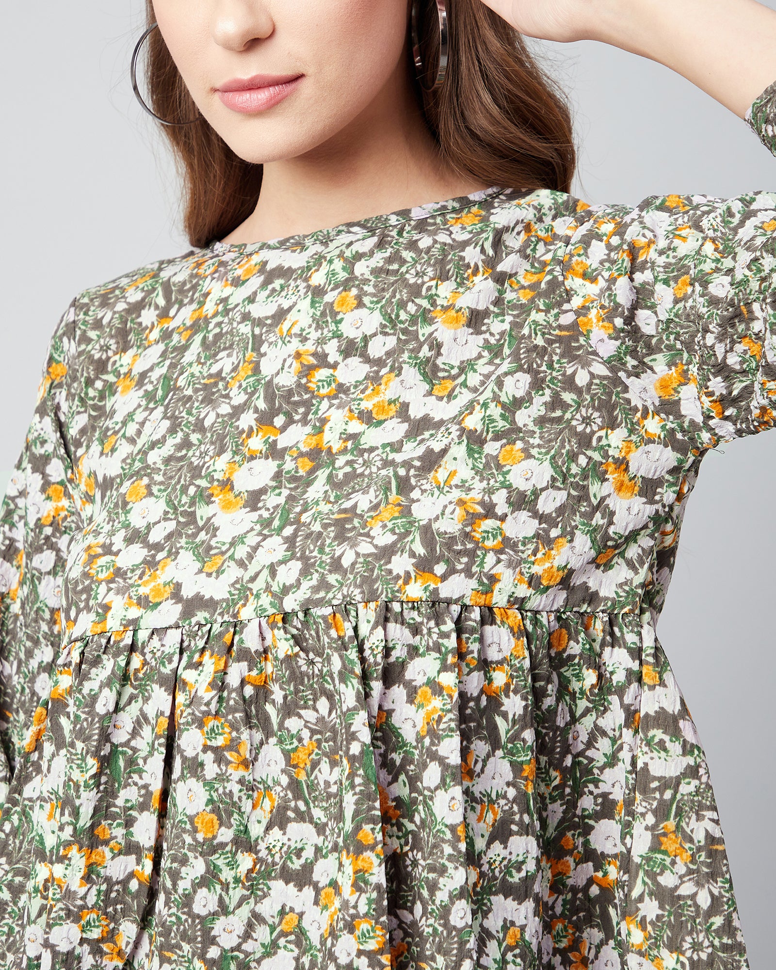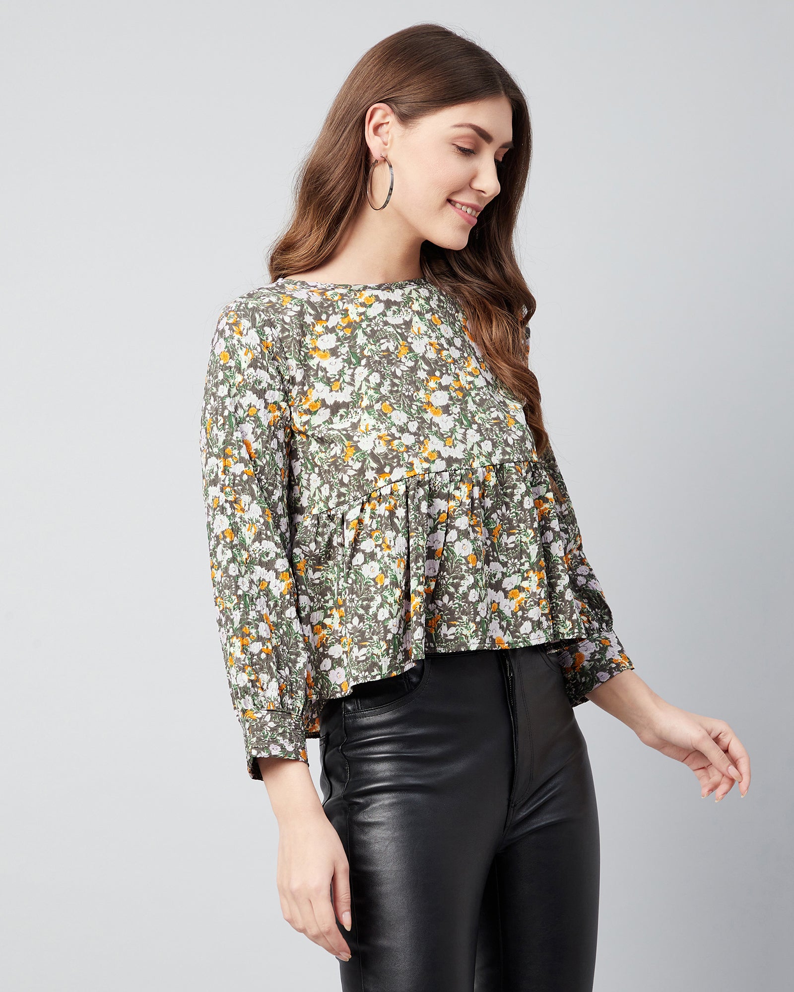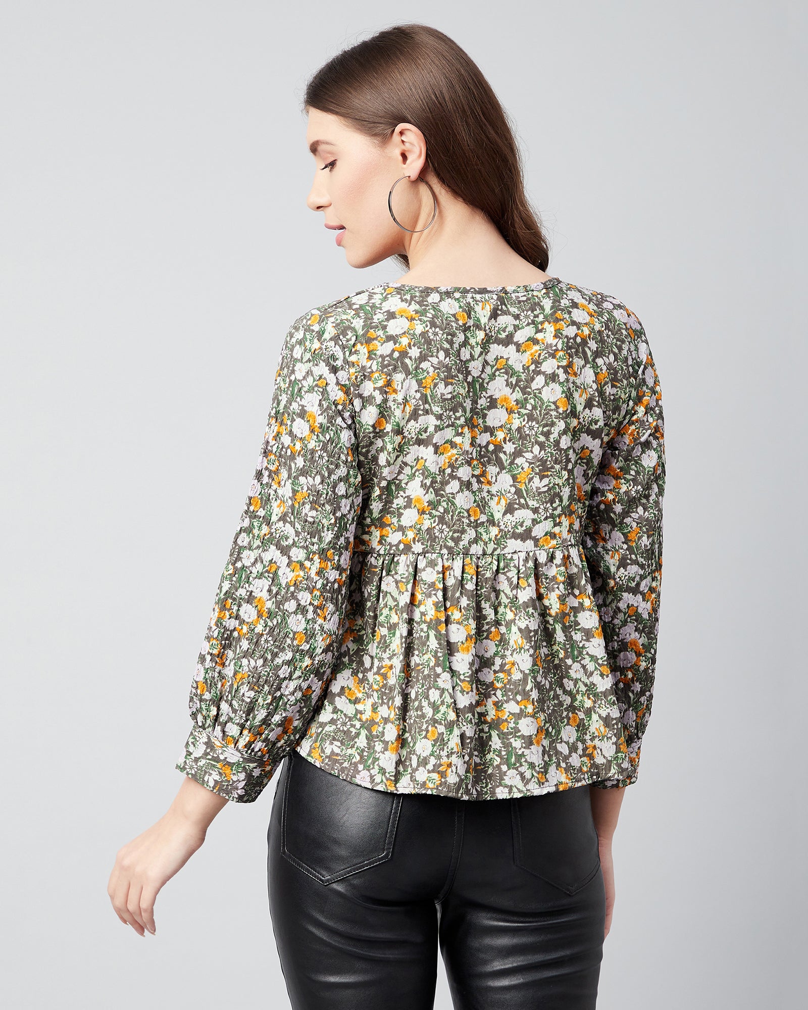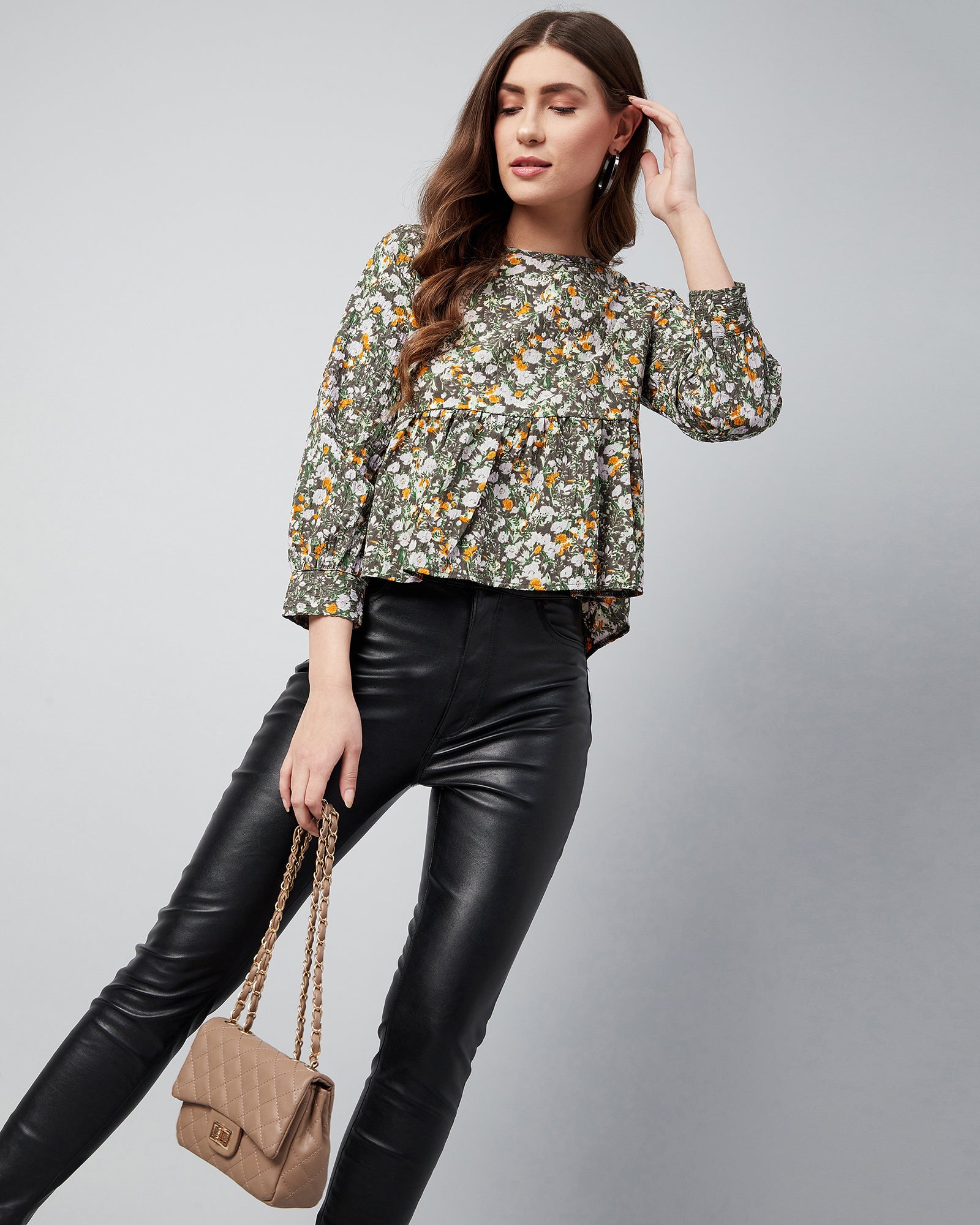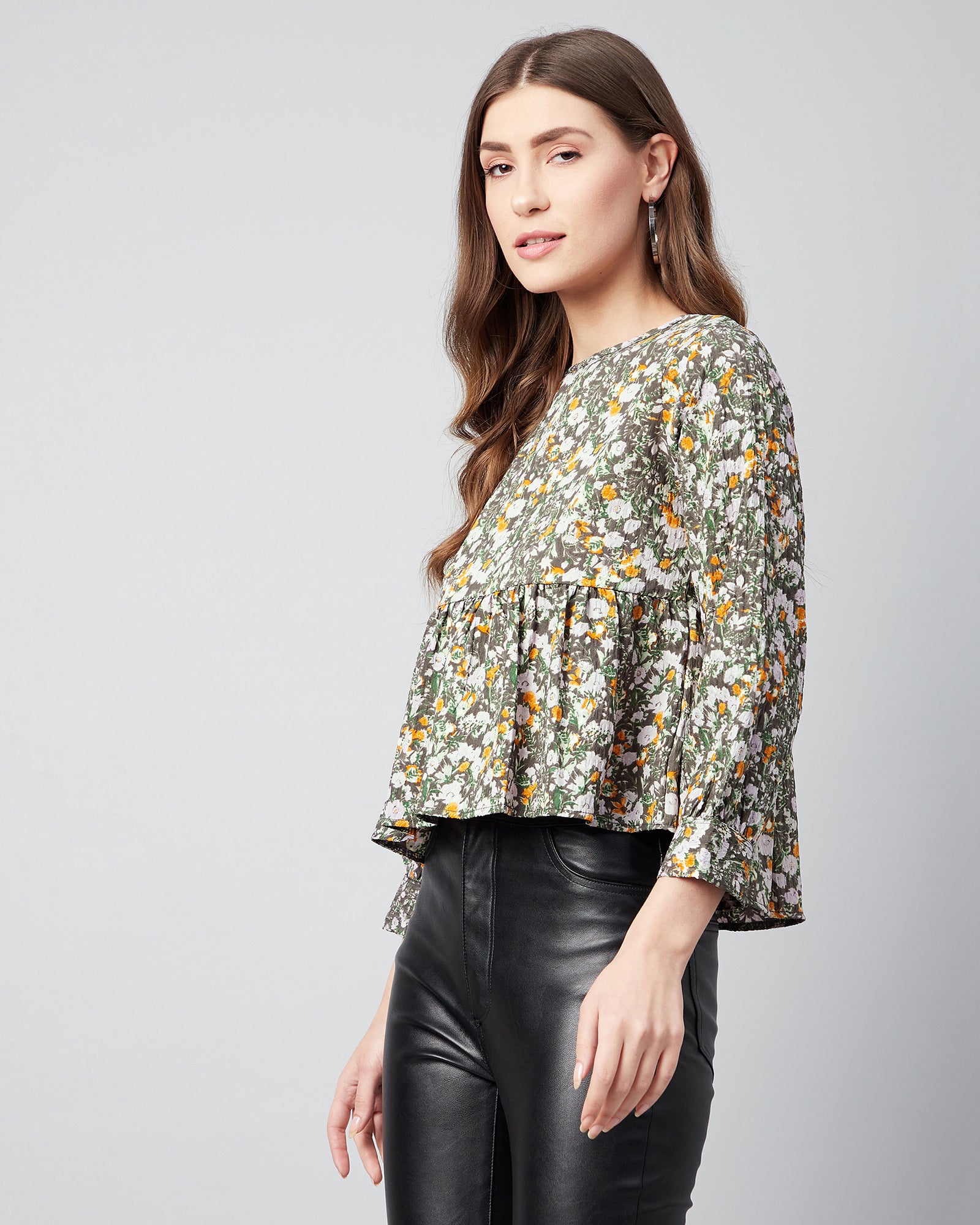Chimpaaanzee Women Crepe Grey Flower Printed Full Sleeve Ruffled Top