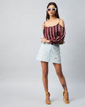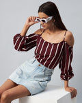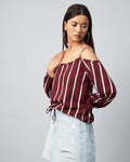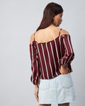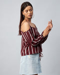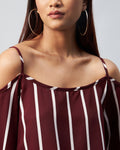 Chimpaaanzee Women Crepe Maroon & White Striped Cold Shoulder Top