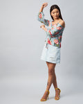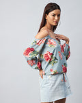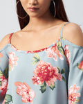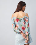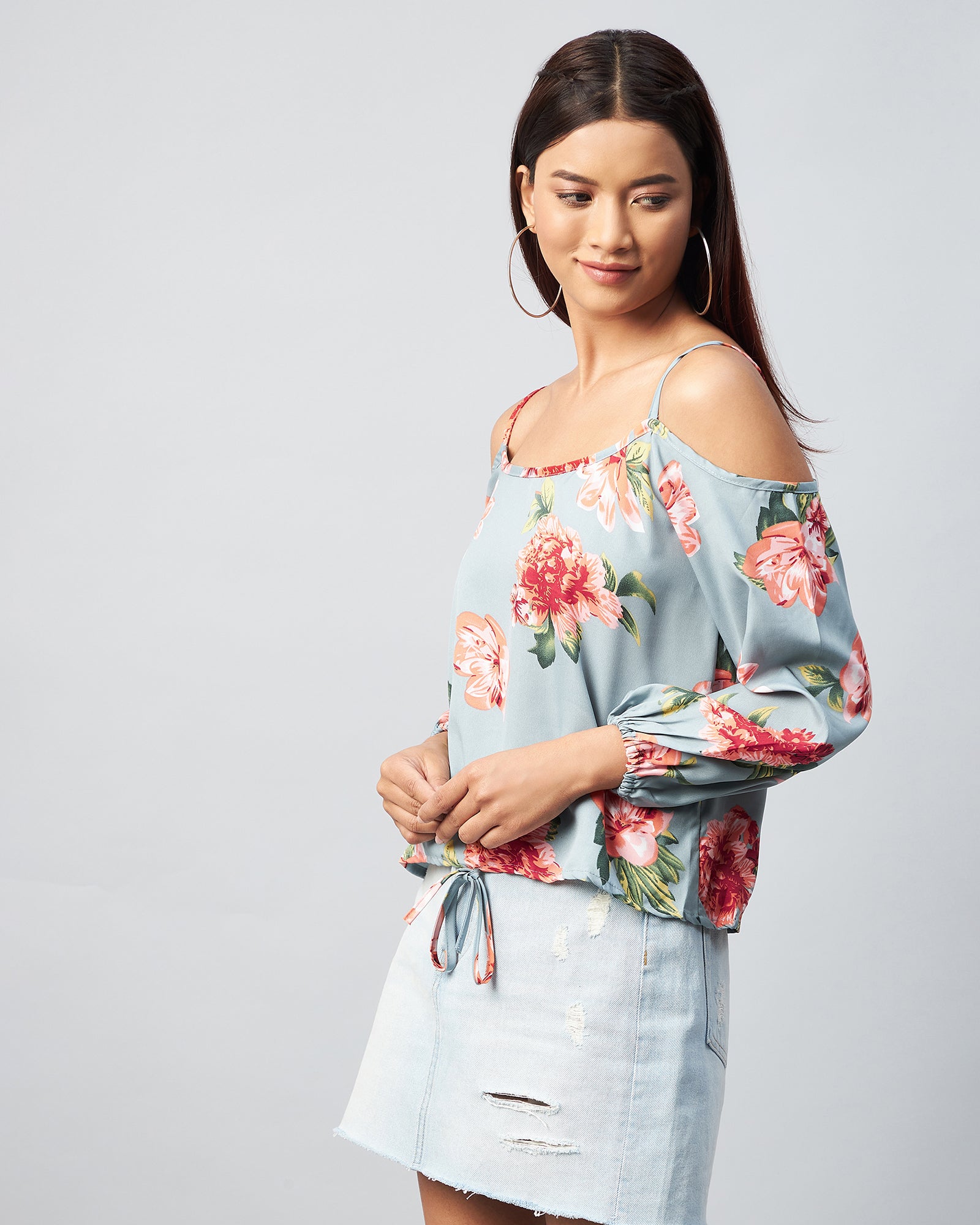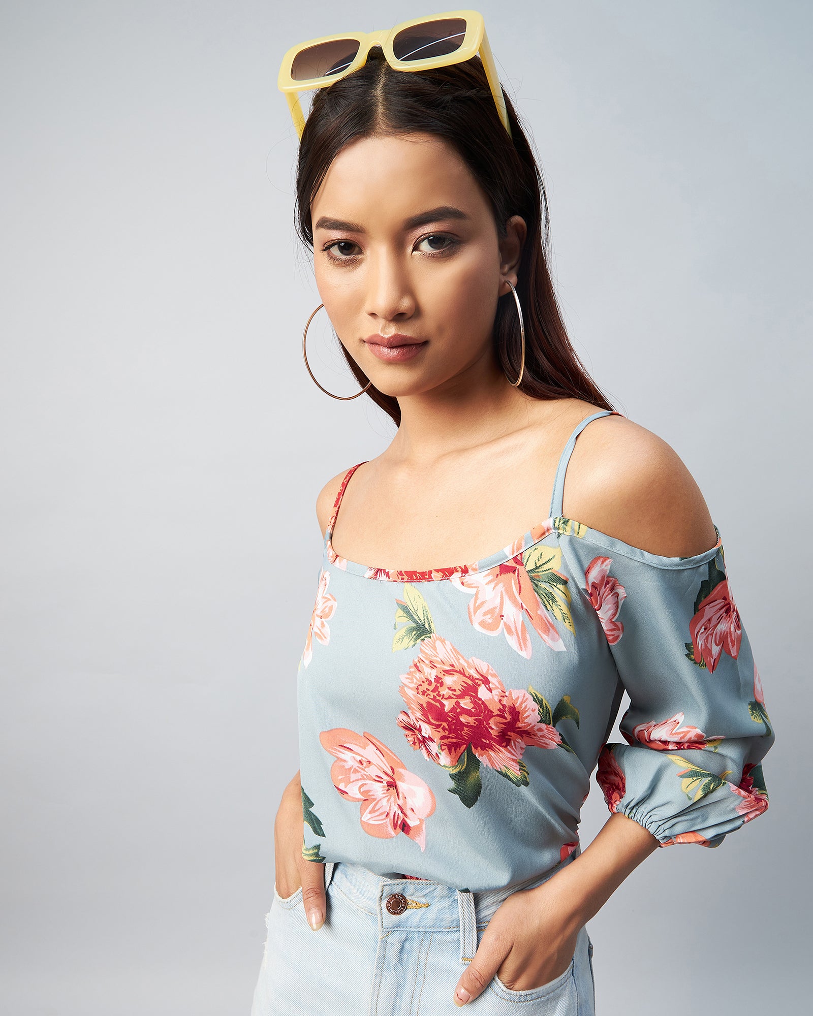 Chimpaaanzee Women Crepe Skyblue Flower Printed Cold Shoulder Top