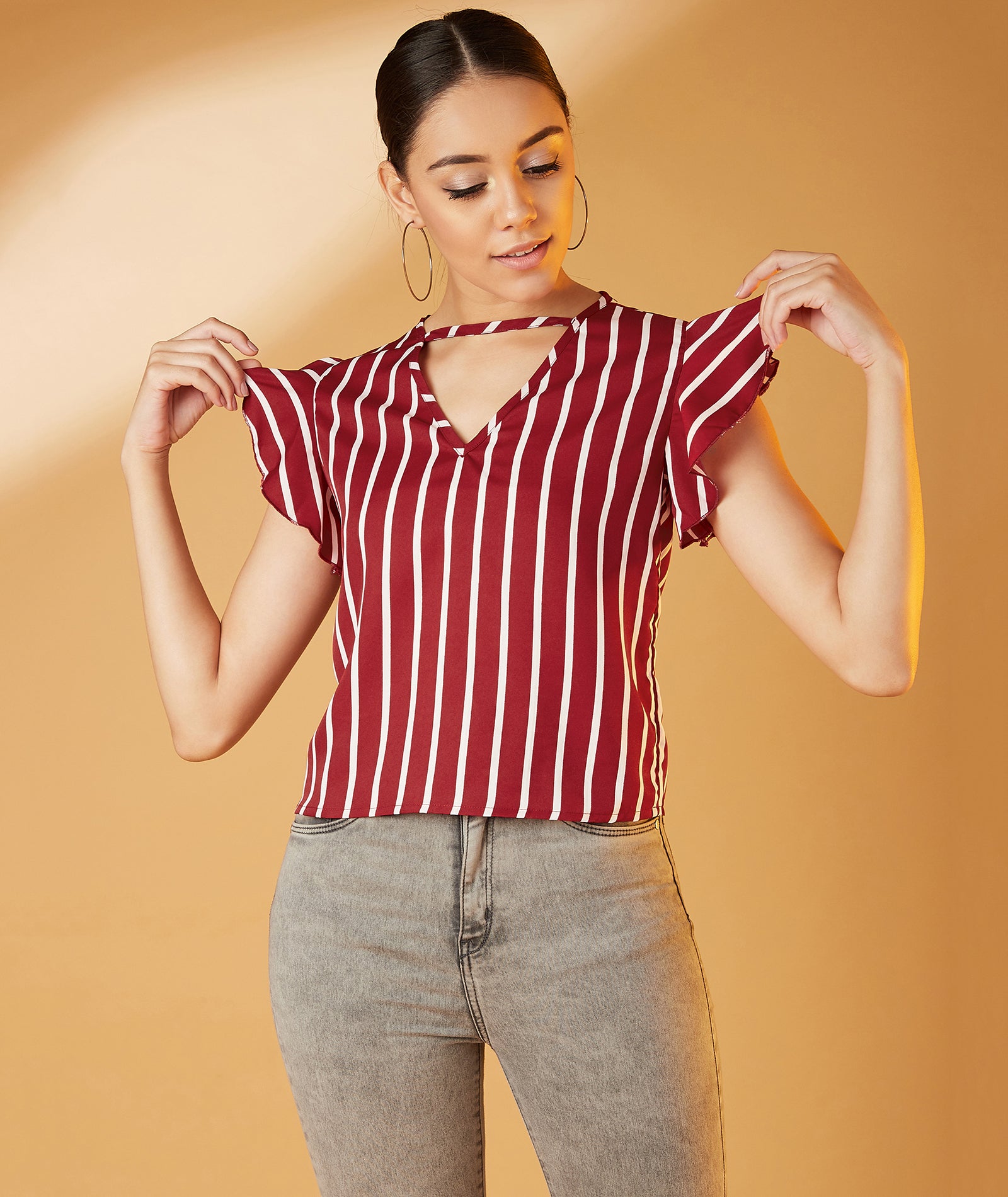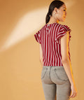 Chimpaaanzee Women Ruffled Sleeve Striped Crepe Top