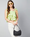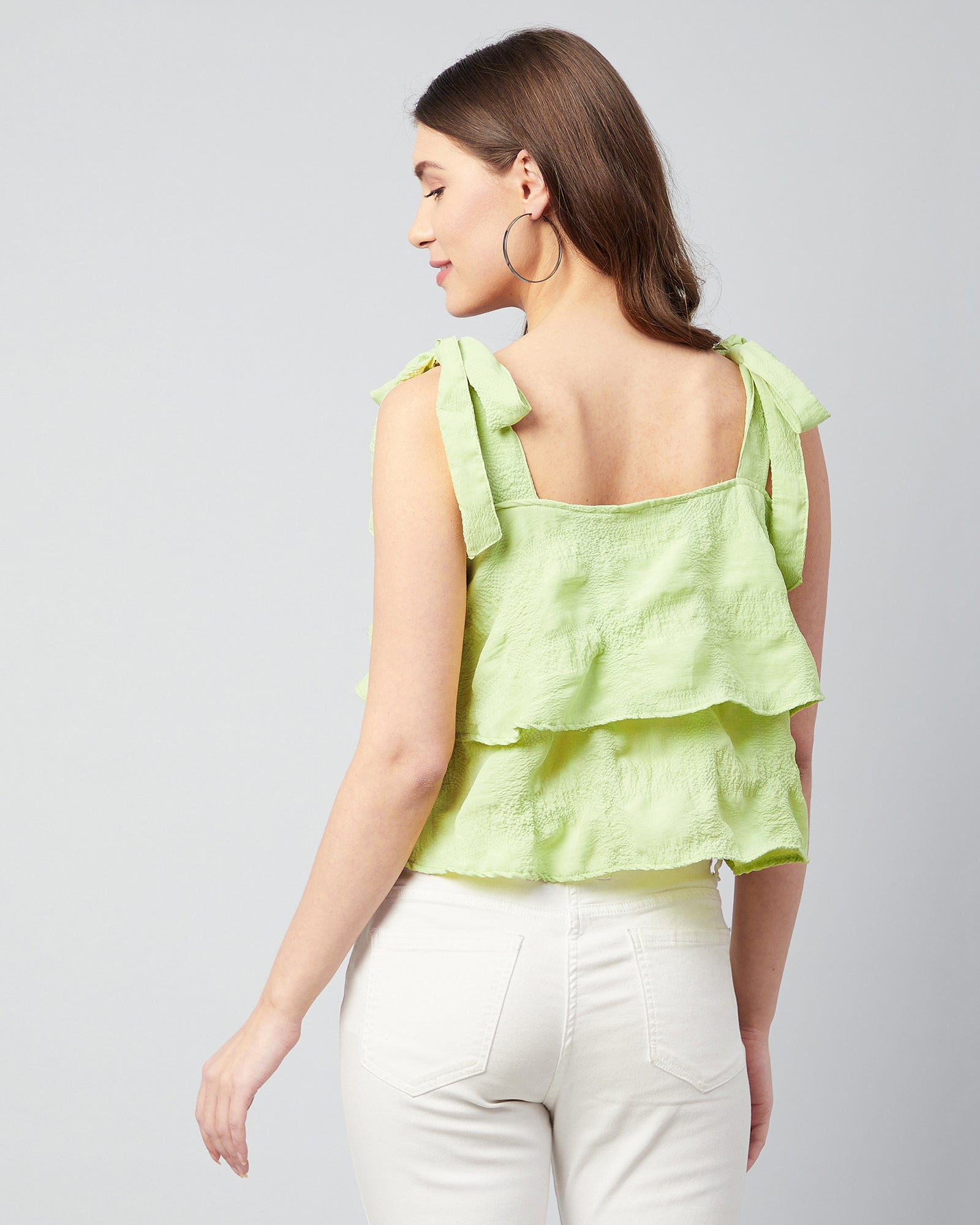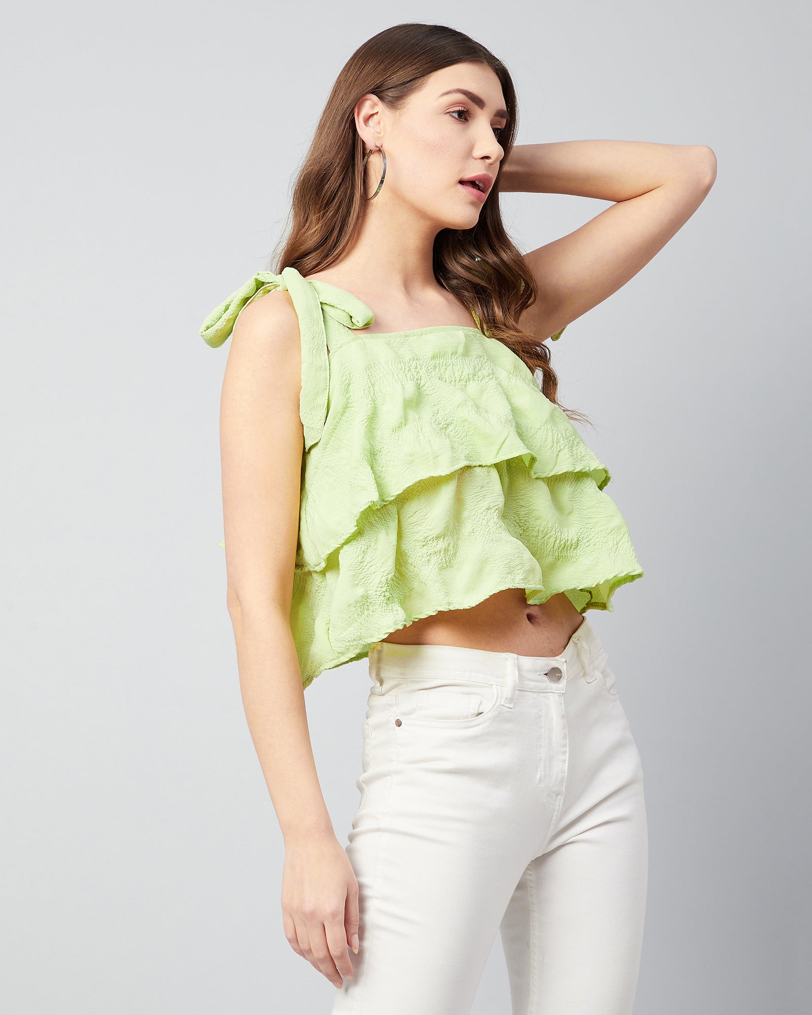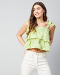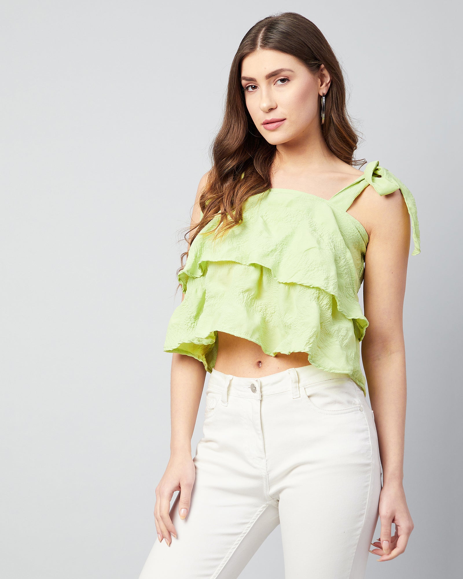 Chimpaaanzee Women Green Double Layered Shoulder Knoted Crop Top