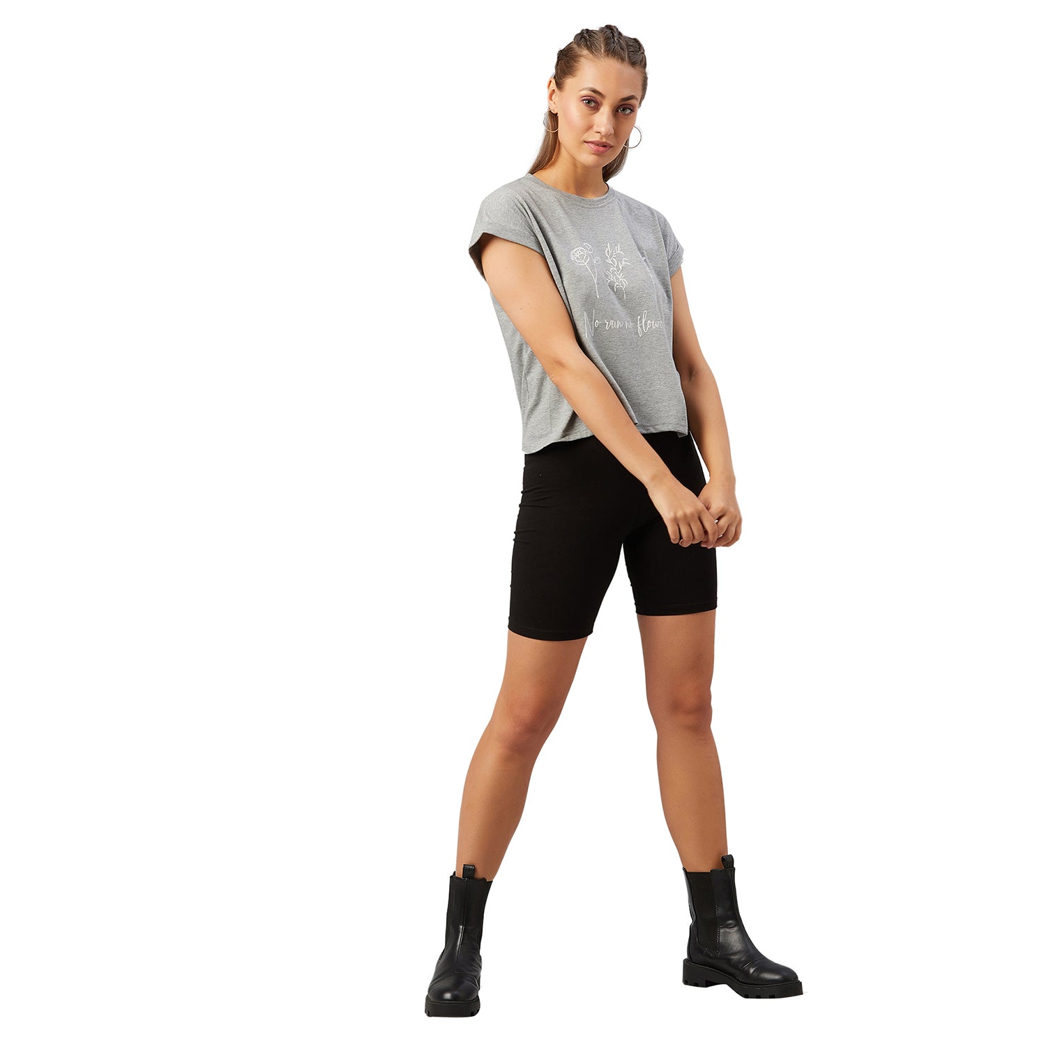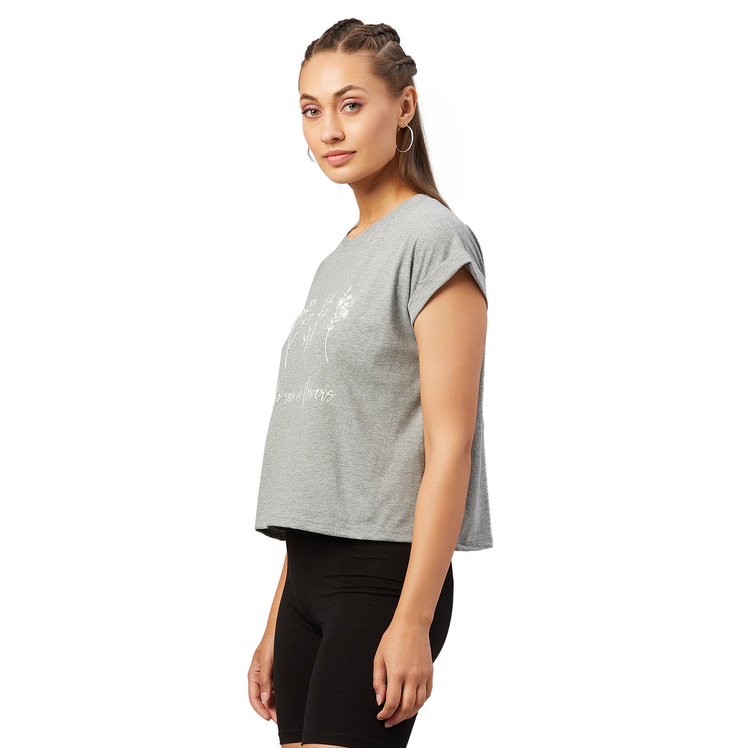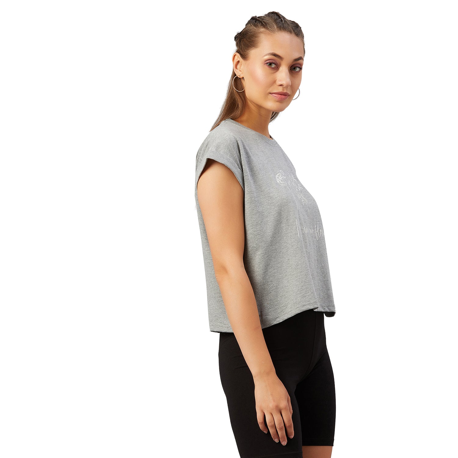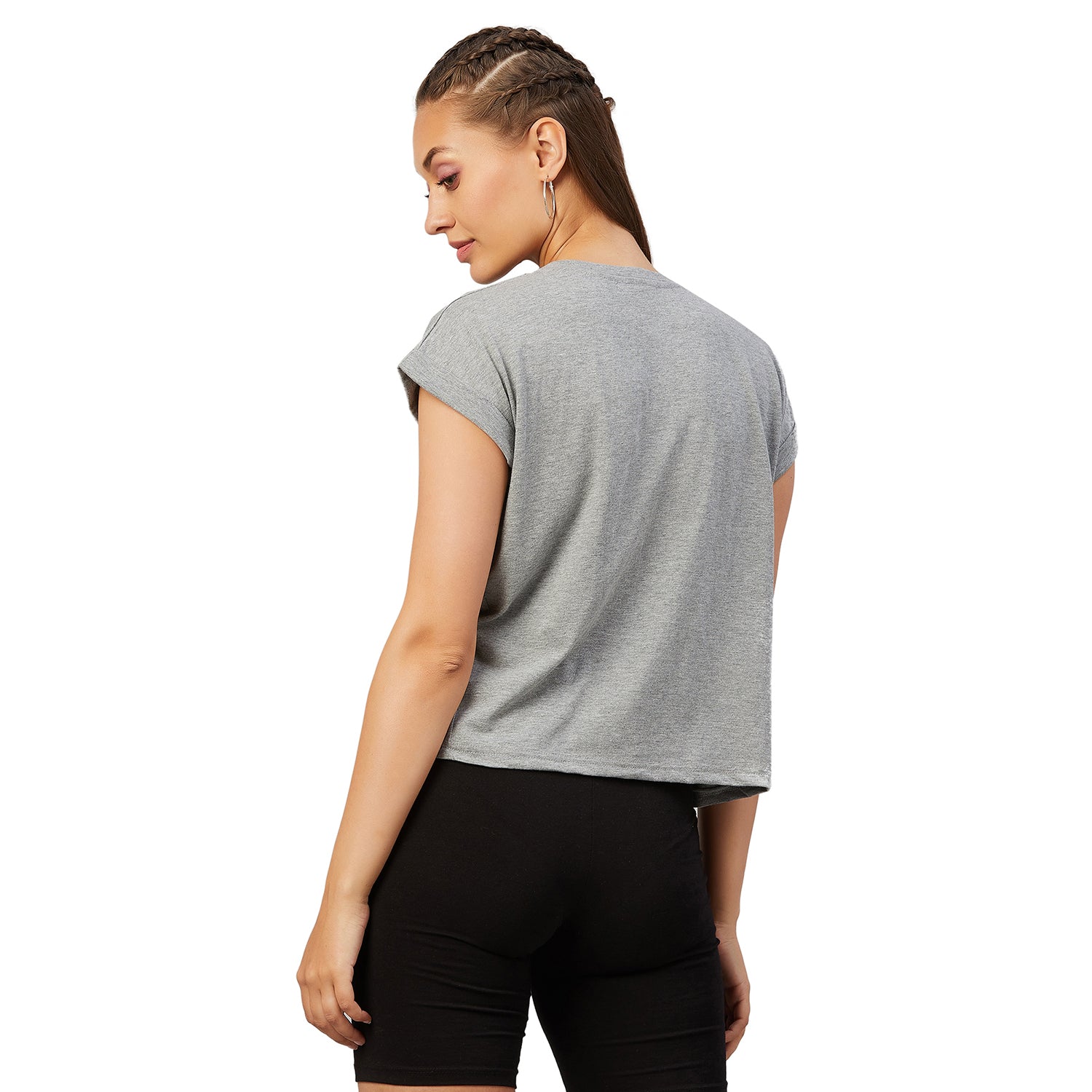 Chimpaaanzee Women Grey Folded Sleeve Round Neck T-shirt