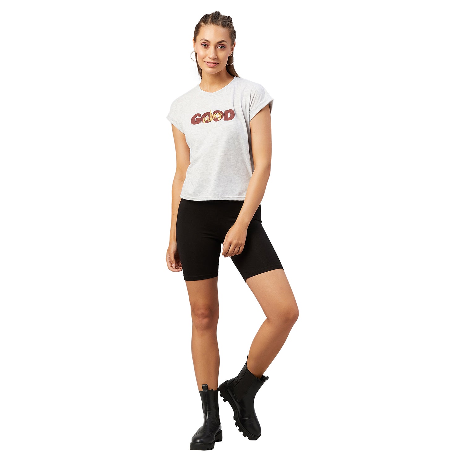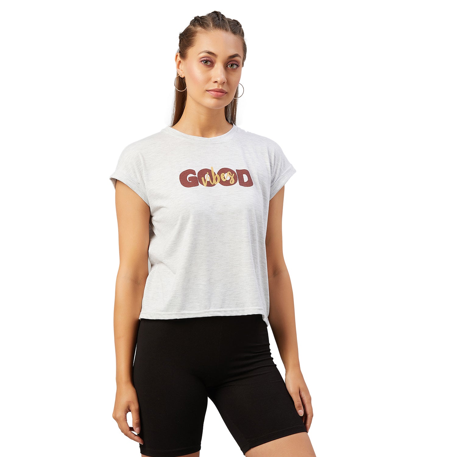 Chimpaaanzee Women Light Grey Folded Sleeve Round Neck T-shirt
