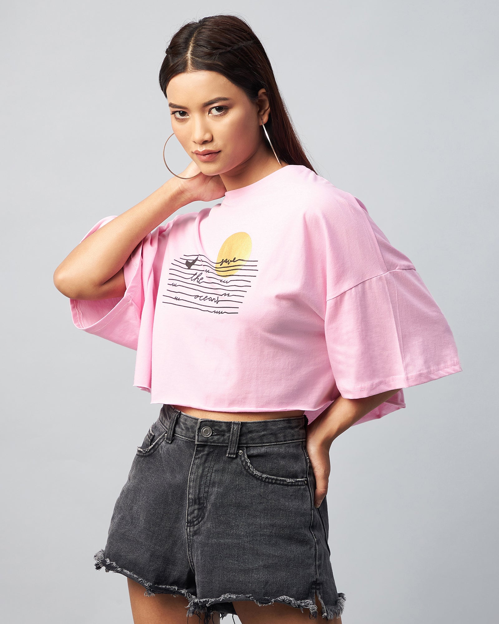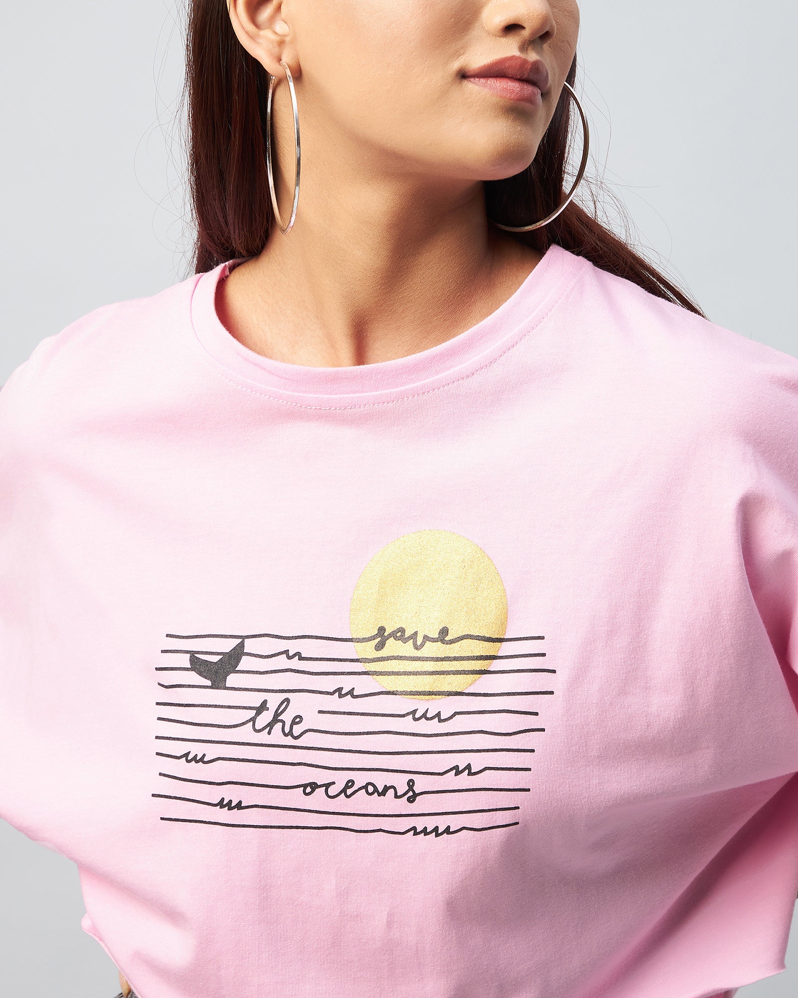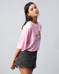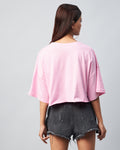Chimpaaanzee Women Light Pink Solid Oversized Crop T-shirt